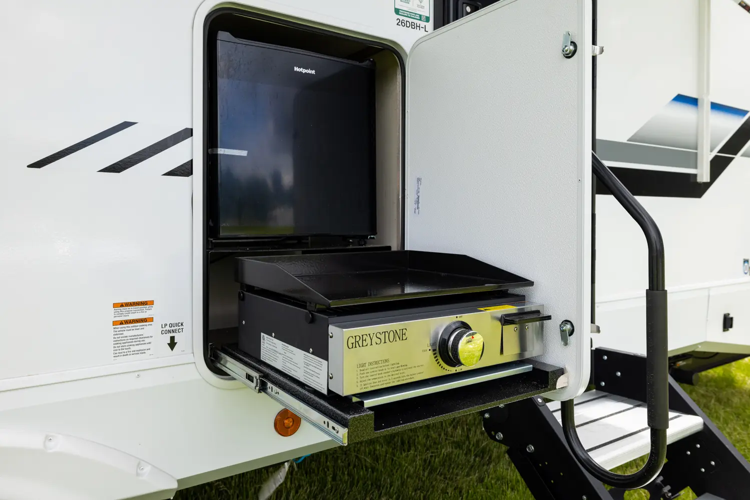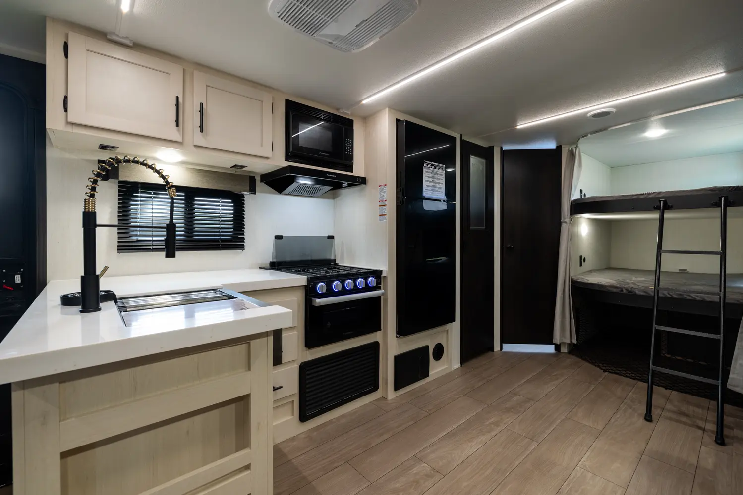 Looking for a lightweight and affordable option for your family? The Alpha Wolf 26DBH by Forest River may be the perfect fit with a smartly designed bunkhouse floorplan. Featured in the rear are double stacked bunk beds and a full bathroom with an entry/exit door. The kitchen is well equipped with a full-size pantry, 12-volt refrigerator, farm style sink, oven and a microwave. The-U-shape dinette and living room sofa both double as extra sleeping when not in use. Up front is a queen size bed.