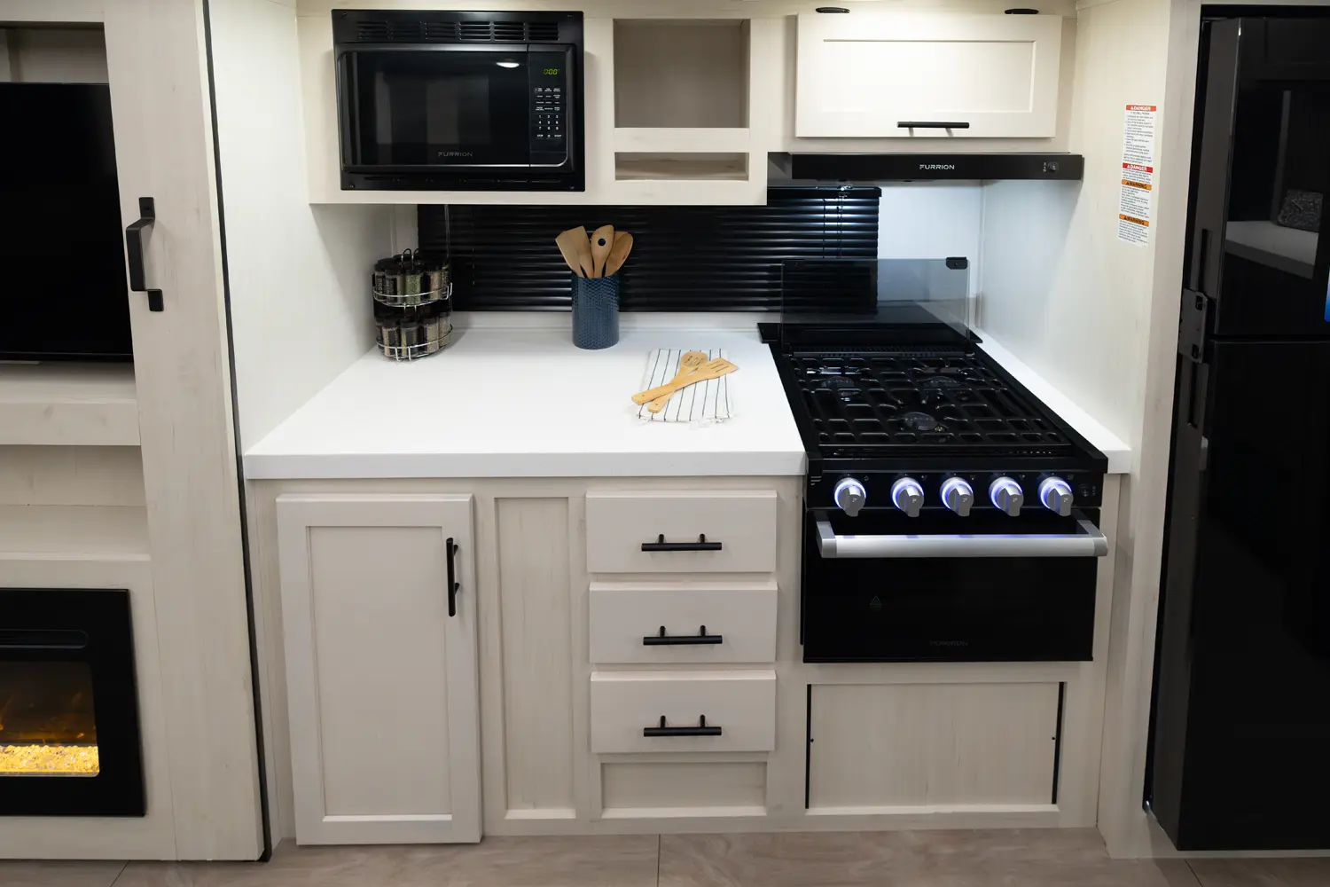 The Alpha Wolf 26RL by Forest River takes a popular 5th wheel design and brings it into a smaller form factor! Stretch out and relax with a queen size bed and ample wardrobe space in the bedroom. The spacious living area features oversized windows, perfect for enjoying the scenery. A beautiful island highlights the kitchen along with a 12-volt refrigerator, oven, microwave and built-in trash can. Easy to tow and perfect for your next adventure!