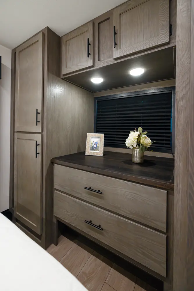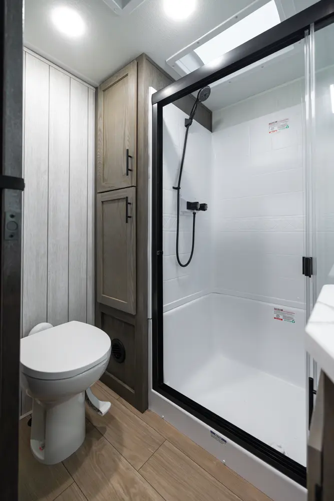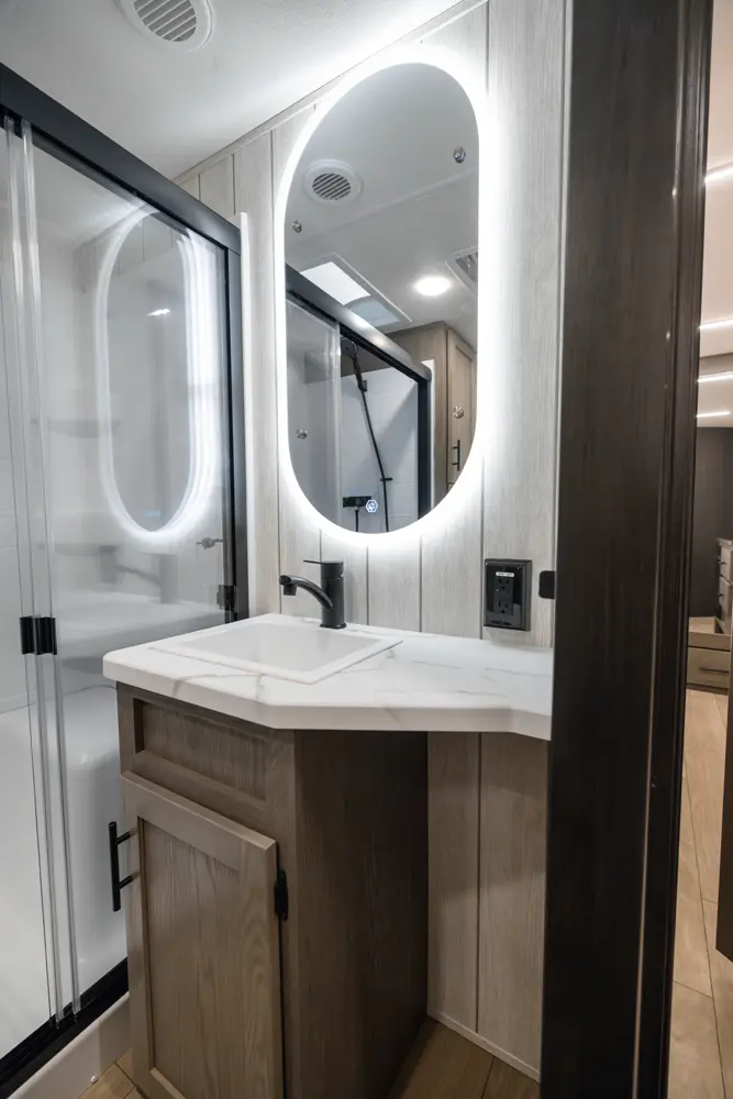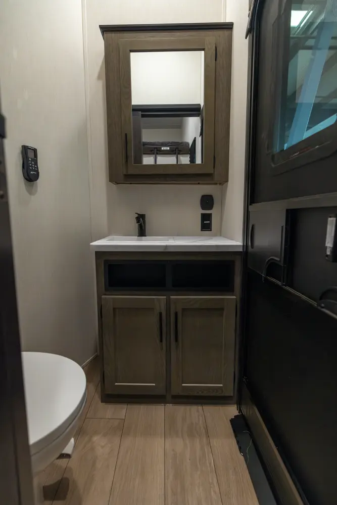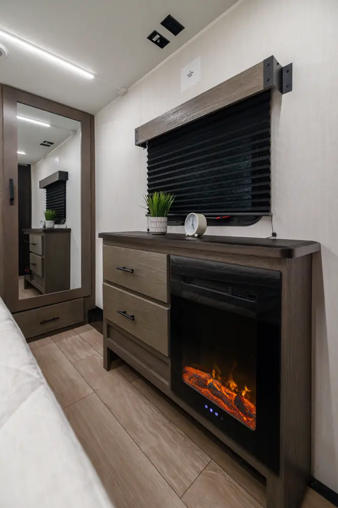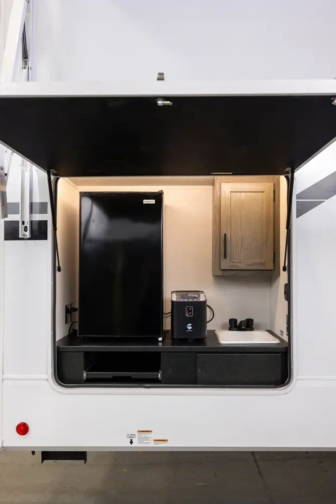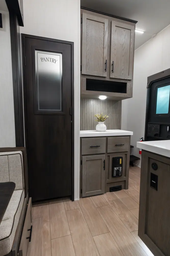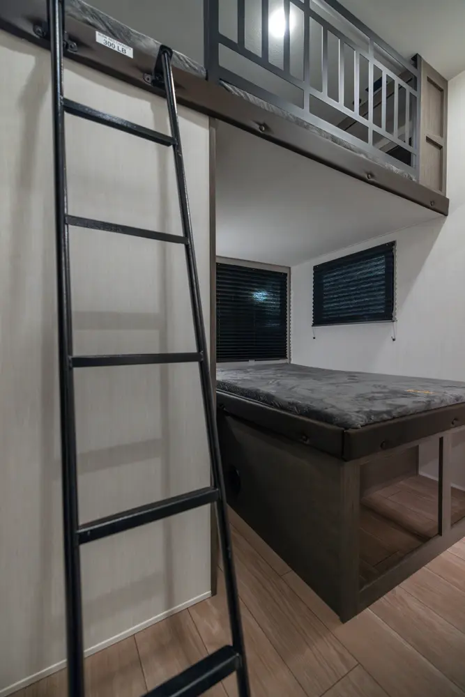 With two bedrooms and a loft, the Arctic Wolf 3750SUITE by Forest River is a great option for families with older children or adult guests! The rear features a 54x74 bed with a 60x80 loft bed overhead, ample wardrobe space and a half bathroom. Out in the island kitchen you'll find modern appliances like two 10 cu. ft. refrigerators, 30" microwave, oven and a dinette that converts into a bed. In the primary suite you'll find a full bathroom, sun bench, king size bed and lots of wardrobe space.