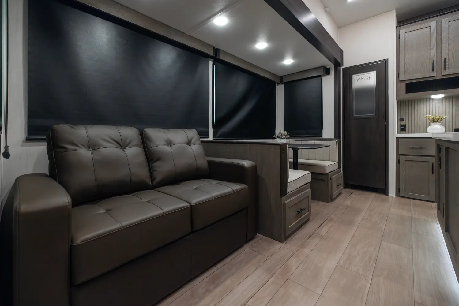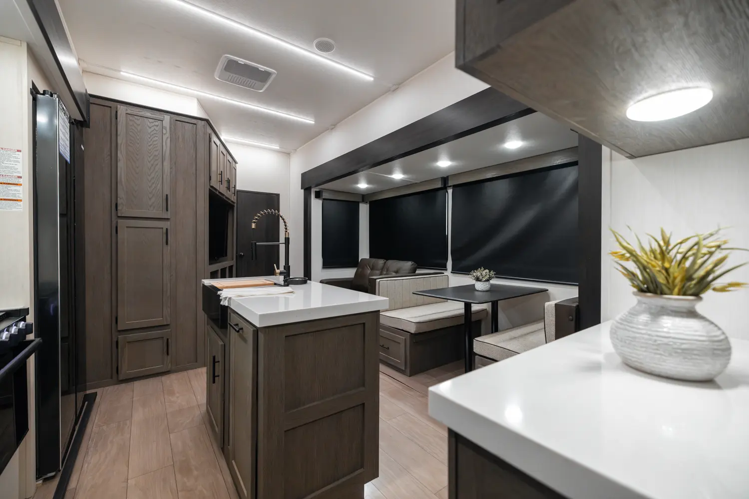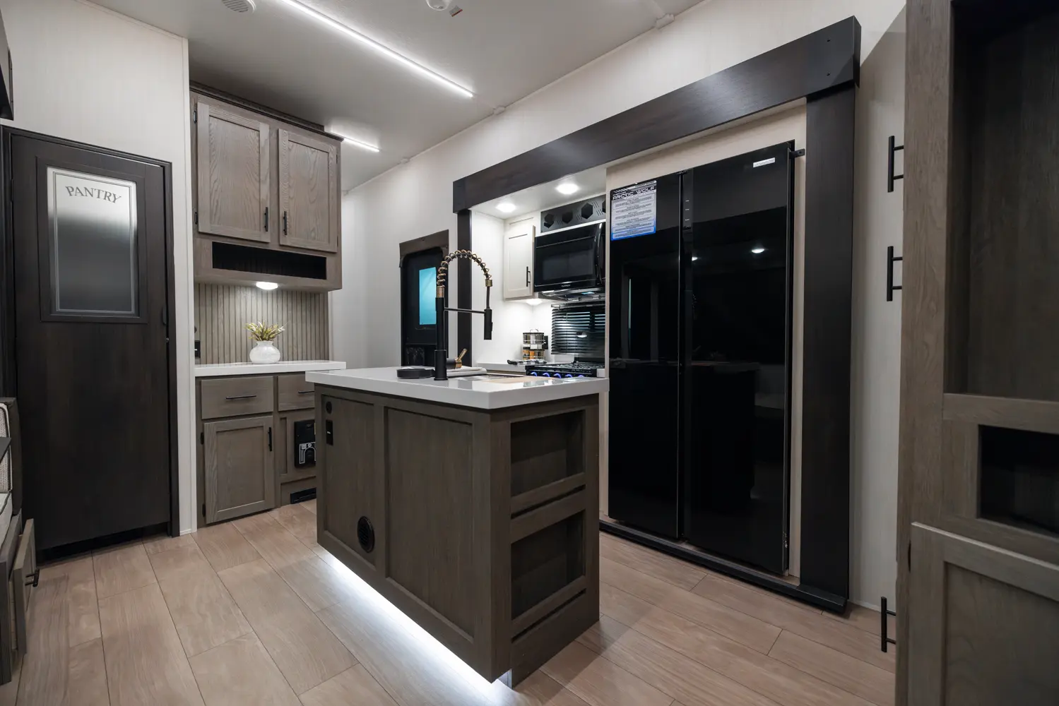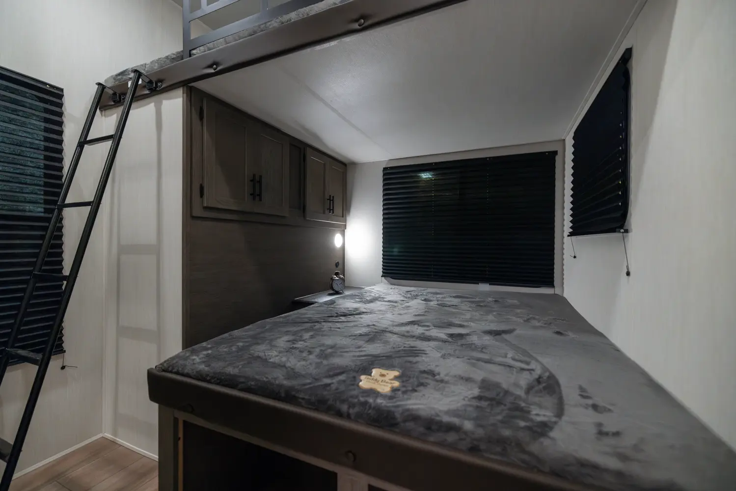 With two bedrooms and a loft, the Arctic Wolf 3750SUITE by Forest River is a great option for families with older children or adult guests! The rear features a 54x74 bed with a 60x80 loft bed overhead, ample wardrobe space and a half bathroom. Out in the island kitchen you'll find modern appliances like two 10 cu. ft. refrigerators, 30" microwave, oven and a dinette that converts into a bed. In the primary suite you'll find a full bathroom, sun bench, king size bed and lots of wardrobe space.