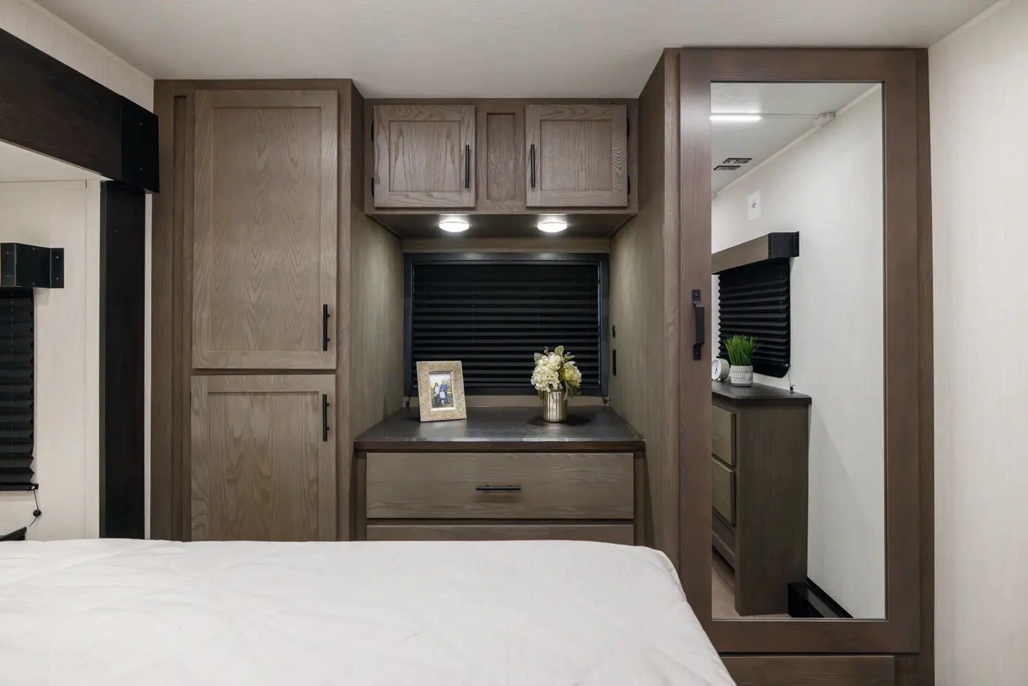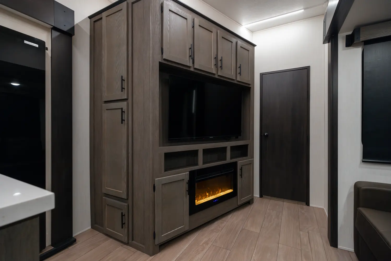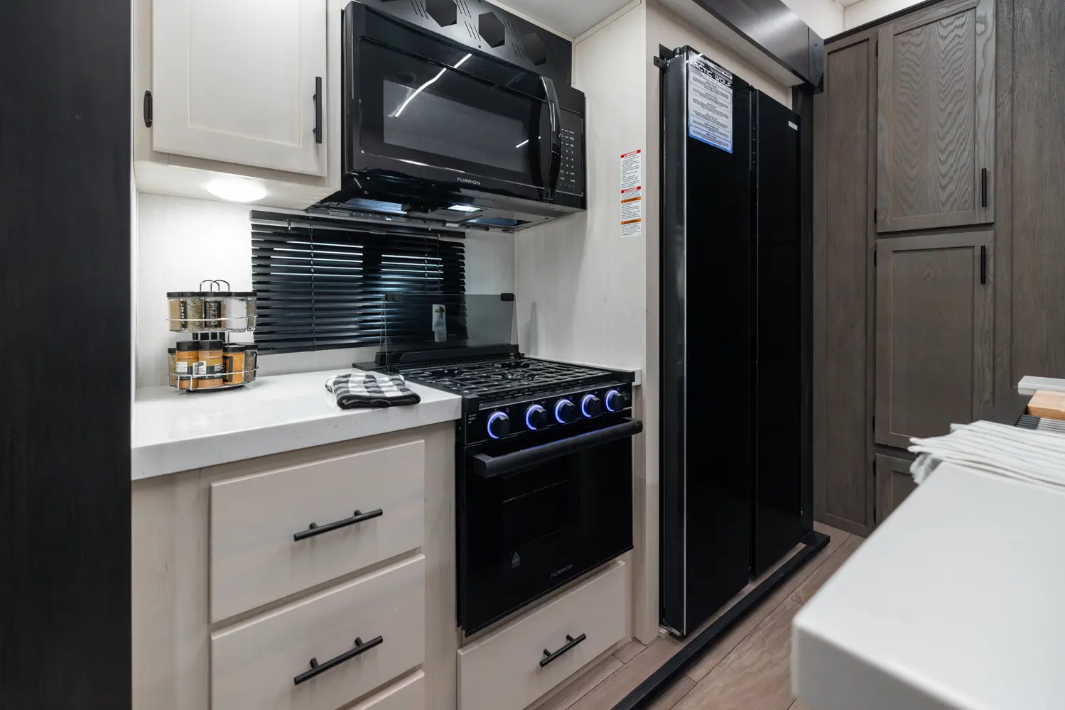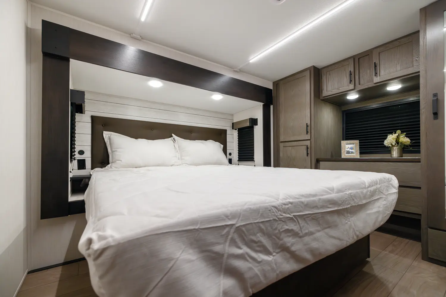 With two bedrooms and a loft, the Arctic Wolf 3750SUITE by Forest River is a great option for families with older children or adult guests! The rear features a 54x74 bed with a 60x80 loft bed overhead, ample wardrobe space and a half bathroom. Out in the island kitchen you'll find modern appliances like two 10 cu. ft. refrigerators, 30" microwave, oven and a dinette that converts into a bed. In the primary suite you'll find a full bathroom, sun bench, king size bed and lots of wardrobe space.