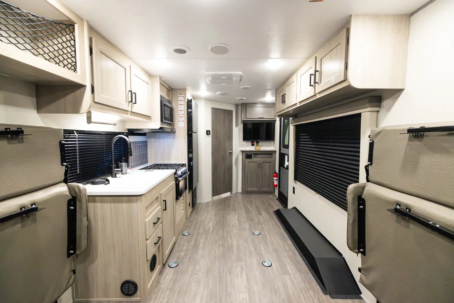 Compact yet capable toy hauler that lets you bring bikes, kayaks, or off-road gear while still offering basic living amenities. Perfect for outdoor enthusiasts who want gear-ready freedom and the ability to camp off-grid or near trailheads.