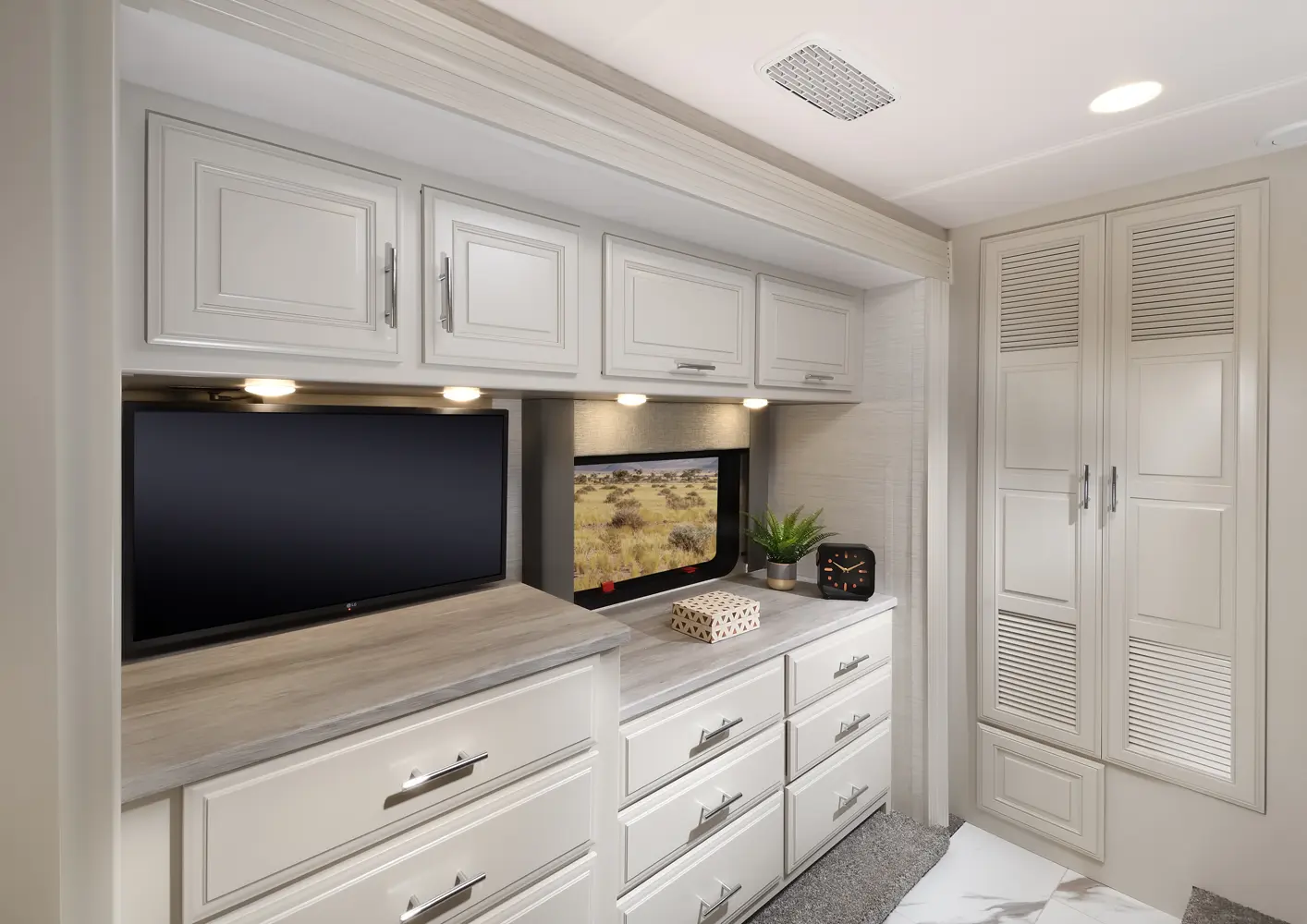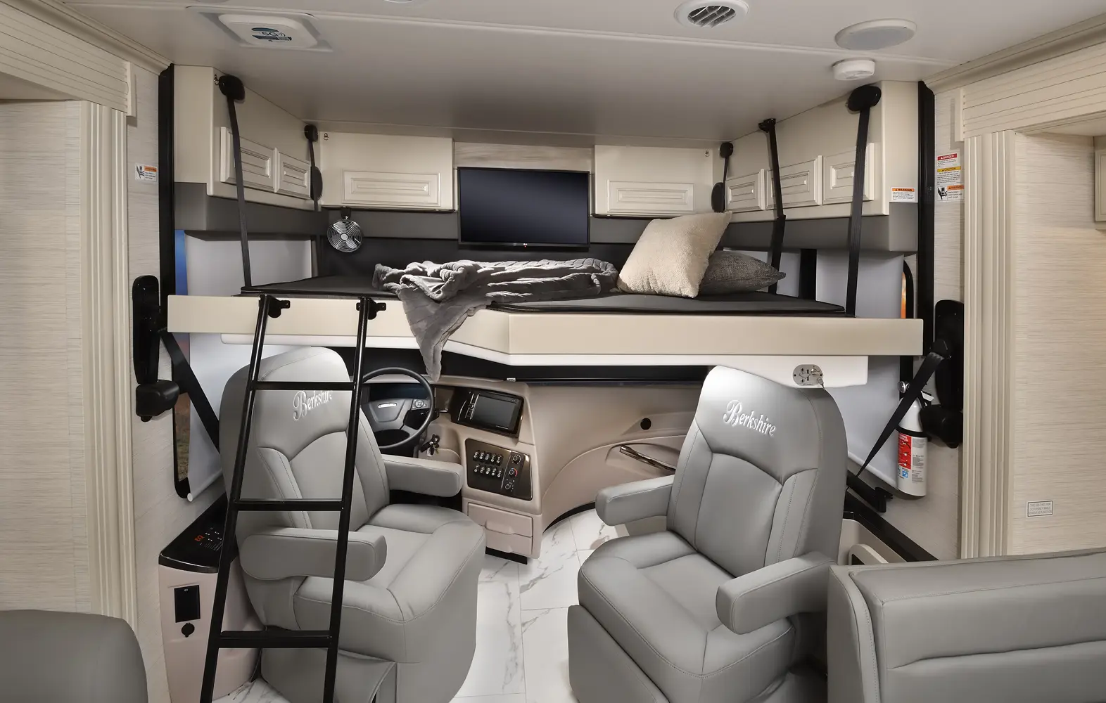 Experience luxury RV travel in a manageable size with the Berkshire 34B by Forest River. This Class A motorhome features three slides for ample space, a king-size Tilt-a-View bed, and a well-equipped kitchen. Perfect for comfortable and stylish road trips.