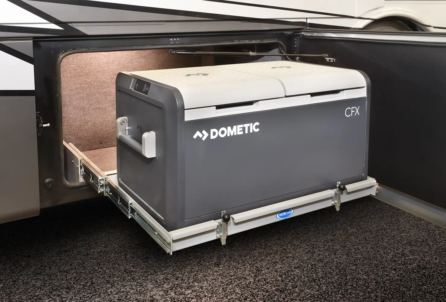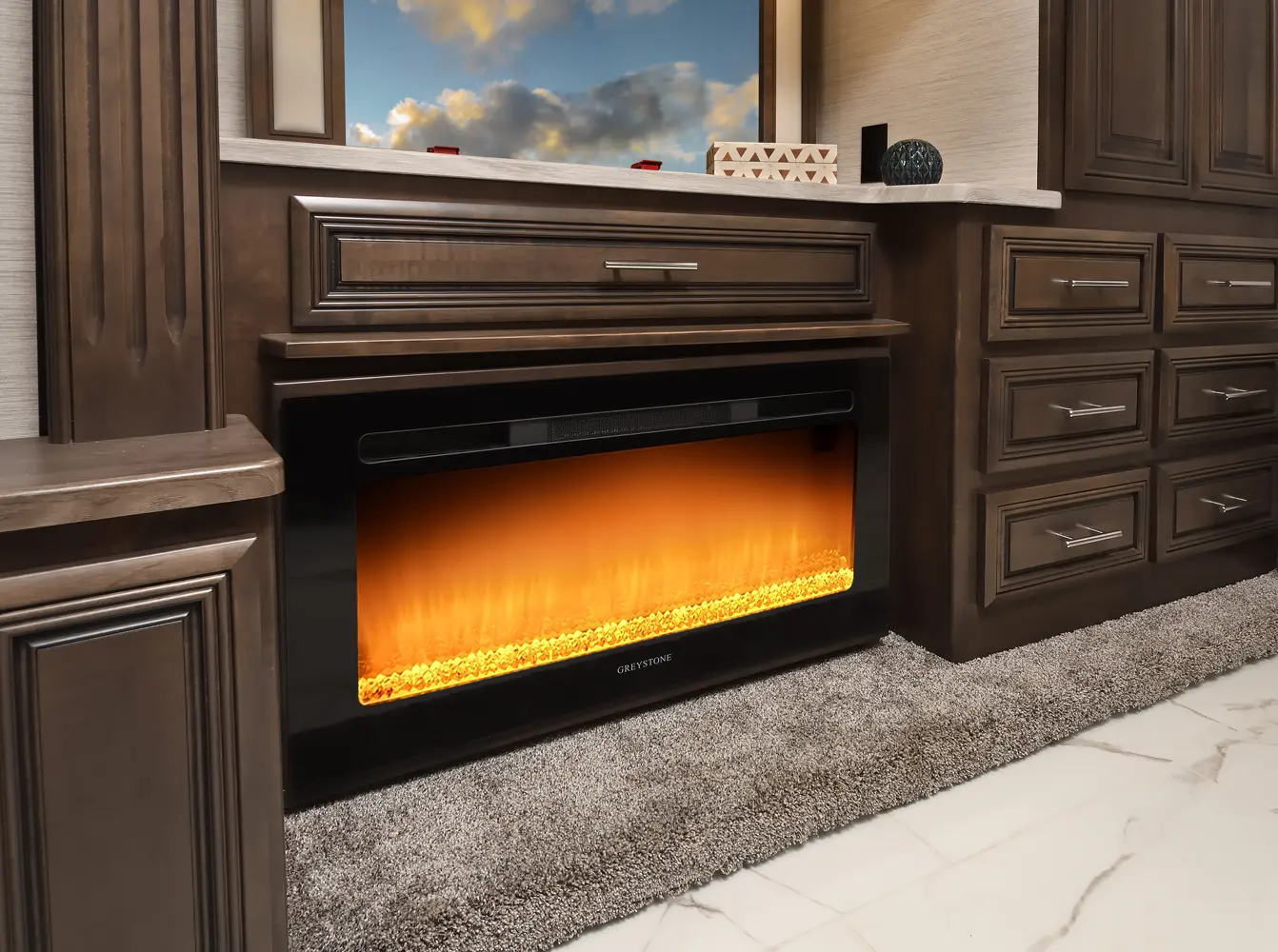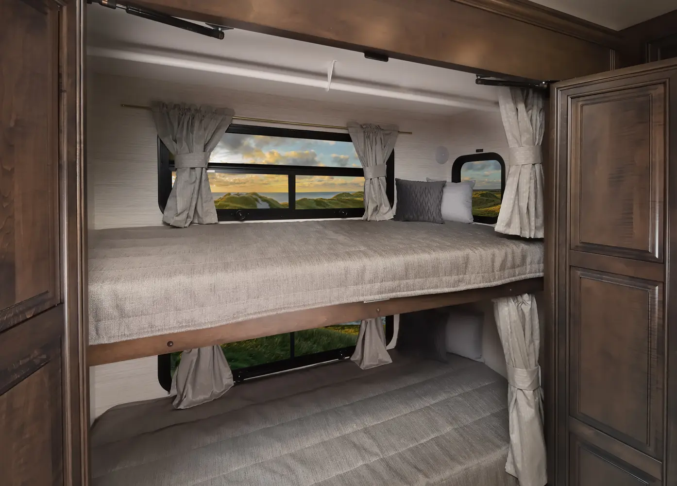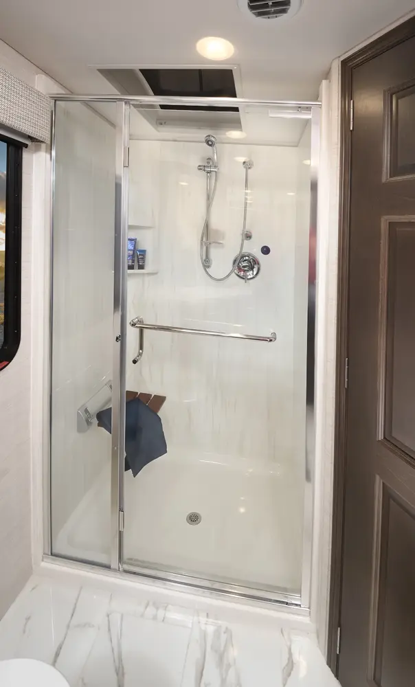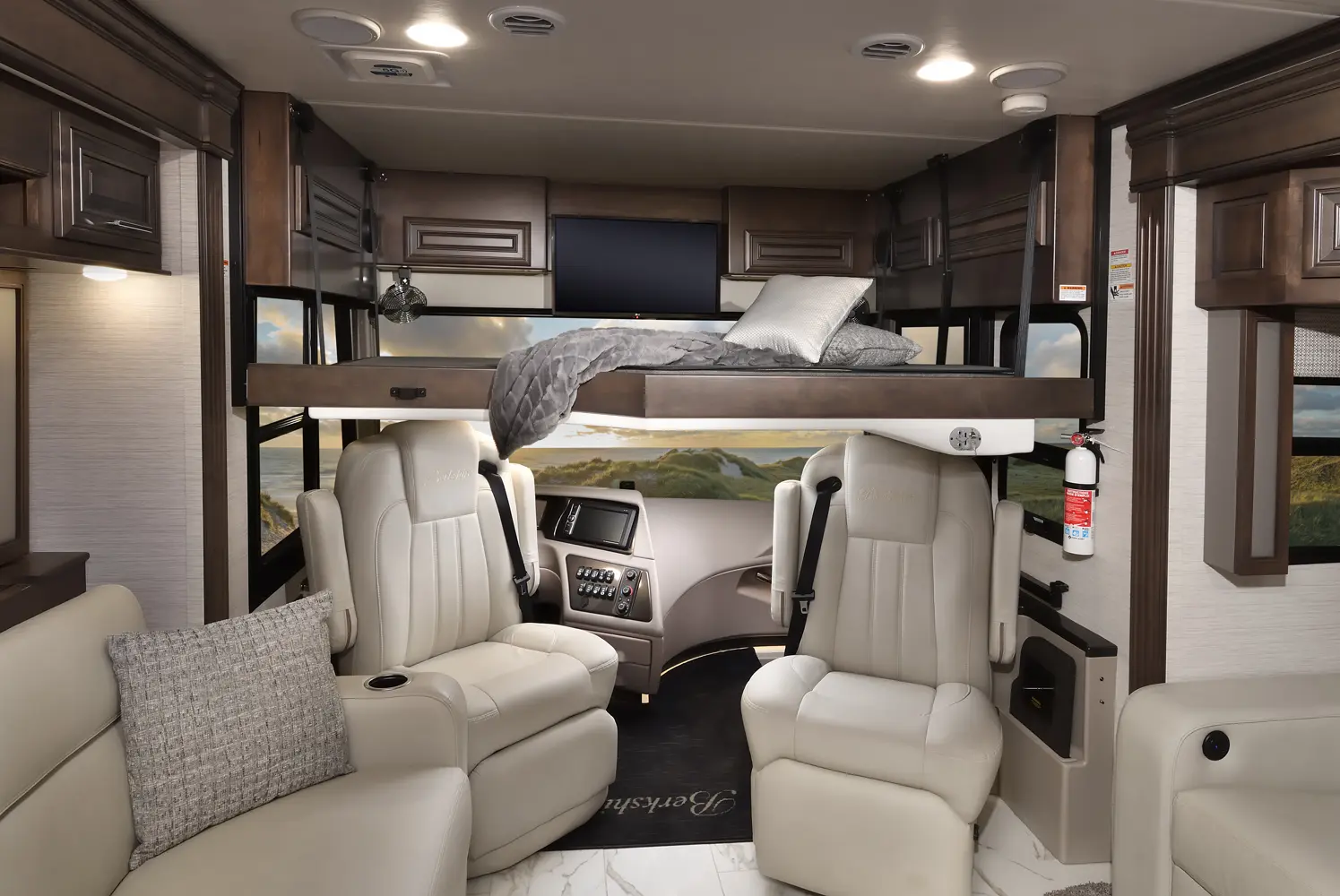 The Berkshire XLT 45E is a five-slide bunkhouse model. The large full rear bath includes a shower, vanity, cabinets, and stacking washer/dryer. Within the bathroom is a slideout bunk room/wardrobe combo. Each bunk is 30" x 73" and has its own TV. The main bedroom has a slideout, 72" x 80" Tilt-a-View king bed, plus a dresser, wardrobe cabinet, 43" TV, and overhead cupboards. Moving toward the living area is a half bath with vanity sink, medicine cabinet, and commode. The kitchen is fully equipped with a convection microwave, induction cooktop, and residential-style refrigerator. Just over the cockpit, you'll find a unique drop-down bed that provides an additional sleeping surface.