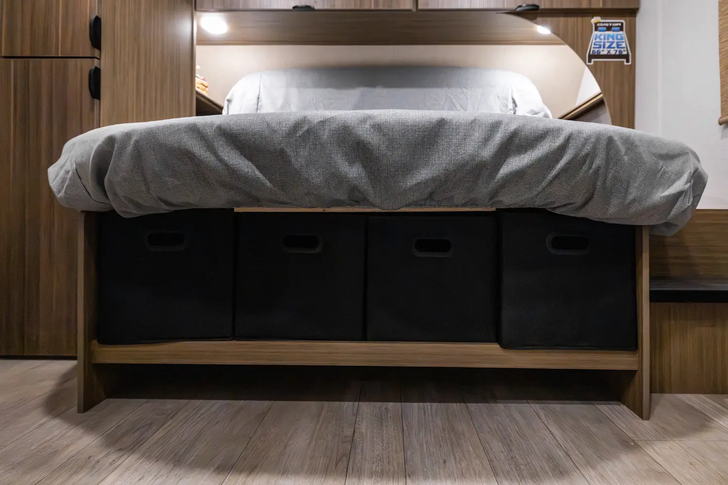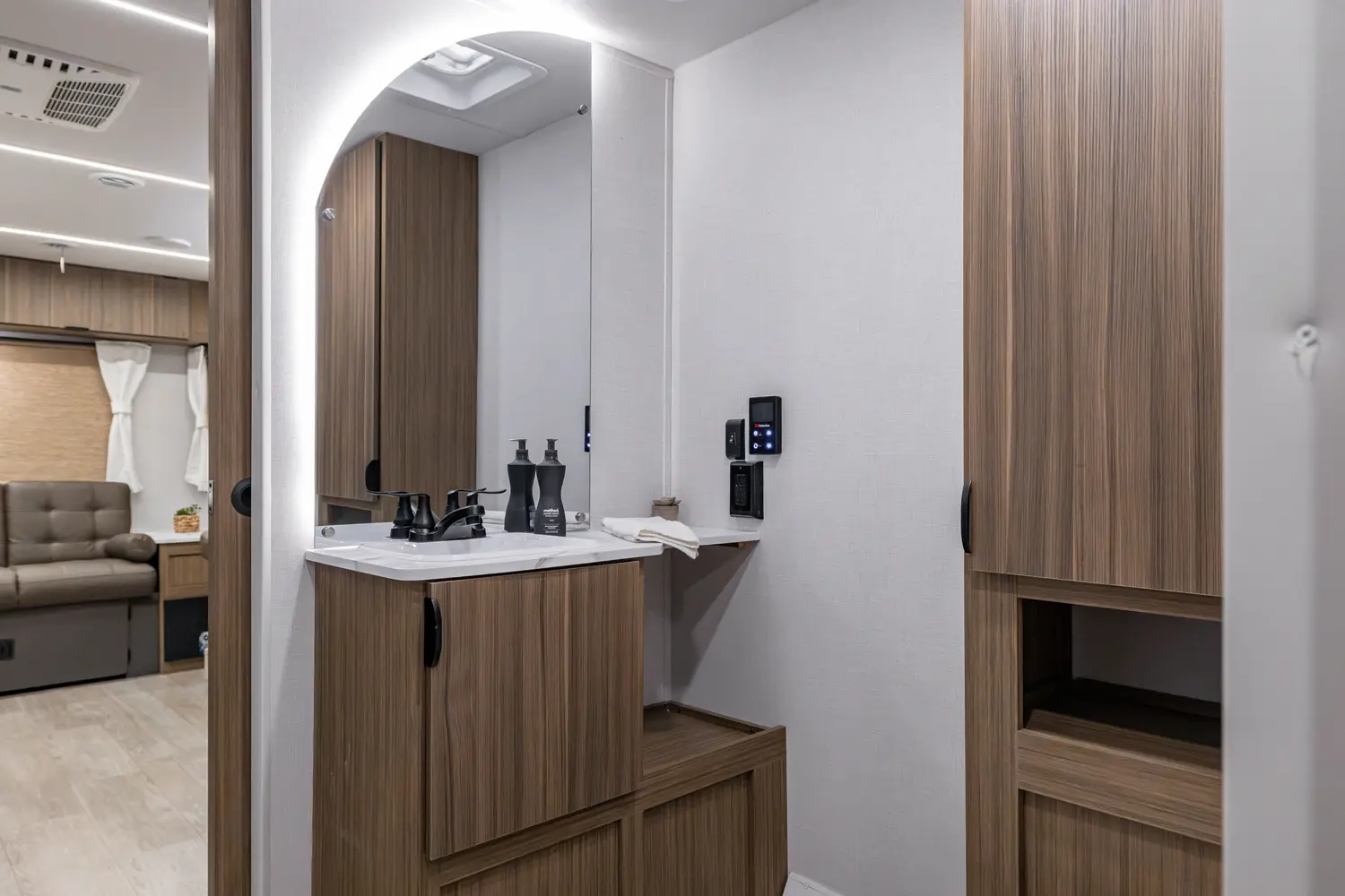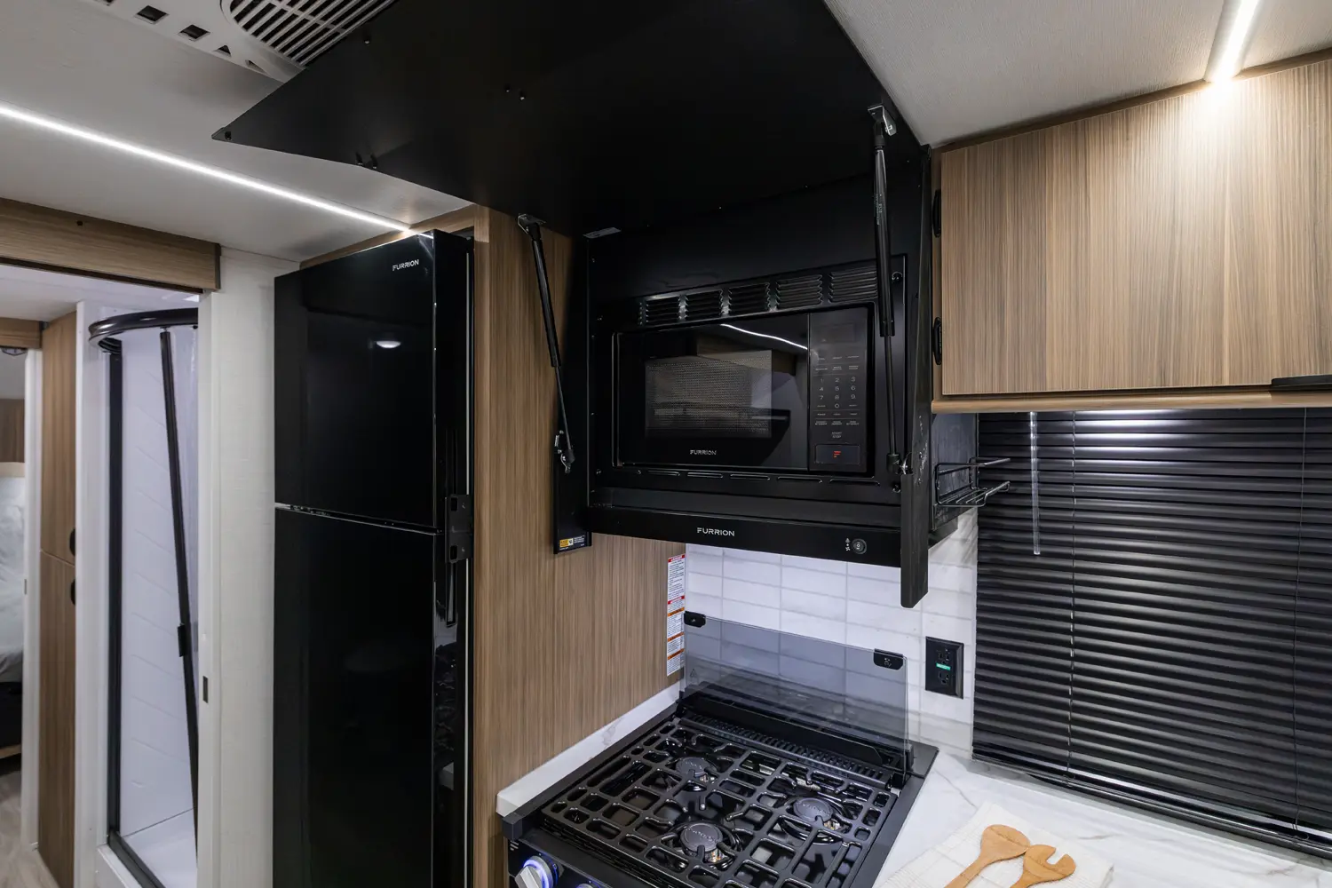 The 24RLXL is an extra-light travel trailer that comes in at 28' 11" and just over 5,000 lbs. The master bedroom features a ton of storage, including dedicated C-pap cubbies! The bathroom provides loads of storage as well, plus a walk-in shower. The kitchen is well-appointed with modern appliances and an oversized 11 CU. FT. refrigerator, fireplace, and U-dinette.
