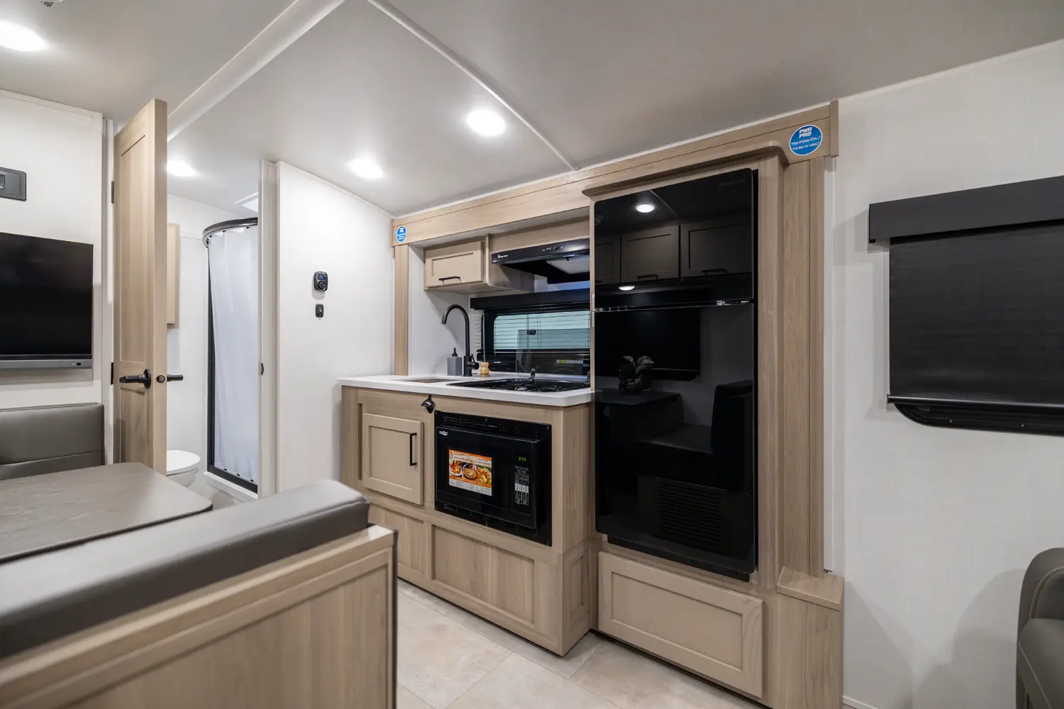 In this Flagstaff E-Pro E19FDS, you will find that the full-length bathroom and large shower in this model is the overwhelming highlight. The Murphy bed and kitchen slide in this 20’ travel trailer makes the living room in this unit so spacious. The door side dinette with a large window, gives this unit a “right at home” feel. This single axle trailer checks so many essential boxes.
