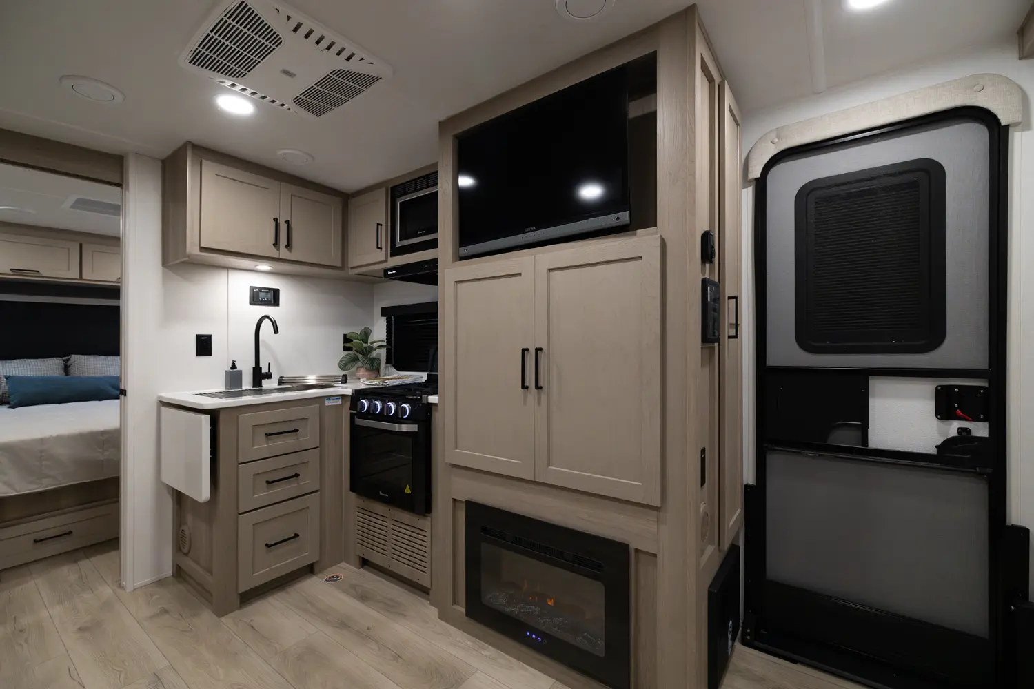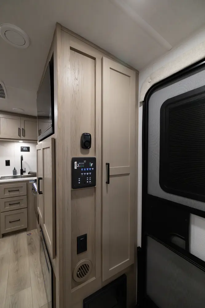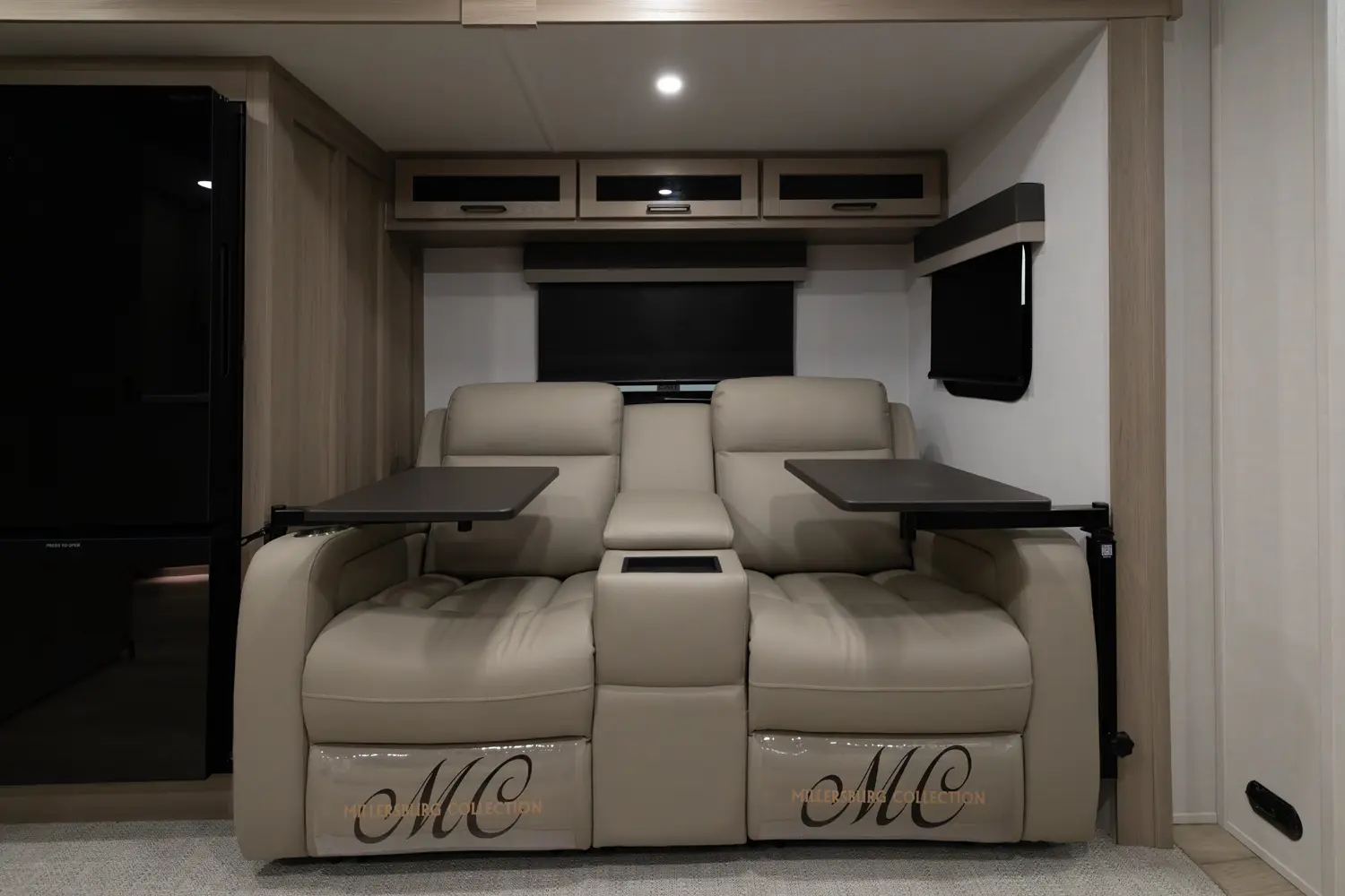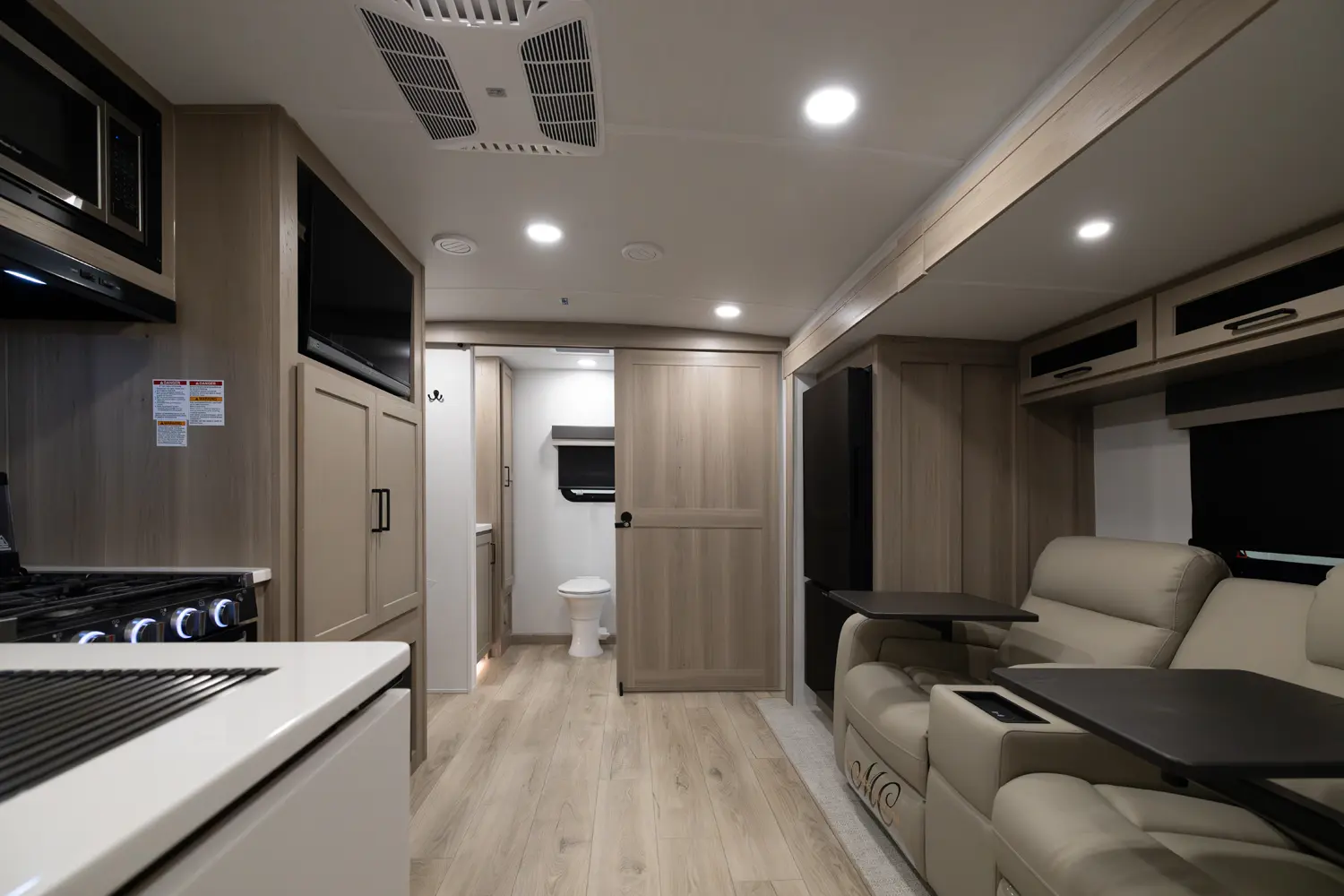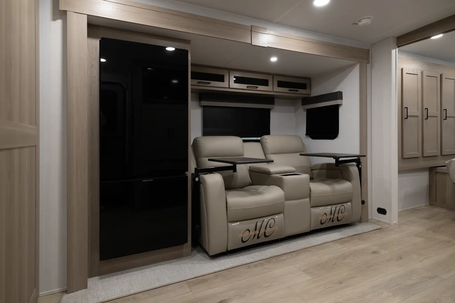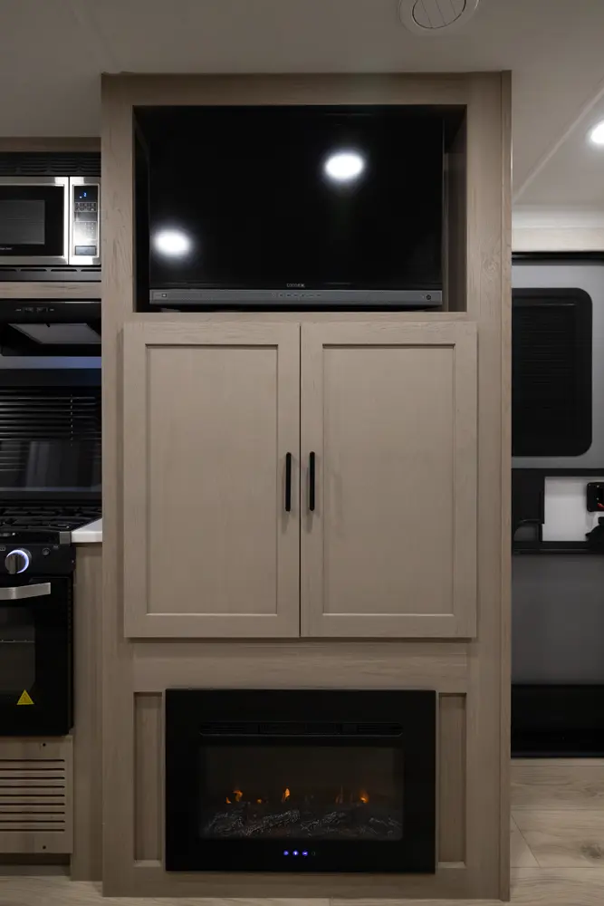 This unit is unique with its big 36" sliding doors leading to the bathroom and bedroom. These doors make moving around for a broad shouldered person easier and comfortable. The entertainement center is loaded with 32" tv, a residential soundbar and a fireplace space heater. Across from this lovely entertainment center is a 72" theatre seating which is perfect for reclining and watching a good movie.