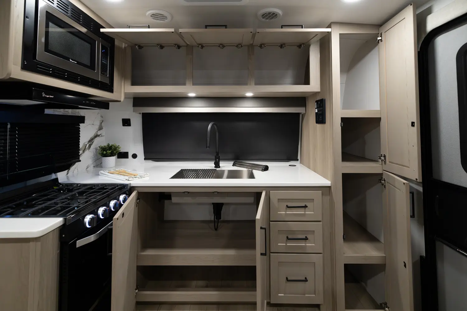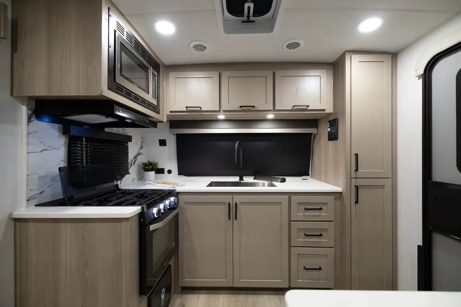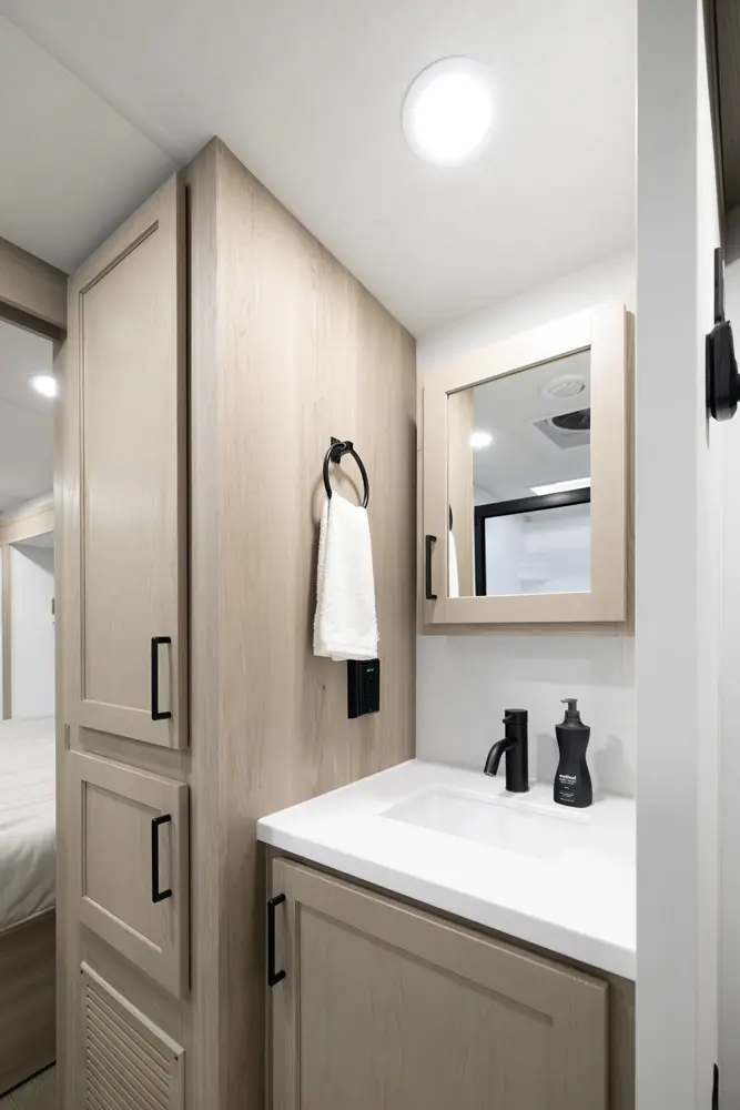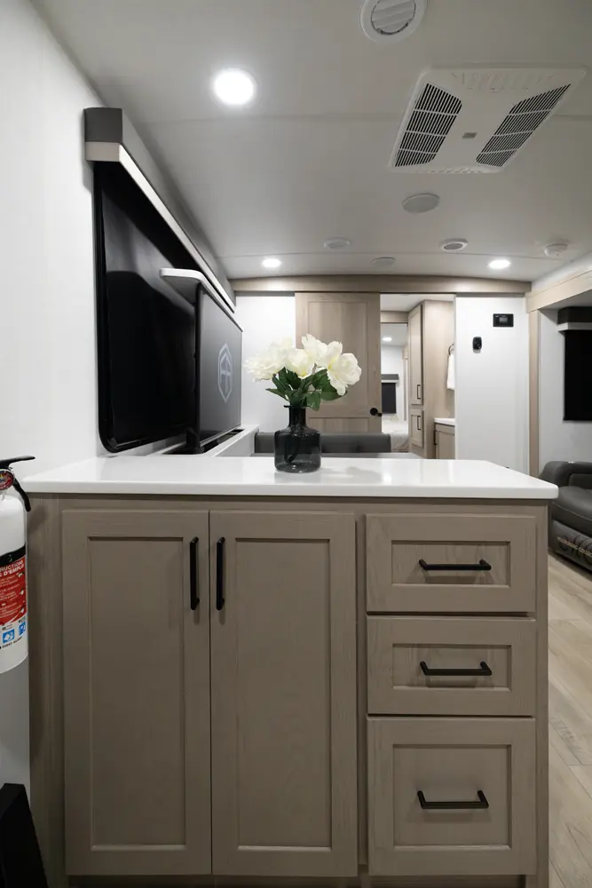 • Platinum Package: Auto Leveling, Frameless Windows, 1800W Inverter, MORryde Strut Assist Entry Step, Dual 30 LP Tanks