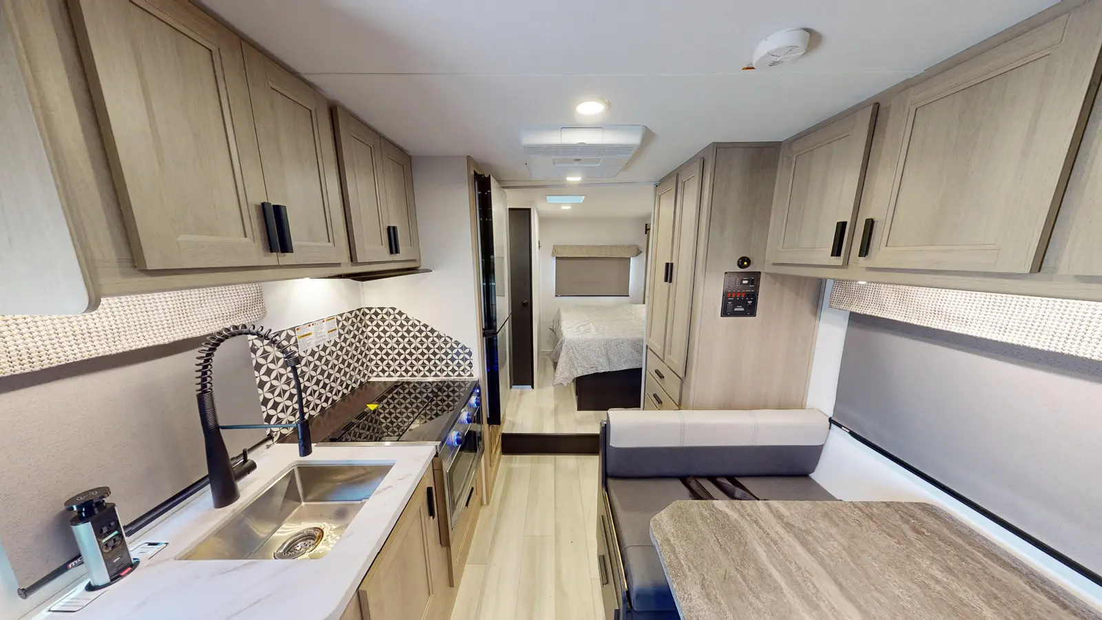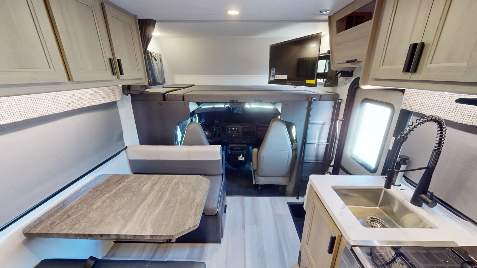 The Forester 2251SLE motorhome is one of the smaller units. This unit features a rear queen bedroom slide for extra privacy. The kitchen area includes sink, convection microwave, 12V residential-style refrigerator, and 3-burner cooktop. Overhead cabinets throughout the coach provide storage options. The rear bathroom gives you a 24" x 32" shower and commode behind the door, with a sink and medicine cabinet that's always accessible. This model is available on either a Ford or Chevrolet chassis.