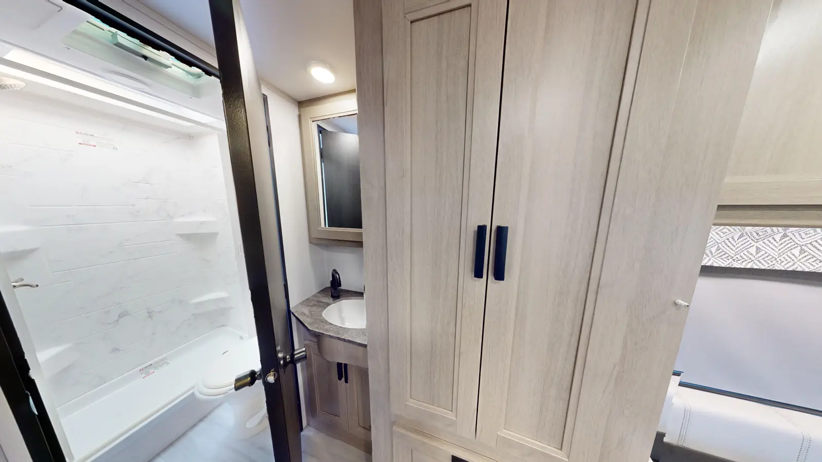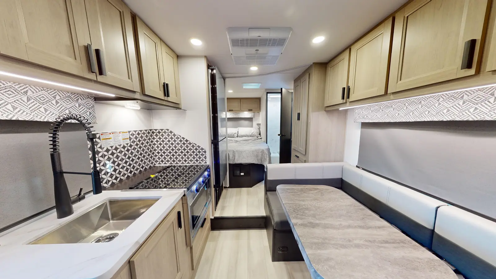 The Forester 2351LE provides a queen-size cab-over bunk for sleeping space or storage, plus a rear queen bedroom. The U-dinette provides additional sleeping space. The kitchen offers a 10.7 cu. ft. 12V refrigerator, a convection microwave, a recessed three-burner range, soft touch self-closing drawer guides and a cordless 12V charging plate. The private bathroom gives you a place to get cleaned up, and the sink is just outside the door. This model is available on a Ford or Chevrolet chassis.