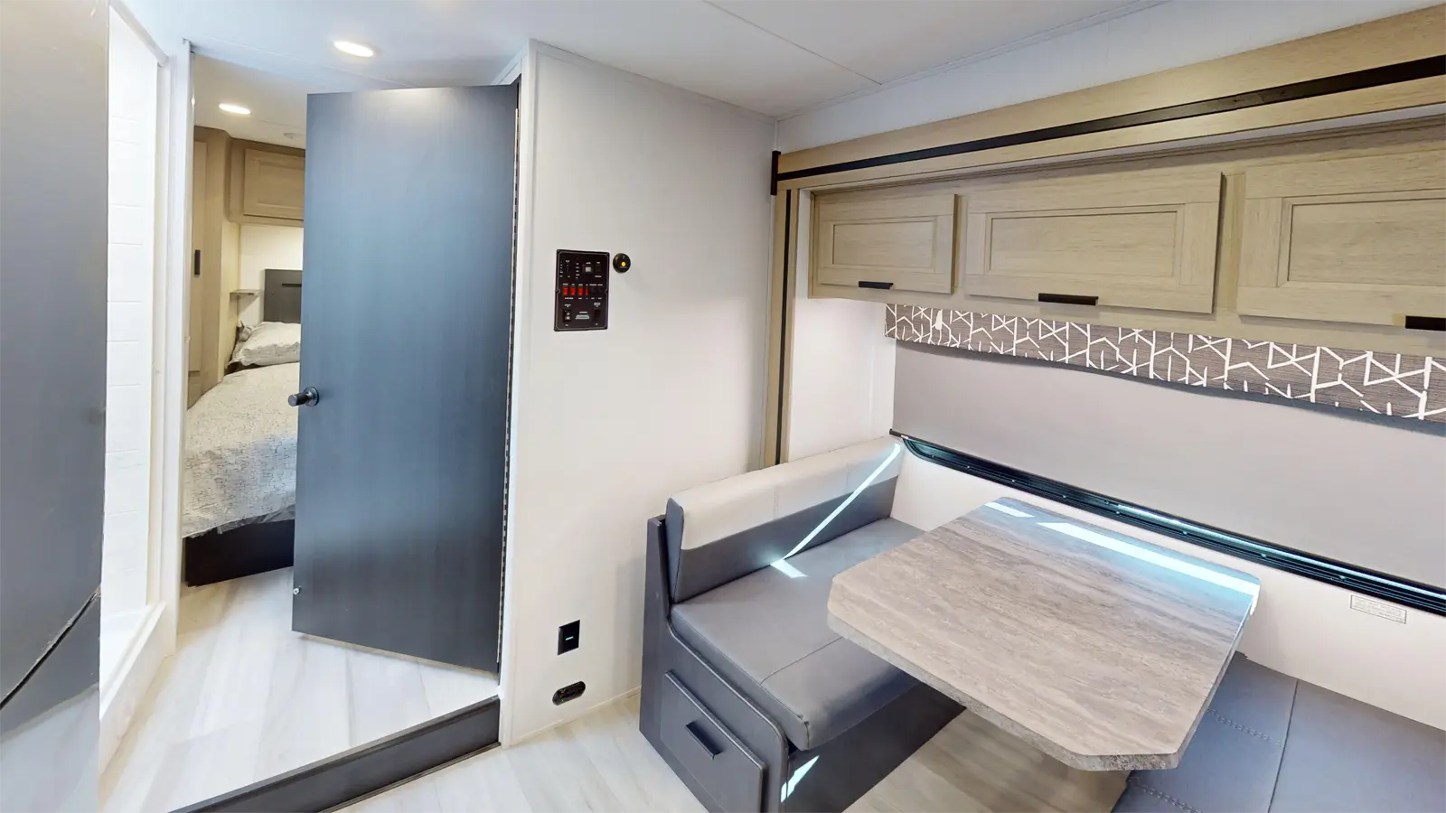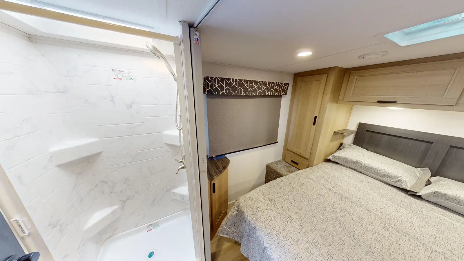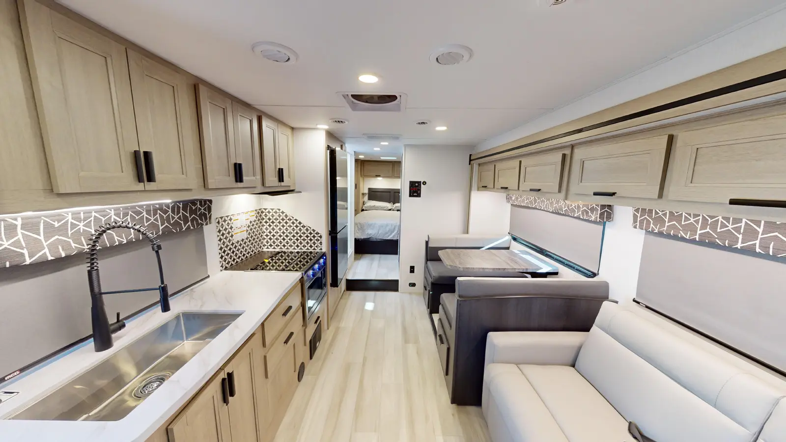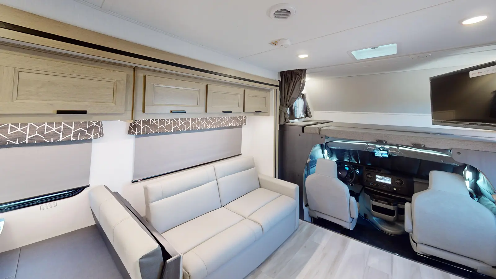 The Forester 2851SLE sits on a Ford chassis, features a single slide out for added interior space, and contains sleeping room for seven people. This model also has a sofa and booth dinette for relaxing, eating meals, or playing games. The kitchen is well appointed with cooktop, convection microwave, and 10.7 cu. ft. 12V refrigerator. The private rear bedroom includes a 60" x 74" queen bed and wardrobe cabinets for additional storage.