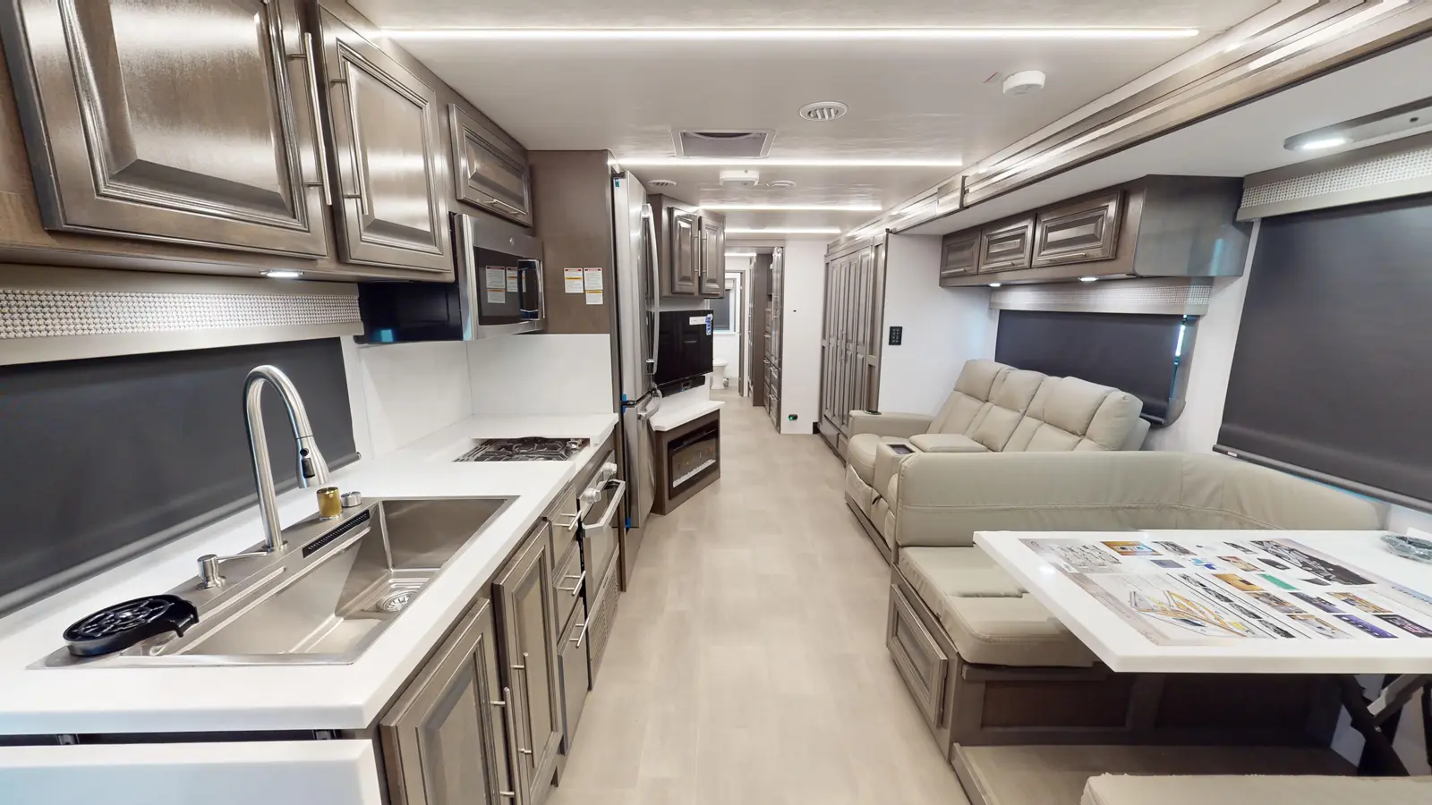 The Georgetown 36K7 by Forest River is designed for family comfort with two full baths and bunks. The kitchen features a farmhouse sink, 3-burner cooktop, microwave, and residential refrigerator. Enjoy entertainment in the theater seats across from a TV. The mid-ship full bath is across from the bunk beds. The bedroom offers a king bed and optional washer/dryer, plus a full master bath. The cab features swivel captain seats, a table, and a power overhead bunk.