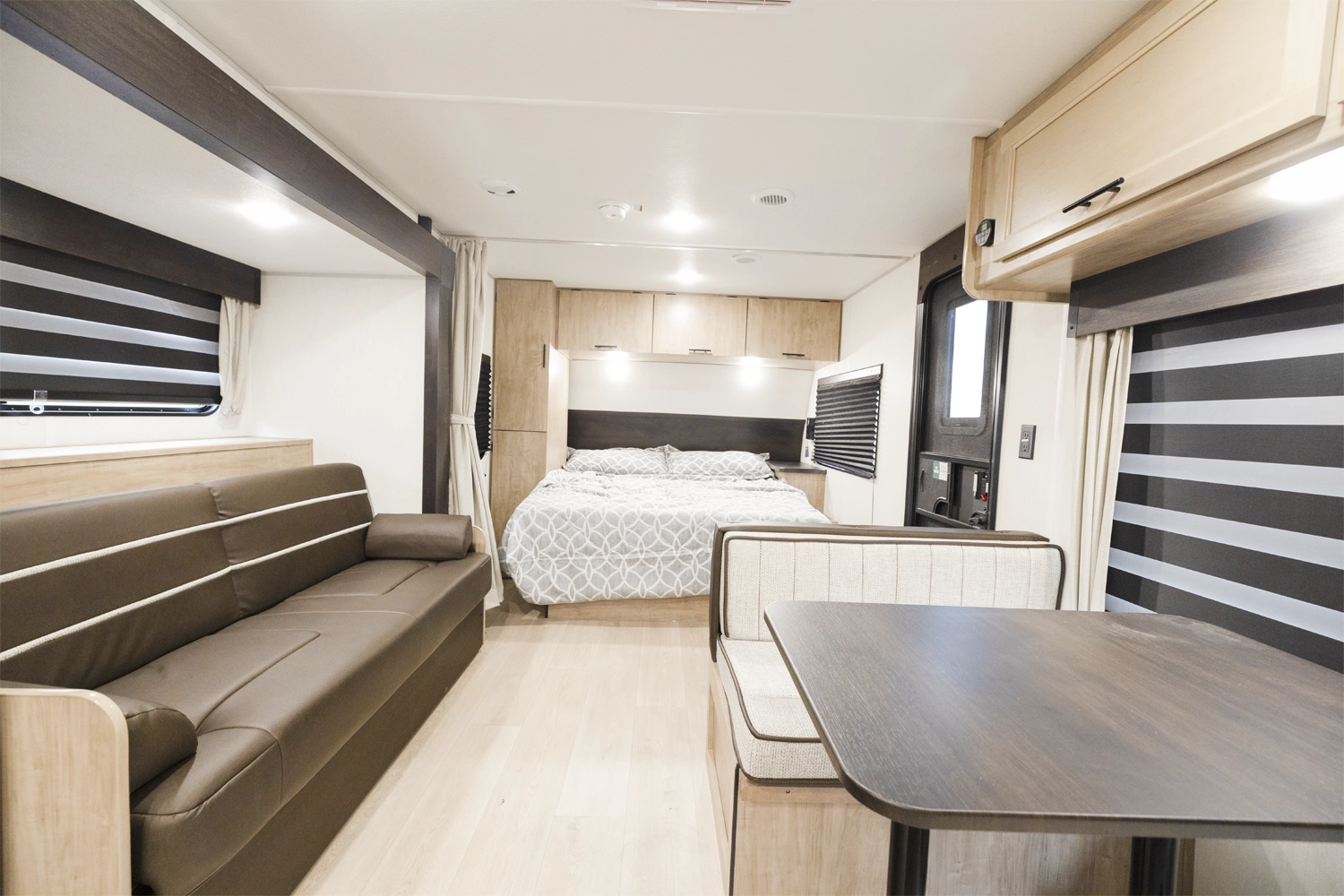 The Grey Wolf 22CE by Forest River is a stylish and functional travel trailer. Its open-concept design, featuring a bedroom, living room, and kitchen seamlessly blended together, maximizes space and creates a spacious feel. The 22CE offers a full bathroom, a large pantry, a 12-volt refrigerator, an air fryer combo microwave, and a king-size bed for ultimate comfort. The convertible dinette and sofa provide additional sleeping options, making it perfect for family trips or entertaining guests.