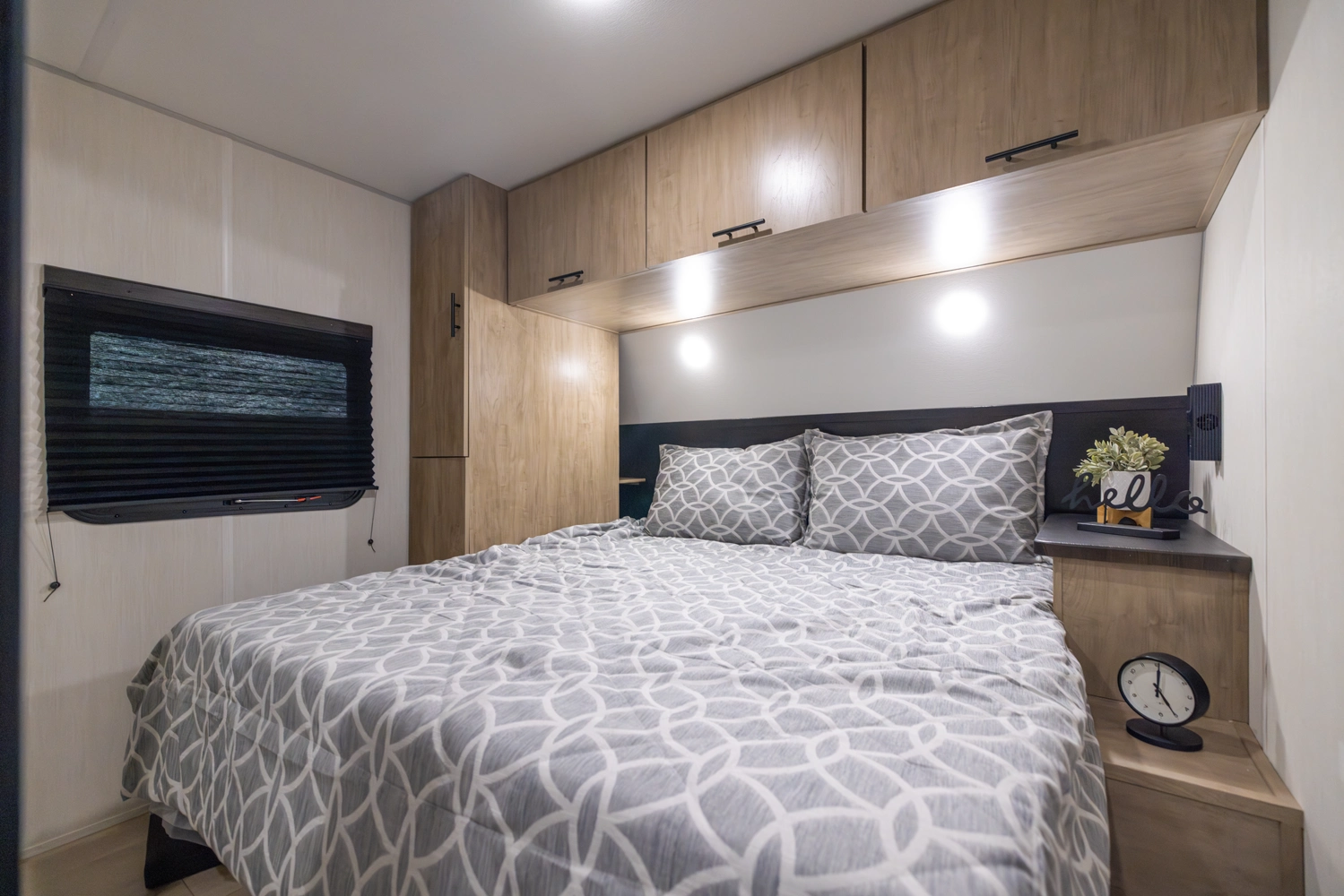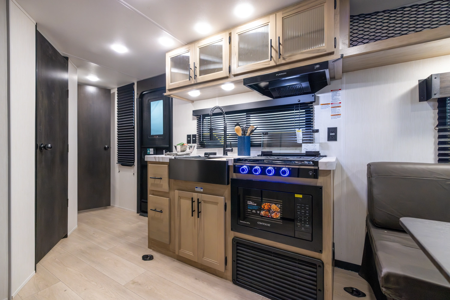 The Cherokee Grey Wolf 22RR by Forest River is the ultimate RV for outdoor enthusiasts. The spacious toy hauler garage, with a convertible rear ramp, provides ample space for toys and gear. The outdoor kitchen, shower, and patio area offer a luxurious outdoor living experience. Inside, you'll find a comfortable bedroom with a walk-around queen bed and a well-appointed bathroom. The modern kitchen, with its black stainless steel farm sink and sink cover, is perfect for cooking and entertaining.