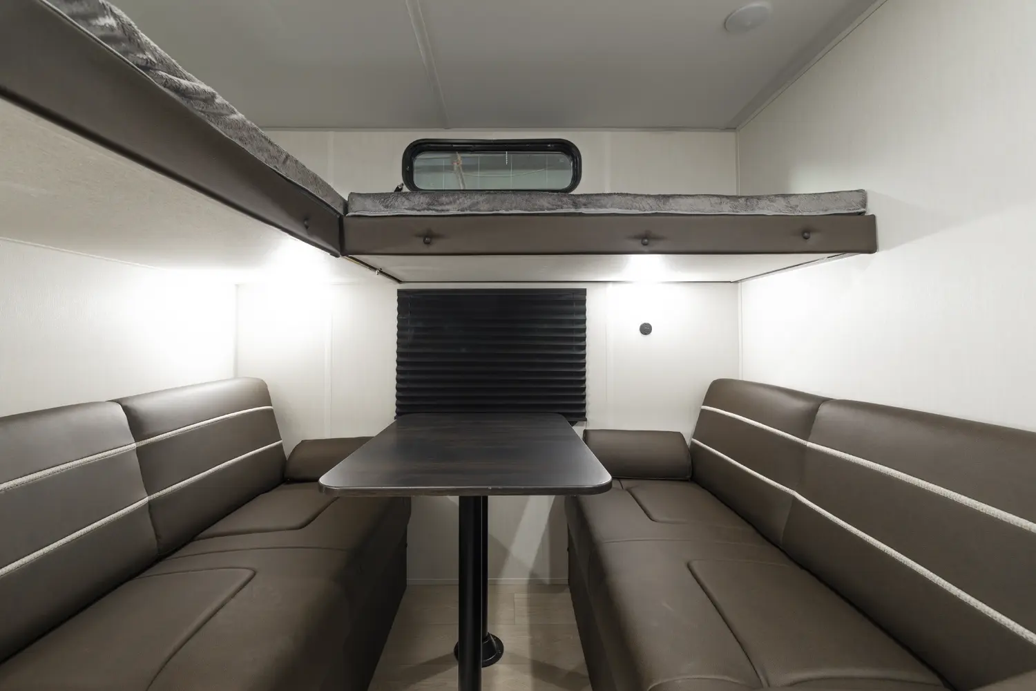 The Cherokee Grey Wolf 29NM by Forest River offers a unique floorplan with a rear bunkhouse that features a collapsable dinette, providing flexibility and space-saving functionality. The spacious living room, highlighted by a cozy fireplace and large windows, creates a welcoming atmosphere. The well-equipped kitchen, with its U-shaped dinette, full pantry, and ample prep space, is perfect for cooking and entertaining. Experience the comfort and versatility of the Cherokee Grey Wolf 29NM.