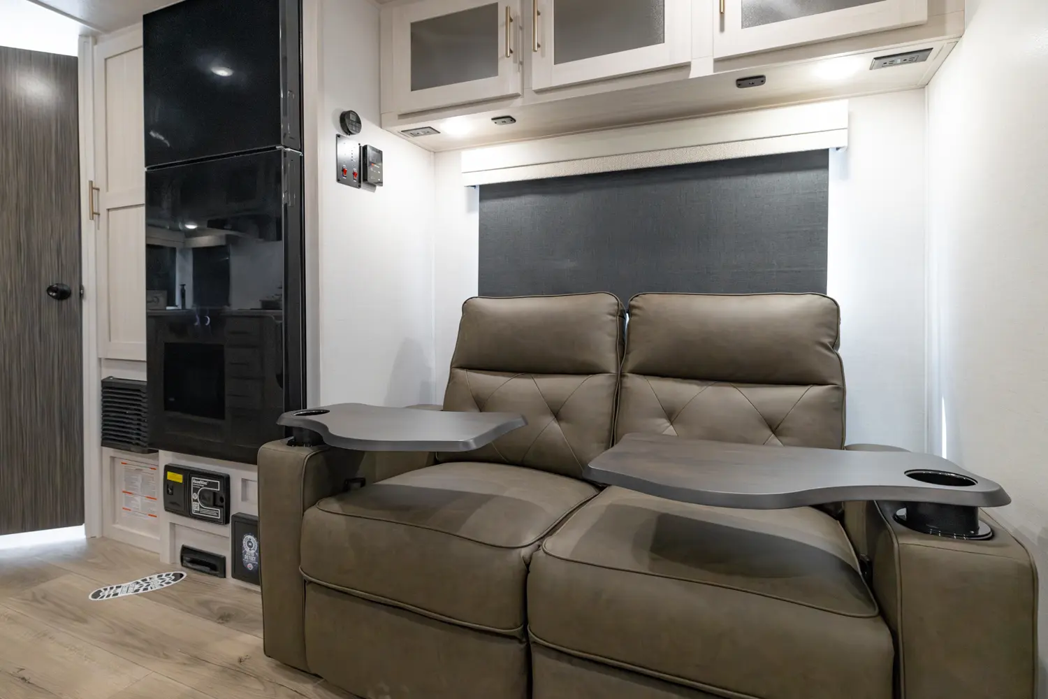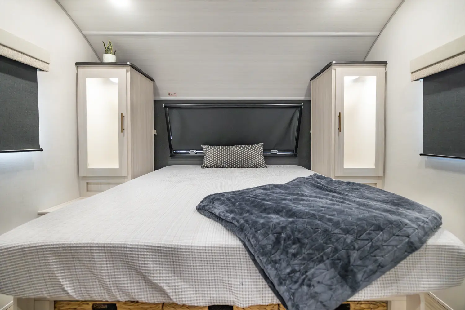 The RP-205 blends lightweight towing with a spacious layout. A private queen bedroom offers comfort and privacy, while the rear corner kitchen and booth dinette create a functional living space. The full bath adds convenience, and the theater seating enhances comfort. With modern finishes and smart storage, this no slide trailer is ideal for couples or small families seeking compact, full-featured adventures.