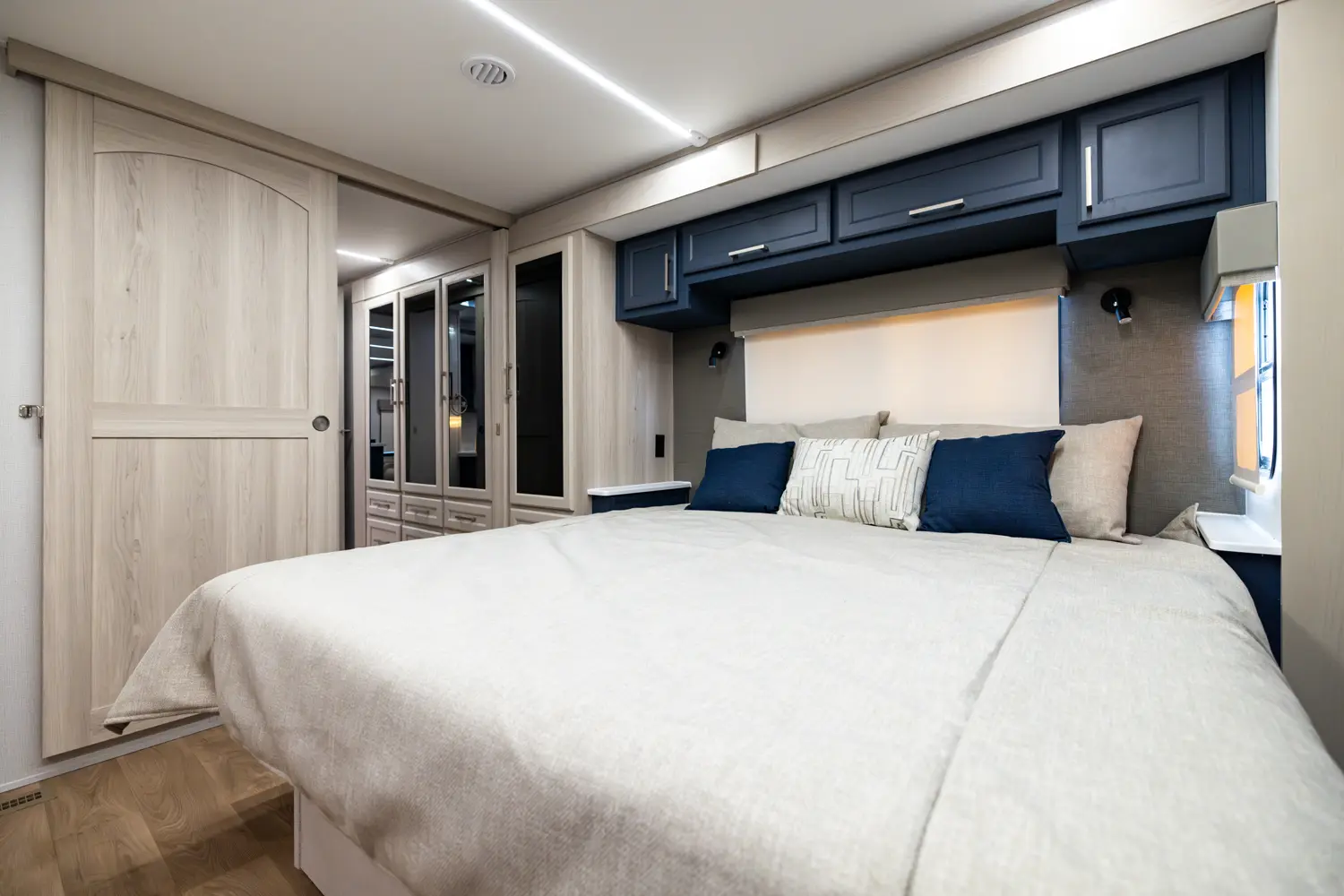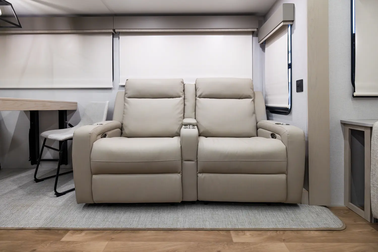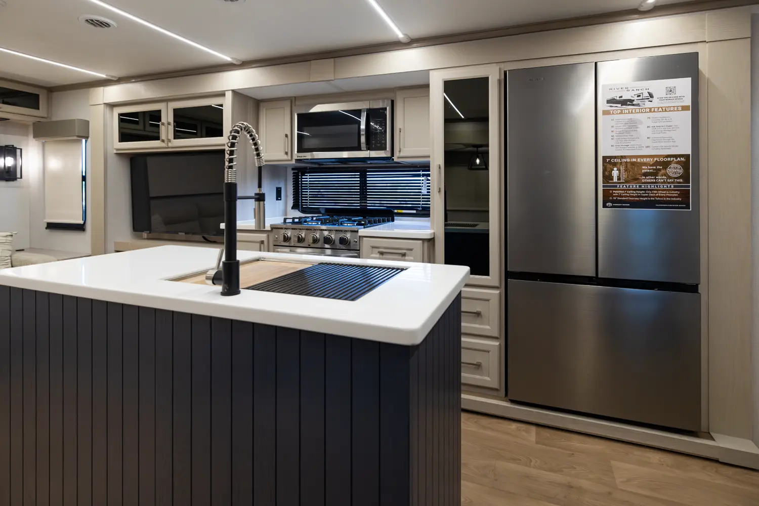 The 393RL is the biggest couples coach River Ranch has to offer. This floorplan provides a large bedroom with a king size bed. The full-length closest provides the most interior storage of any floorplan offered. The kitchen provides residential-style appliances, including a fridge with ice maker, 24” 4 burner range with oven, 30” microwave and dishwasher prep for an 18” residential dishwasher in the island. It has a plush 88” tri fold 50/50 split sofa, theater seat and 50” entertainment TV.