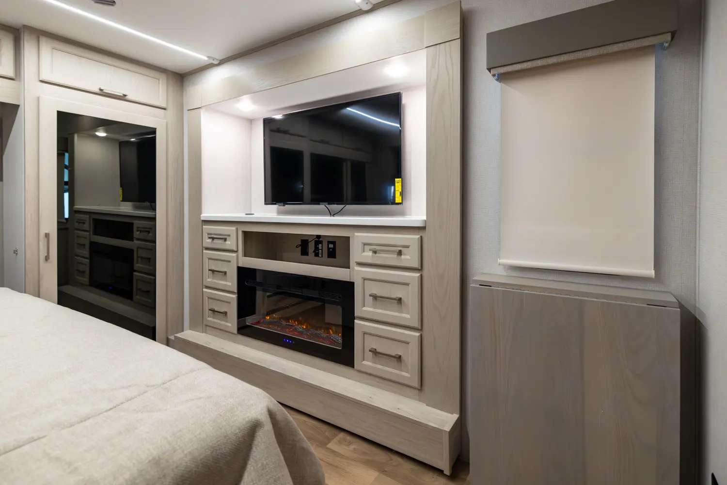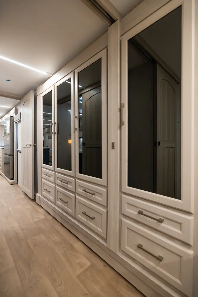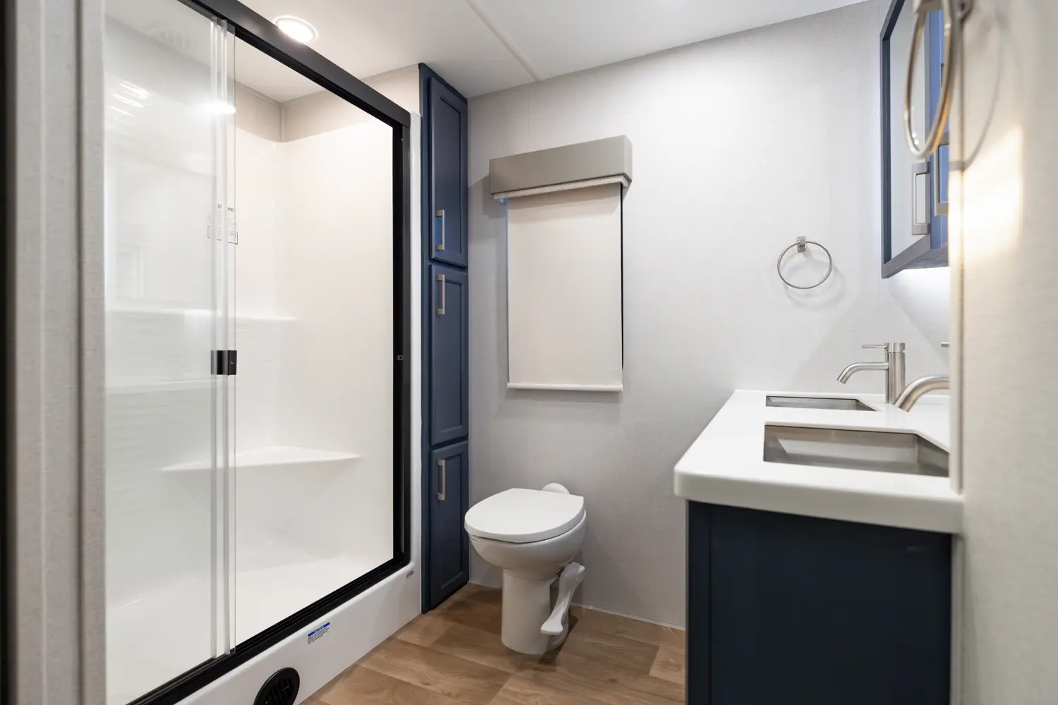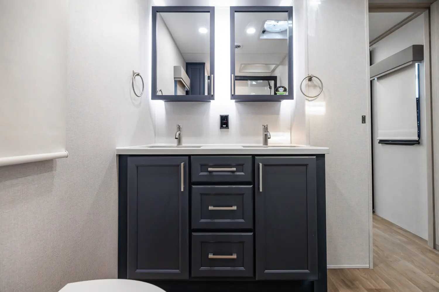 The 393RL is the biggest couples coach River Ranch has to offer. This floorplan provides a large bedroom with a king size bed. The full-length closest provides the most interior storage of any floorplan offered. The kitchen provides residential-style appliances, including a fridge with ice maker, 24” 4 burner range with oven, 30” microwave and dishwasher prep for an 18” residential dishwasher in the island. It has a plush 88” tri fold 50/50 split sofa, theater seat and 50” entertainment TV.