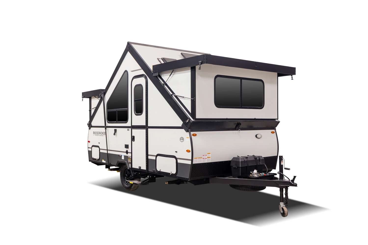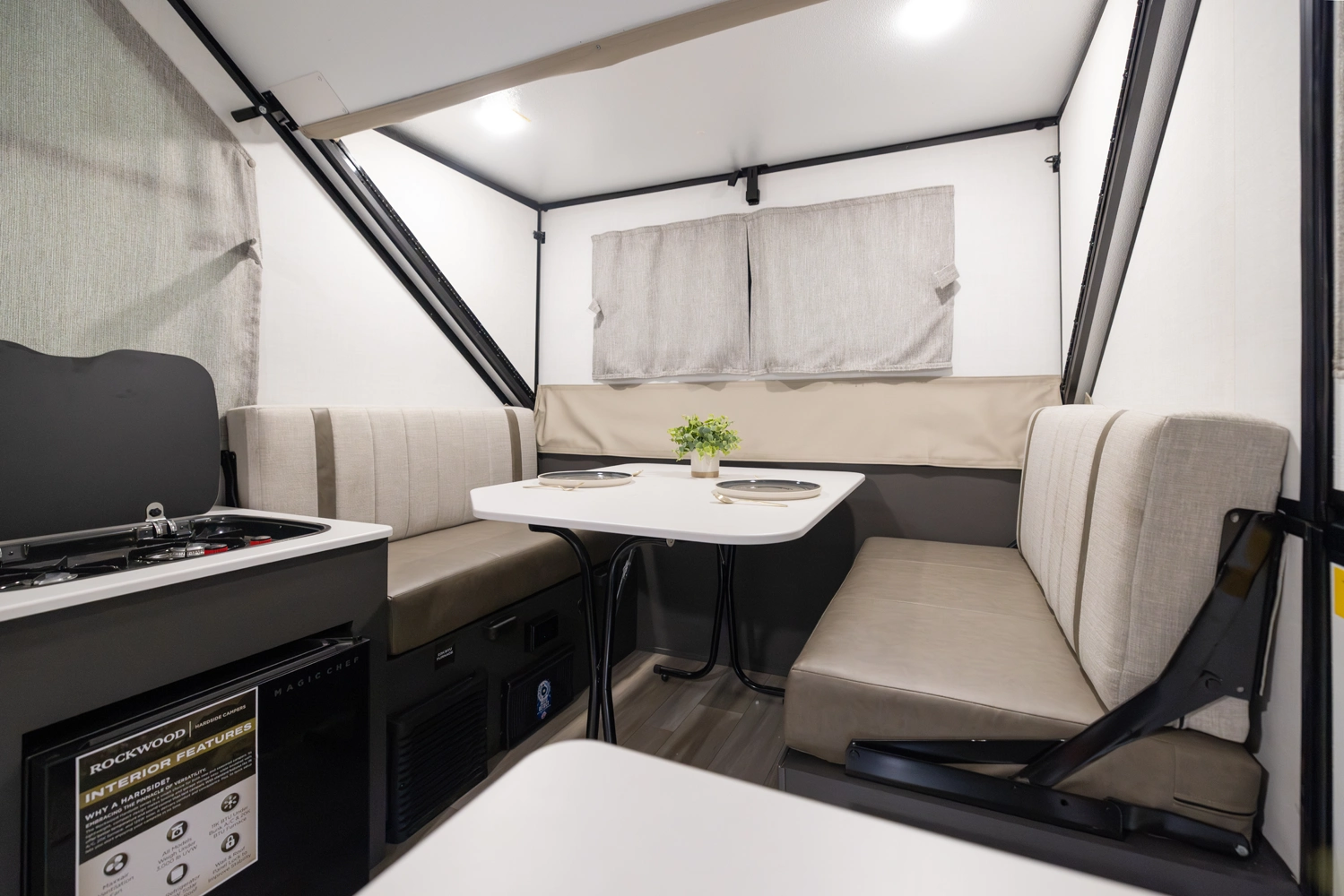 The Rockwood A121FD is a thoughtfully designed A-frame camper that maximizes space. It features a front 45" x 80" dinette, perfect for dining and relaxing. In the living area, you'll find a sink, cooktop, and small refrigerator. At the rear, a spacious 54" x 80" gaucho bed awaits, and with a double dormer, you get increased head height on both sides for extra comfort.