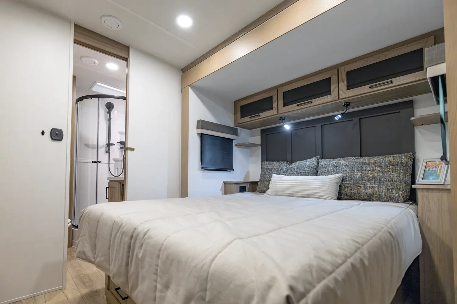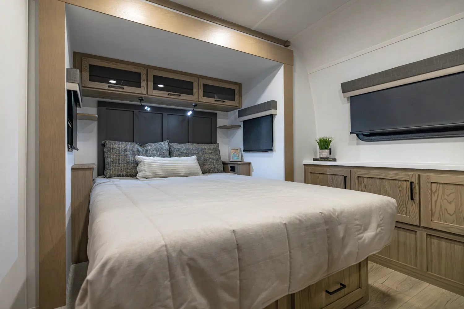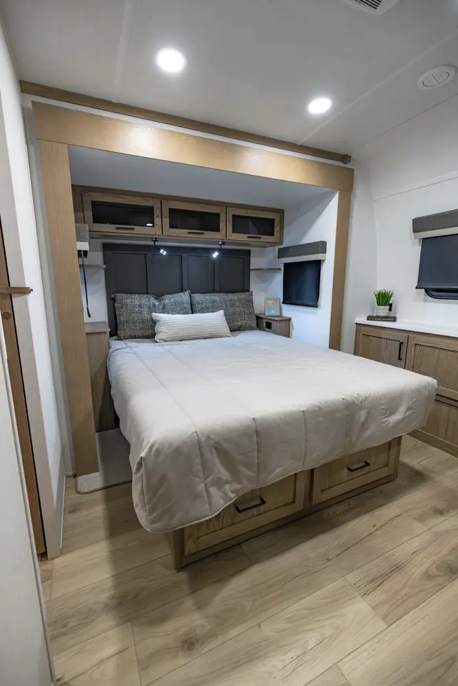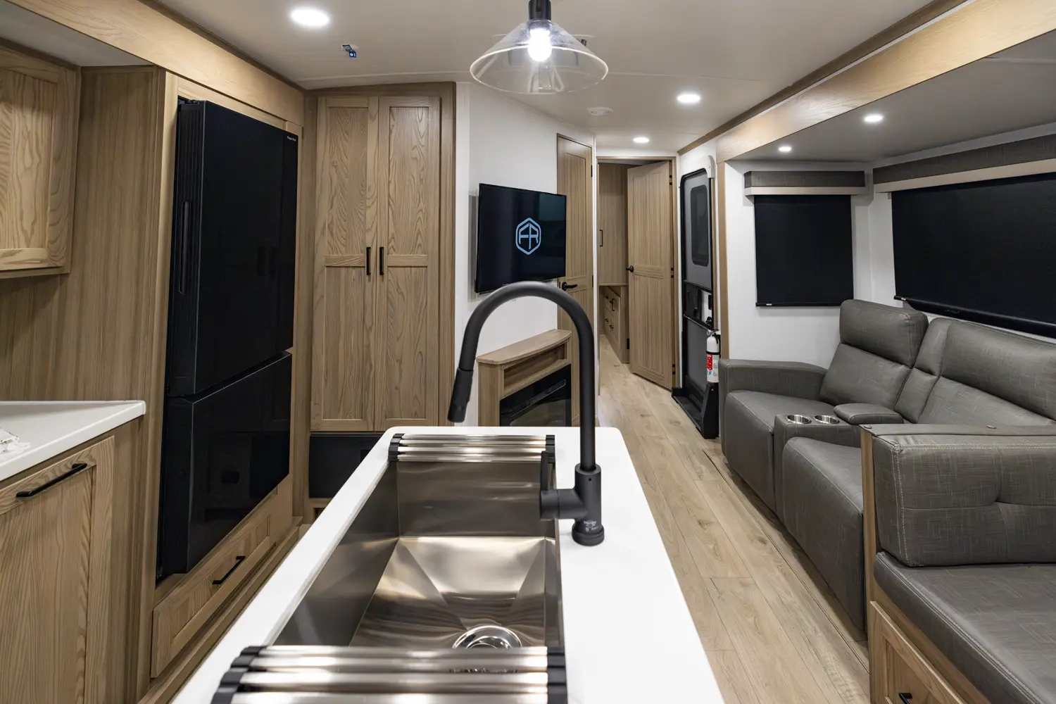 This four slide bunk model has great sleeping arrangements and a U-Dinette that can seat everyone for dinner. The outside camp kitchen has a large refrigerator and cooking stove to feed everyone you are sleeping for the trip. The bunkroom has its own entertainment and hard door for separation from the rest of the coach. The king bed option and the washer and dryer prep make this coach great on every occasion for any family.
