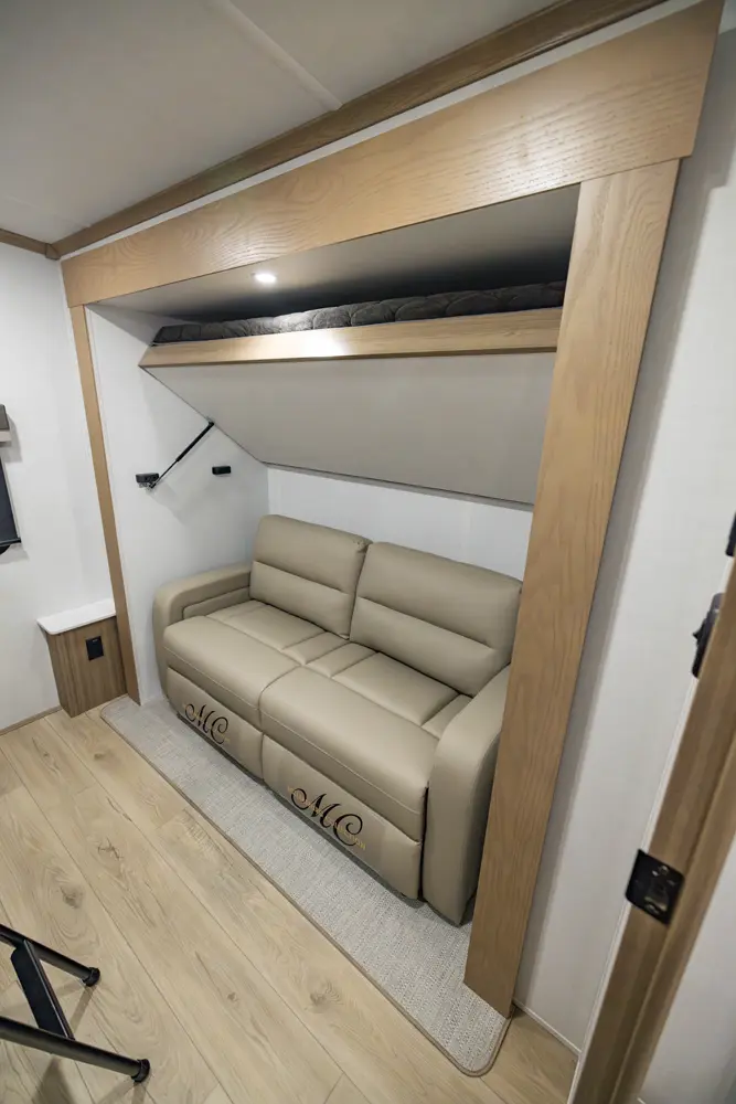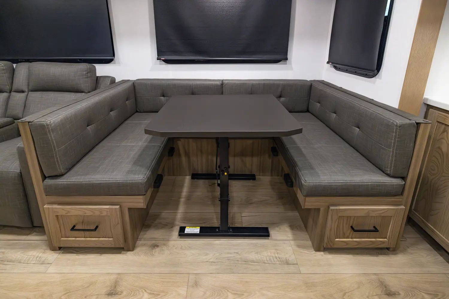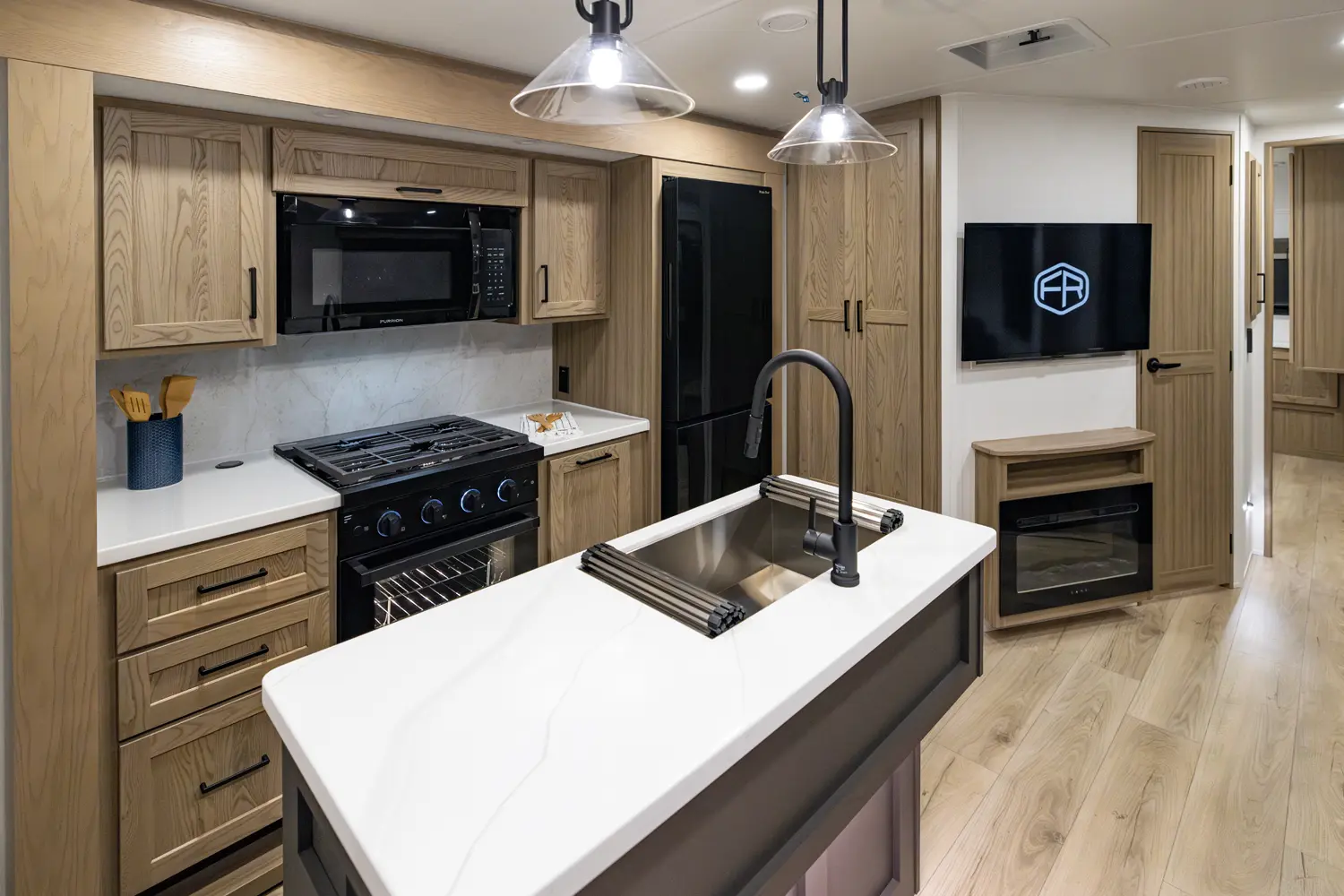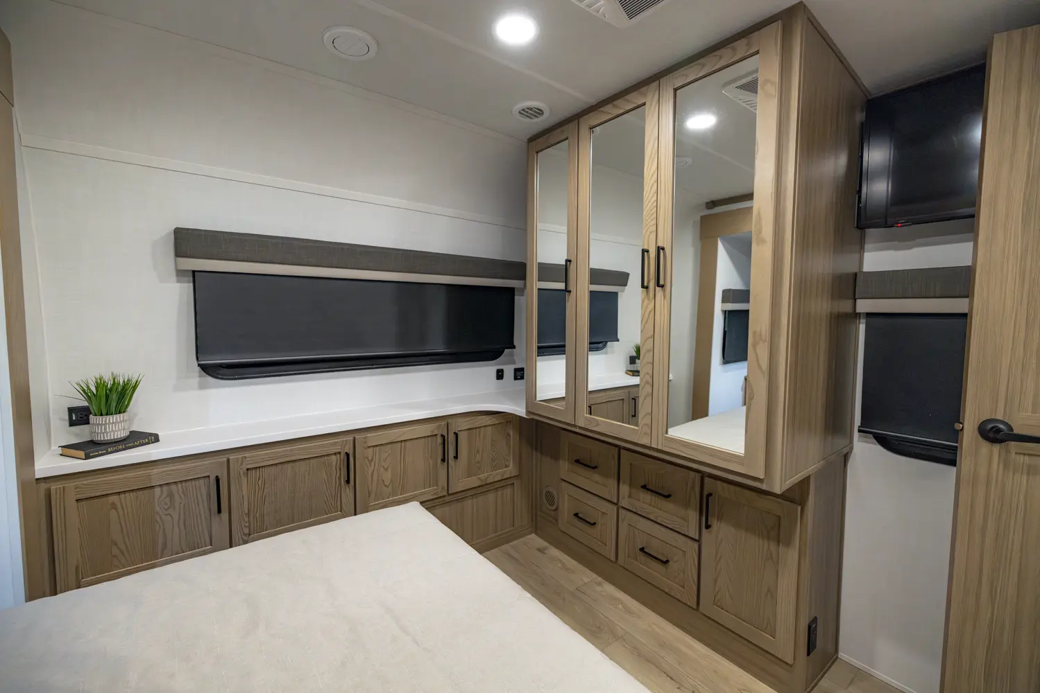 This four slide bunk model has great sleeping arrangements and a U-Dinette that can seat everyone for dinner. The outside camp kitchen has a large refrigerator and cooking stove to feed everyone you are sleeping for the trip. The bunkroom has its own entertainment and hard door for separation from the rest of the coach. The king bed option and the washer and dryer prep make this coach great on every occasion for any family.