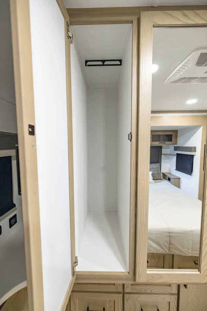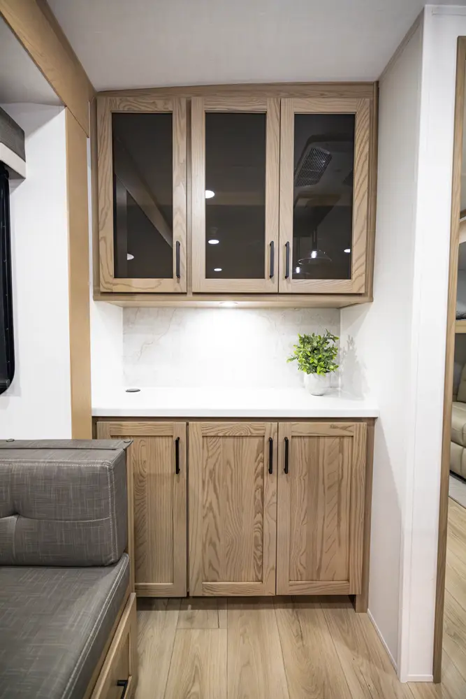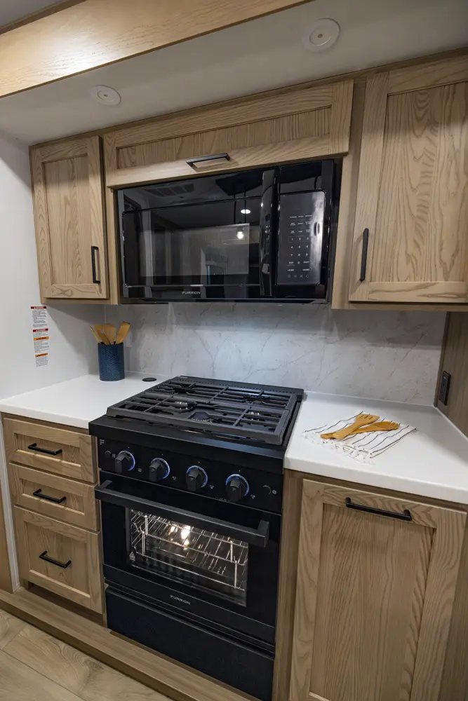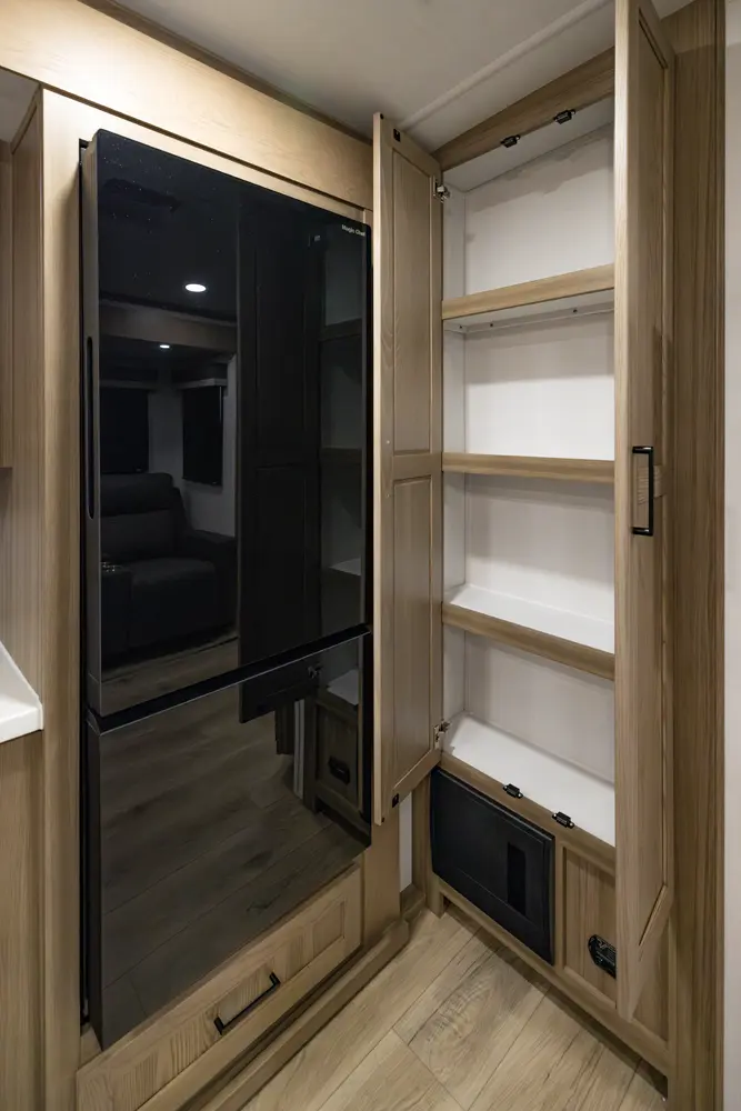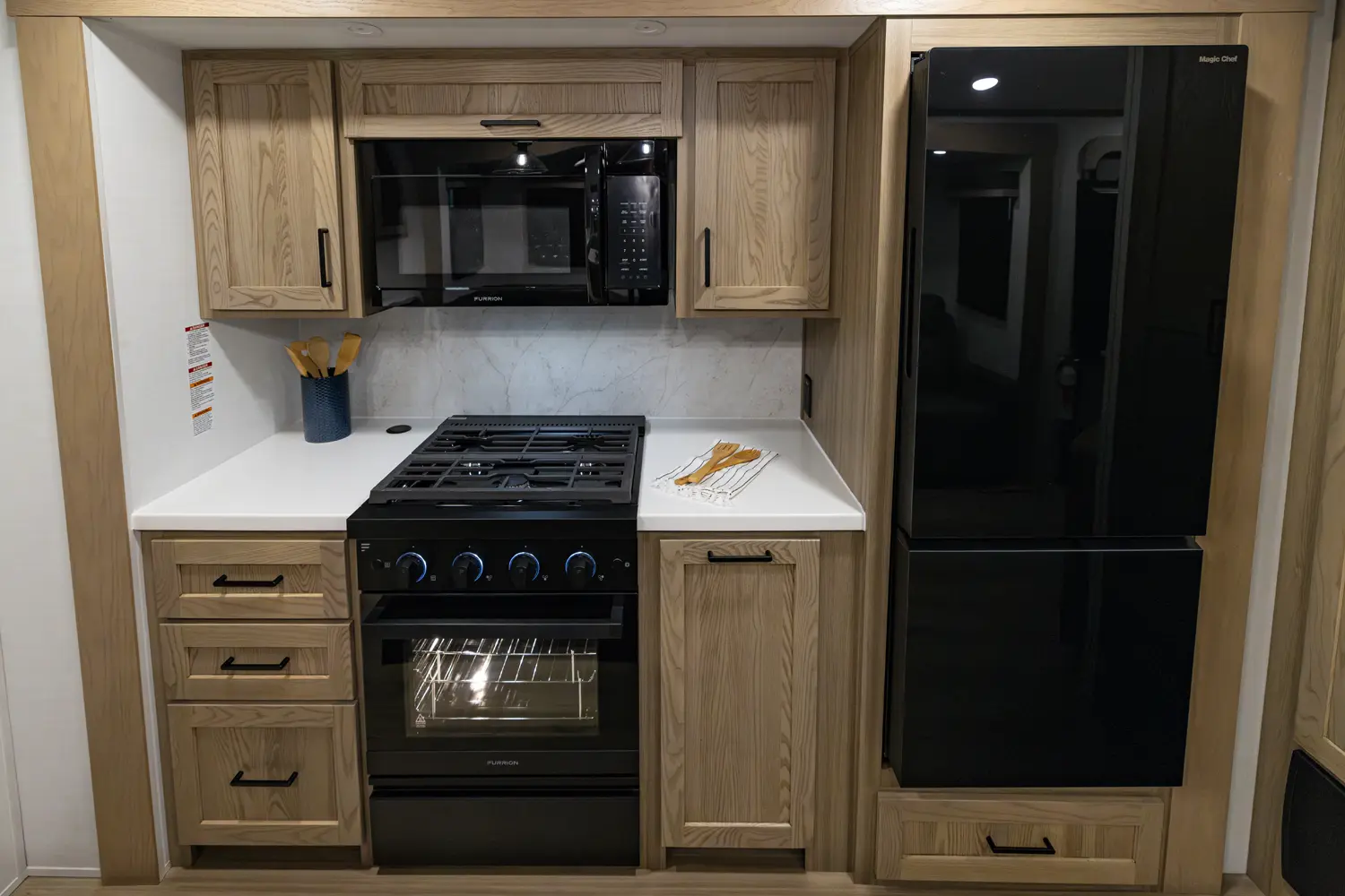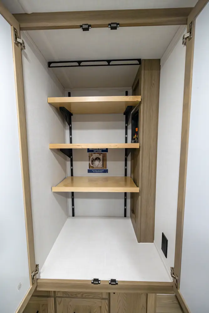 This four slide bunk model has great sleeping arrangements and a U-Dinette that can seat everyone for dinner. The outside camp kitchen has a large refrigerator and cooking stove to feed everyone you are sleeping for the trip. The bunkroom has its own entertainment and hard door for separation from the rest of the coach. The king bed option and the washer and dryer prep make this coach great on every occasion for any family.