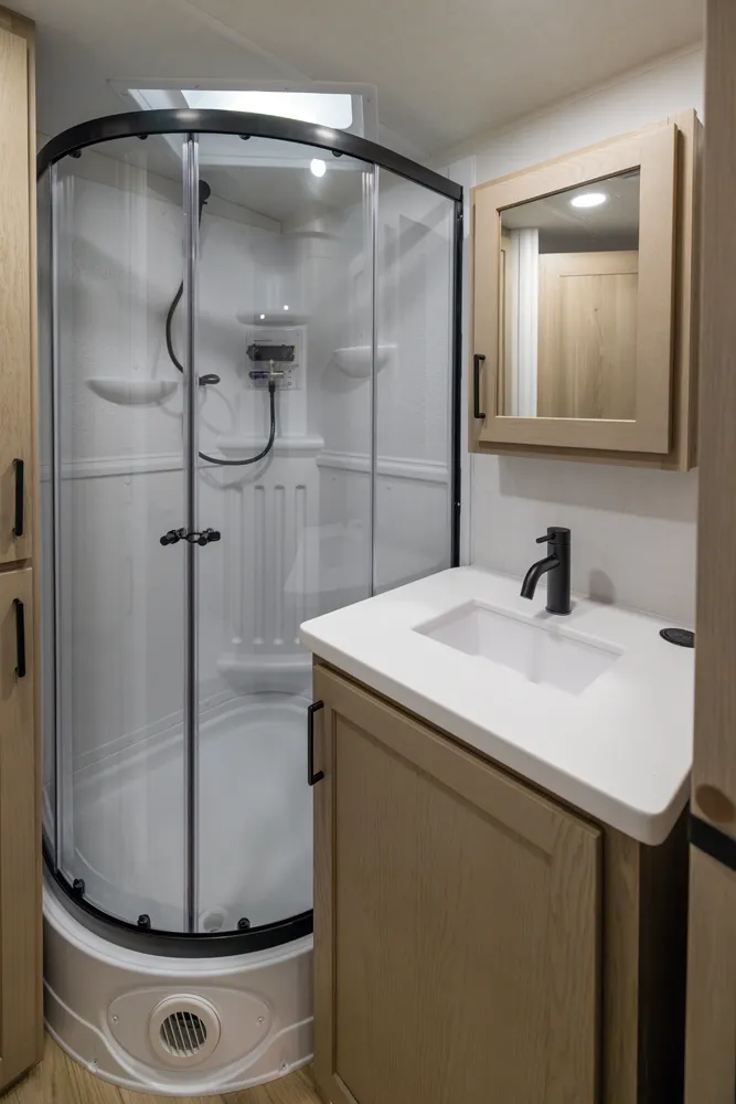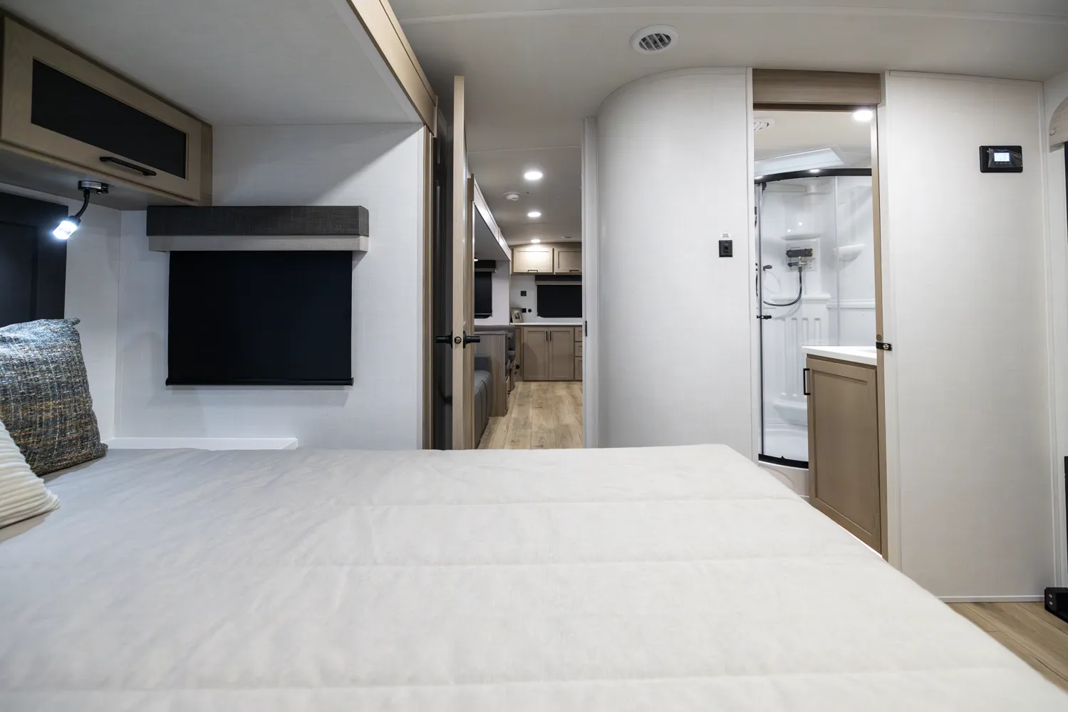 • Platinum Package: Auto Leveling, Frameless Windows, 1800W Inverter, MORryde Strut Assist Entry Step, Dual 30 LP Tanks