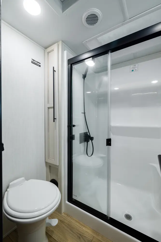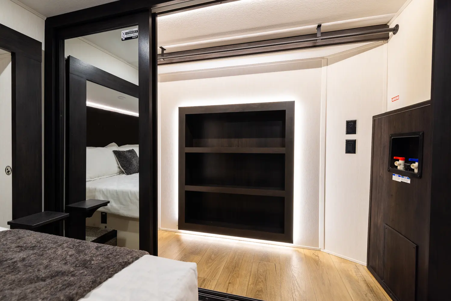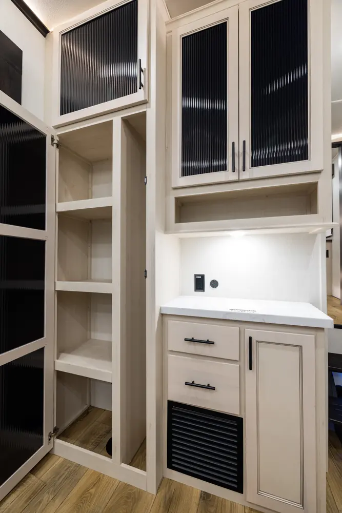 Discover the future of 5th wheel RV living with the Sabre Sundeck 33RLP by Forest River. This innovative RV features an industry-first retractable patio deck, extending your outdoor living space. Inside, you’ll find a L-shaped sectional, perfect for relaxation, and an impressive entertainment center complete with a fireplace. The fully equipped kitchen is a chef’s dream, boasting ample solid surface countertops, a residential-style oven, an air fryer microwave, and a 12-volt refrigerator.