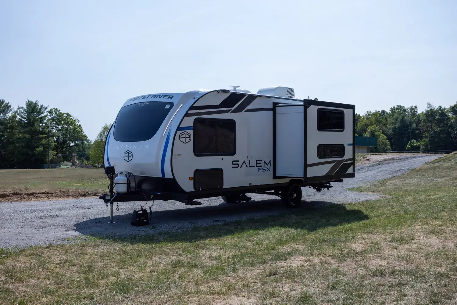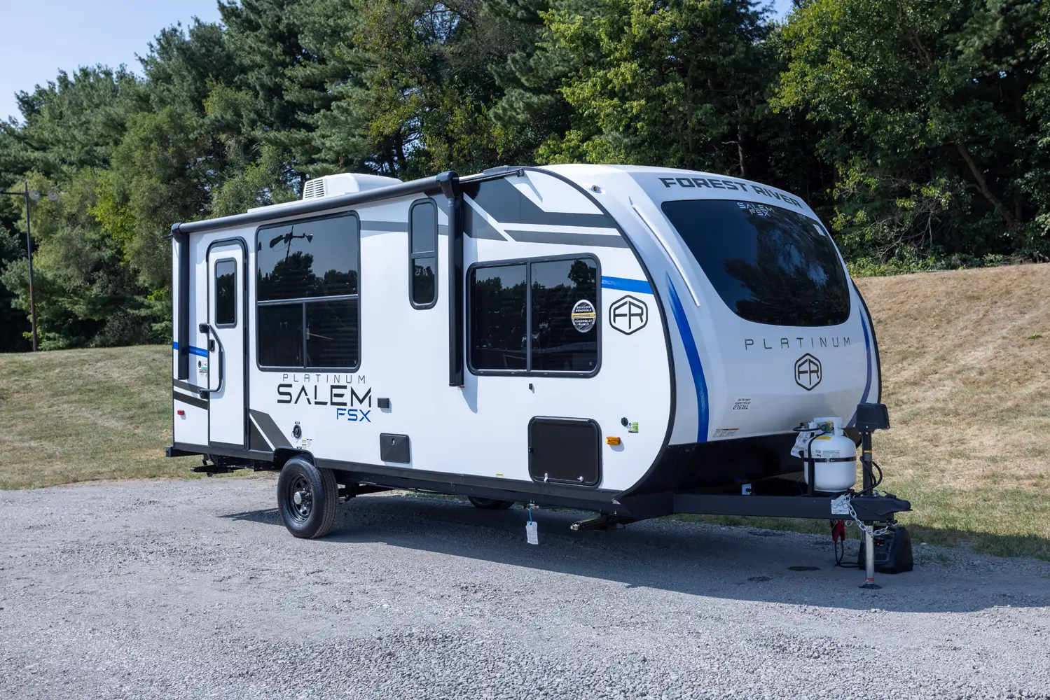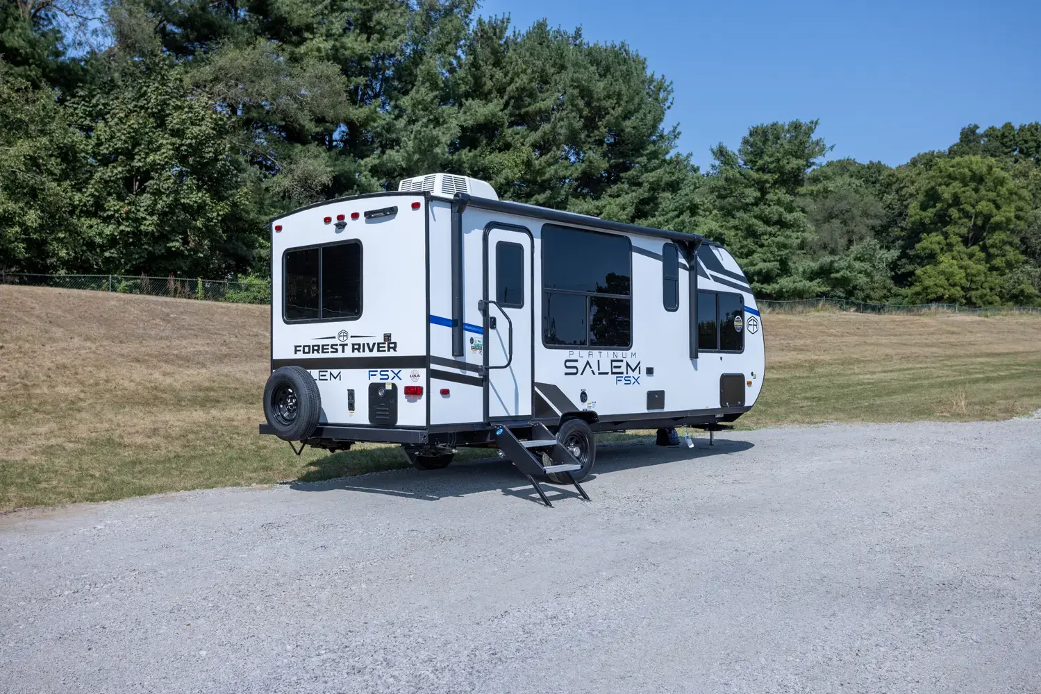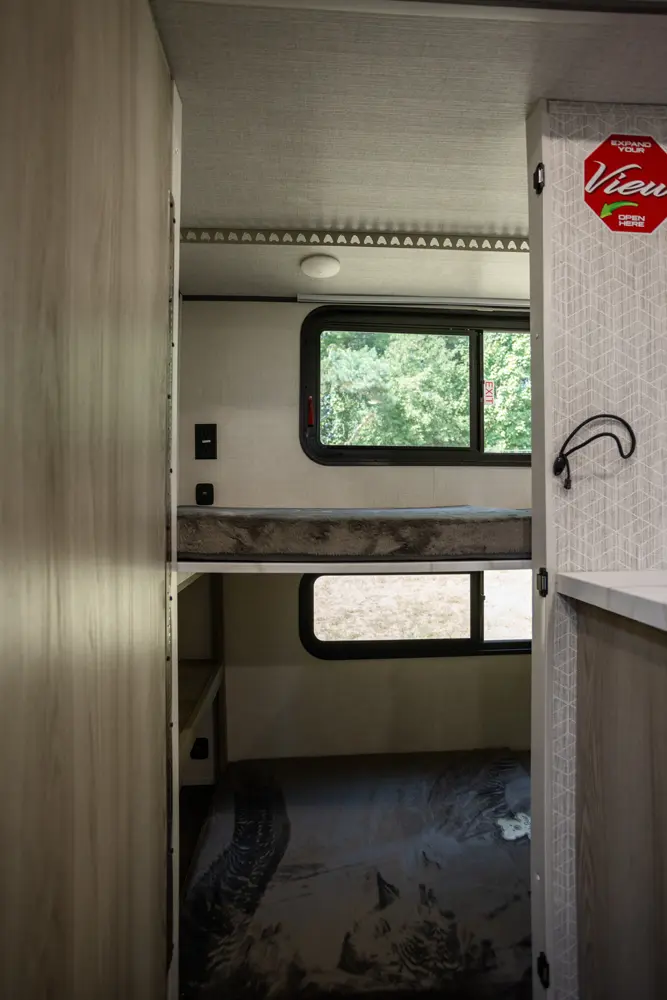 The Salem FSX 165RKS floorplan has one entry and one slide out. Exterior features include: fiberglass exterior and 15' awning. Interiors features include: bunk beds, rear kitchen, front bedroom and pass through bathroom.