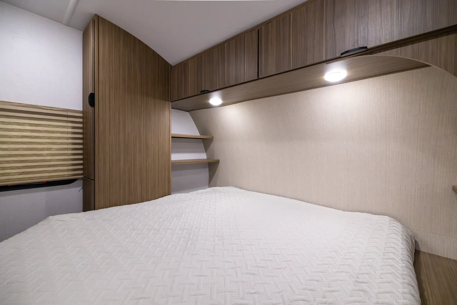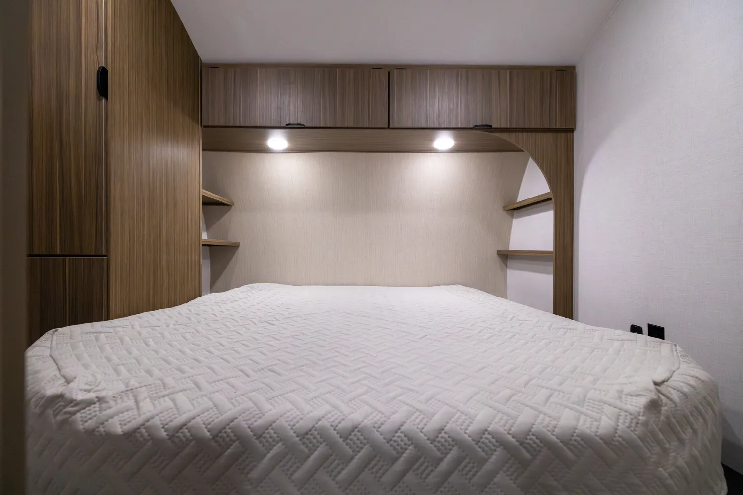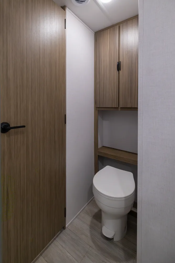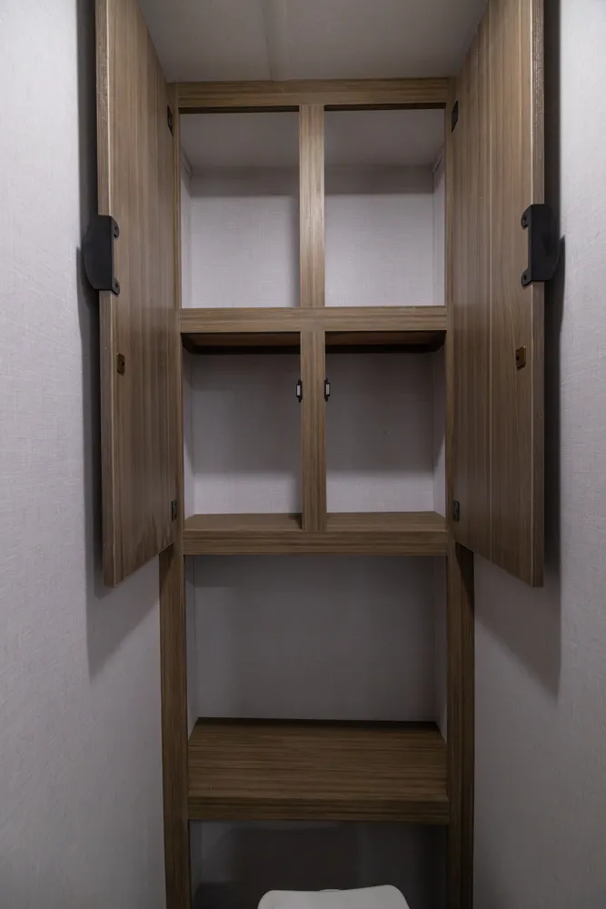 The 260RTK front bedroom provides a queen bed with extra storage, while the adjacent bathroom gives you a large skylight shower and mirrored linen closet. The kitchen provides modern appliances, panoramic window, and faux stone accent wall with entertainment center. Taking the crew on the road? The flip-down sofas and removable dining table in the garage convert to a king bed. Plus, the ramp door doubles as a party patio. At just over 5,000 lb., this toy hauler is ready to roll and easy to tow.