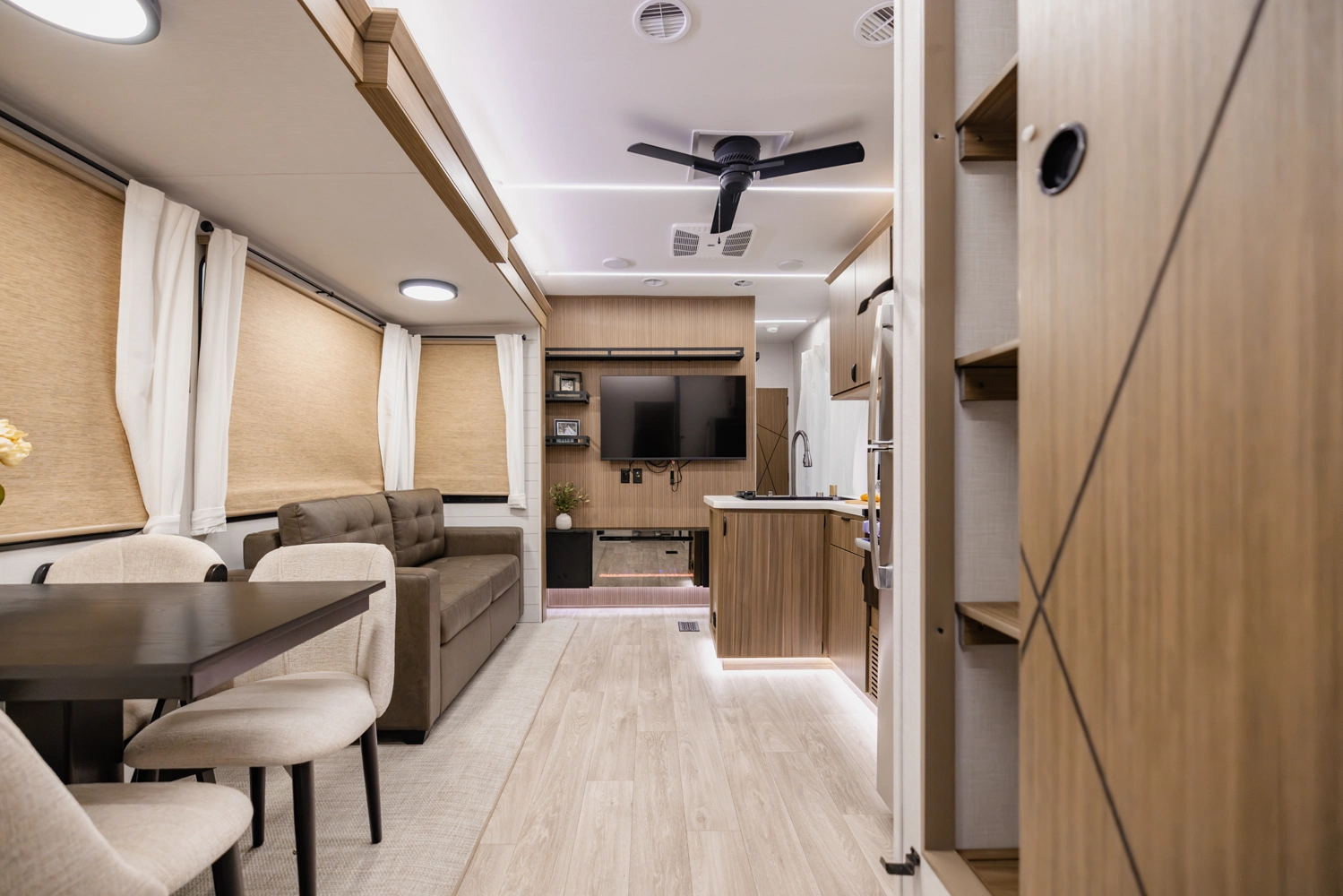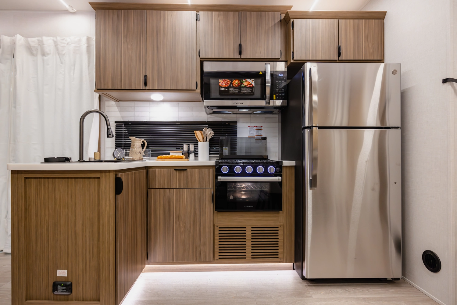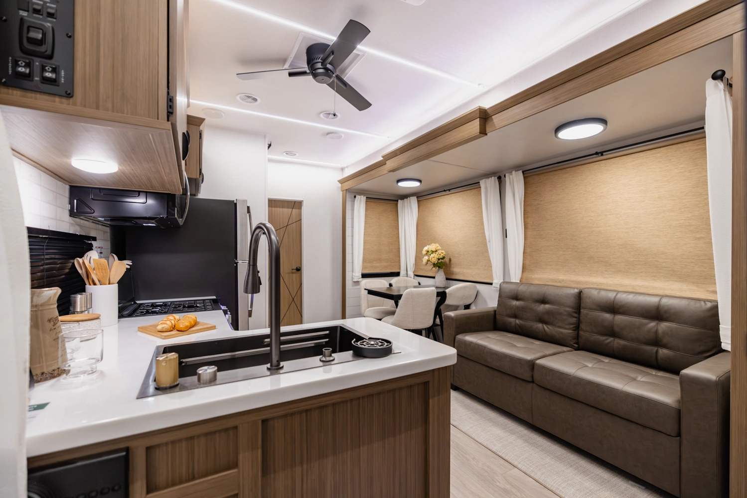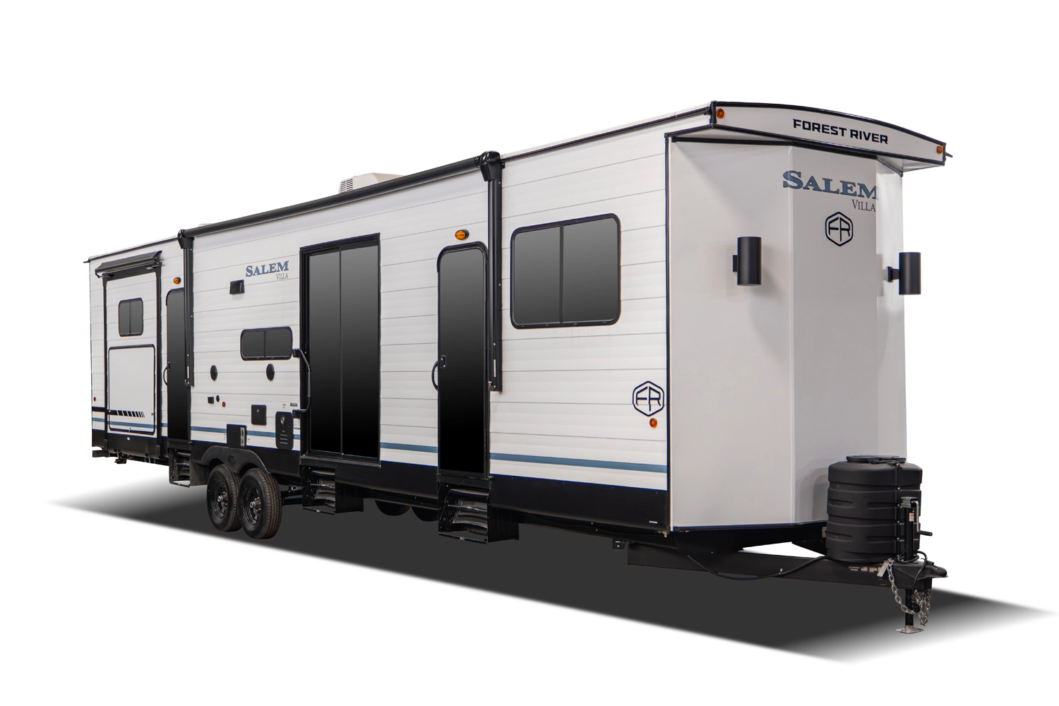 The 42QBQ is the ultimate bunkhouse, with four slides and an outdoor kitchen. The large front queen bedroom includes plenty of closet and cabinet space, while the adjacent bathroom gives you a walk-in radius shower. The living area features panoramic windows, fireplace (heater), and a tri-fold sofa. The bunk room provides 3 bunks plus the Versa-Queen giving the option of having another bunk, sofa, or queen bed. Do not forget the half bath with convenient door to the outside.