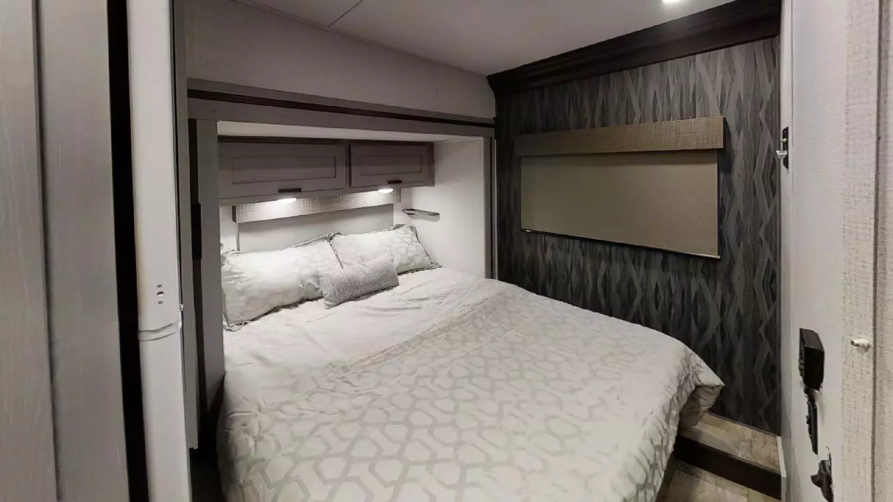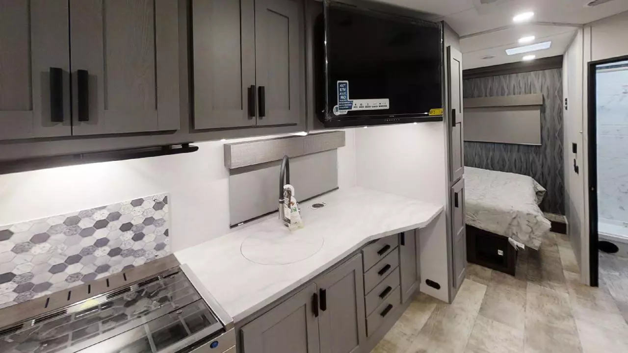 Enjoy at home comforts while on the road with a work station below the 12V TV and flush floors in the bedroom and living area. The rear corner bathroom features a 24" x 32" shower with skylight for natural lighting. The kitchen area is fully equipped with a 10.7 cu ft 12V refrigerator, recessed 3-burner range with flush glass cover, and a 1.3 cu ft convection microwave oven. Overhead cabinets provide additional storage. The 60" x 80" bunk over cab provides room for sleeping and a 12V LED TV.