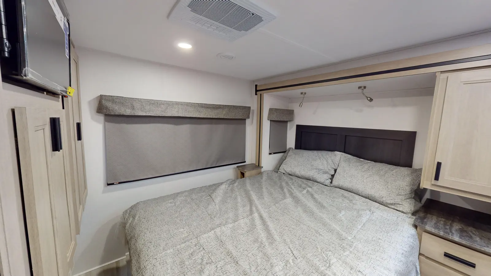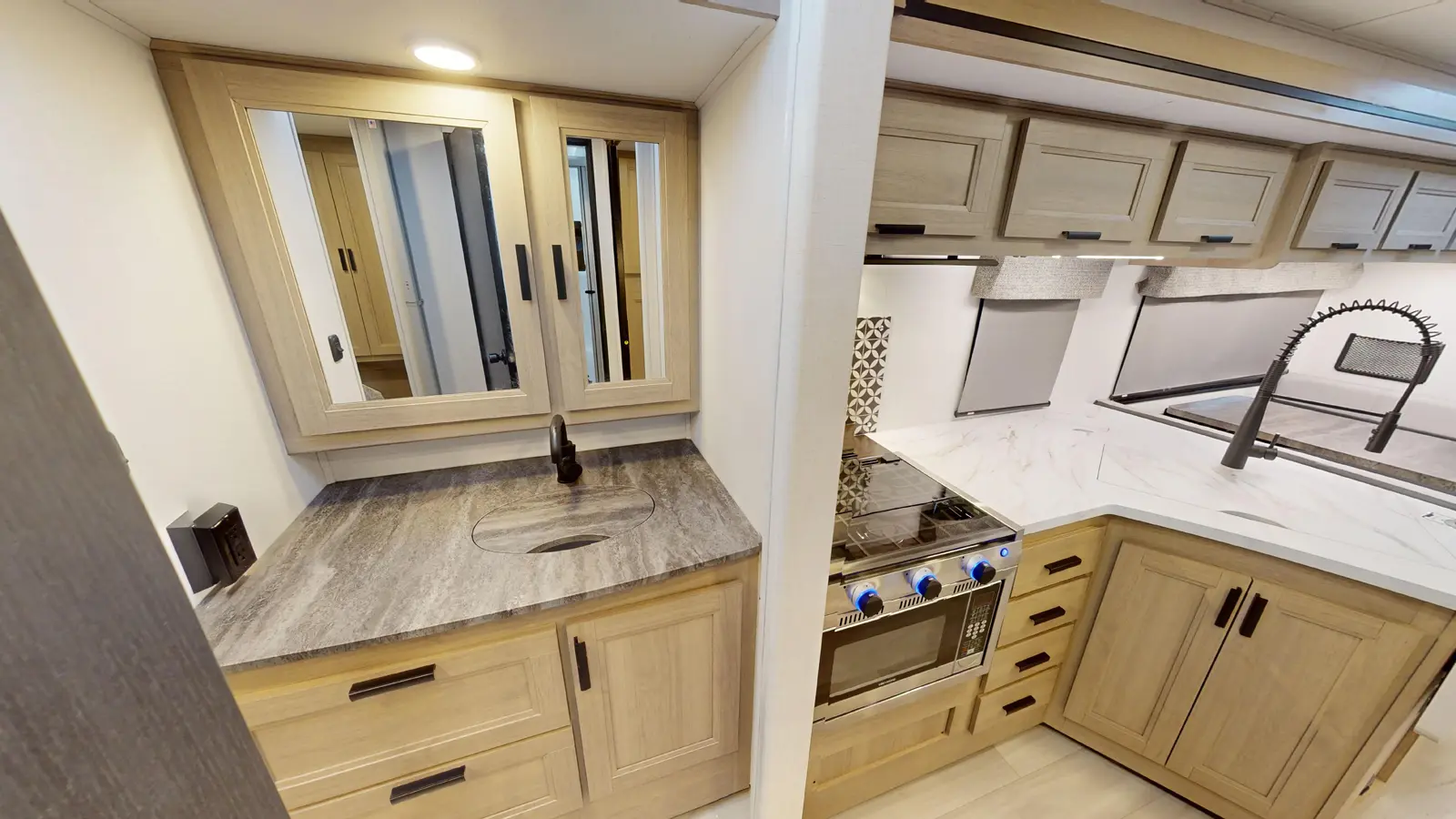 The 3050S has a large slideout, providing more room in the bedroom, bathroom, and main living are. The bedroom features a 60" x 80" bed, and storage wall with two wardrobes, drawers, and 12V TV. The kitchen is centrally located with a pantry, 12V refrigerator, cooktop, convection microwave, and flip-up countertop extension. A booth dinette is next to the kitchen counter. Choose between a sofa and theater seating, depending on your needs. Plus, enjoy a 60" x 80" cab over bunk for sleep/storage.