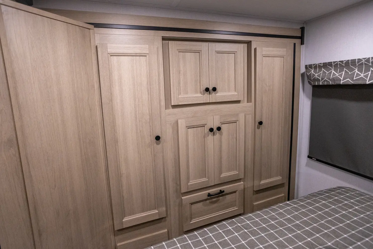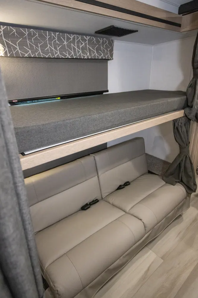The 3250DSLE is a bunkhouse model. There's a 28" x 72" flip-down bunk above with a kids' sofa sleeper that folds out to a bed below. The adults can enjoy their own sleeping area in the rear. The bathroom offers a 24" x 32" shower with tub, along with linen storage. The kitchen is set up to maximize space, while a booth dinette and sofa provide additional seating and sleeping areas. In front, a 60" x 80" cab over bunk gives you even more space! Built on the Ford E450 Chassis.