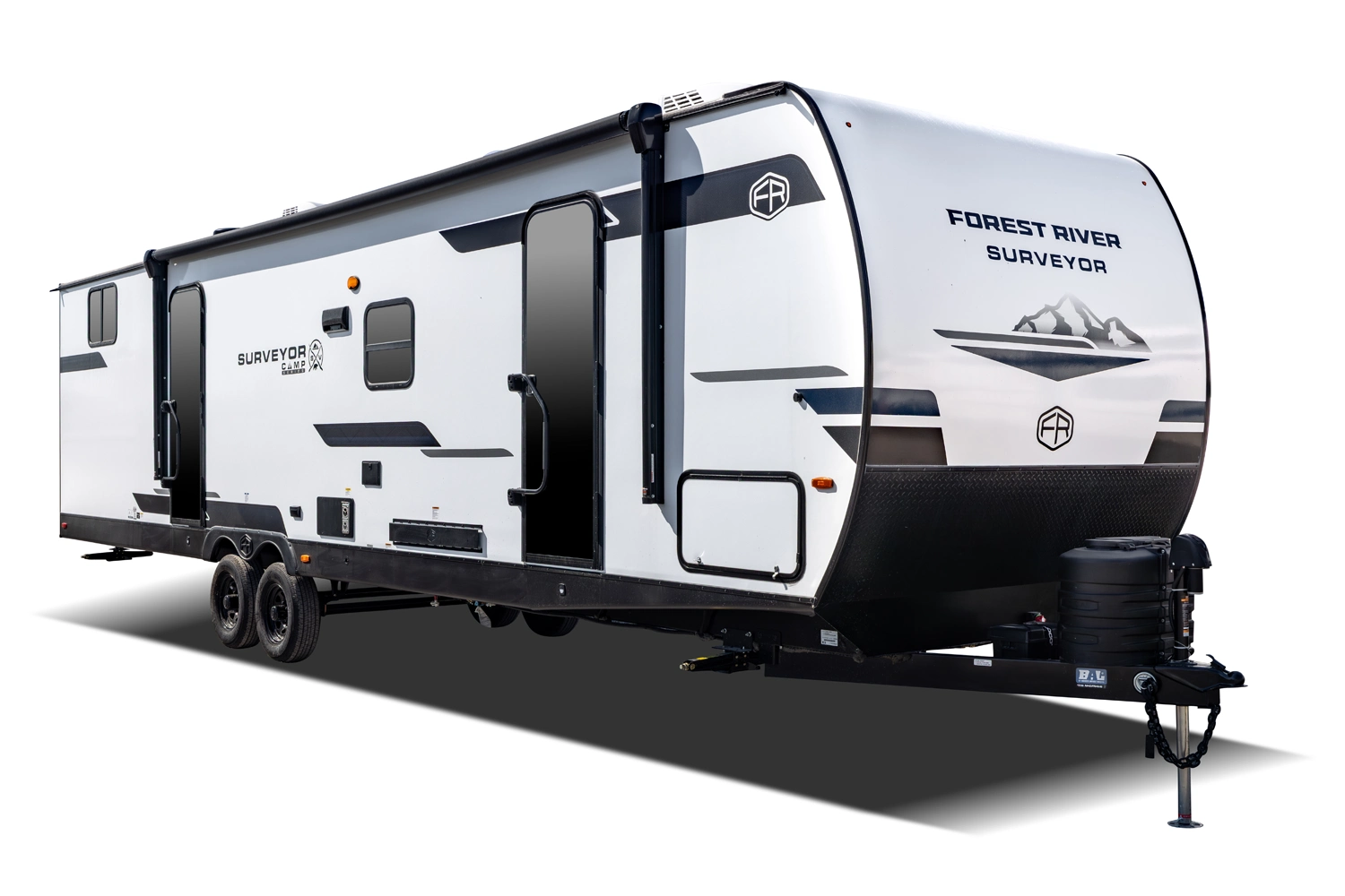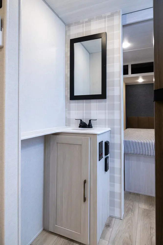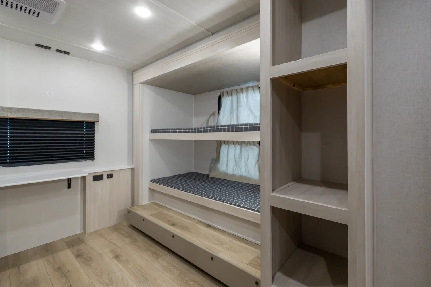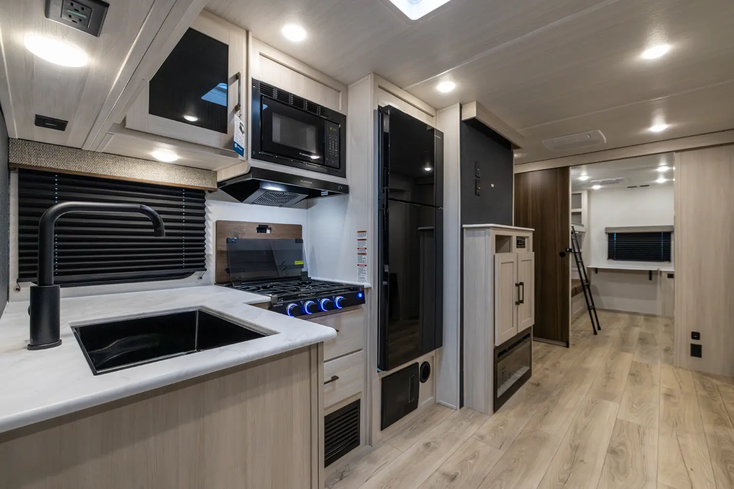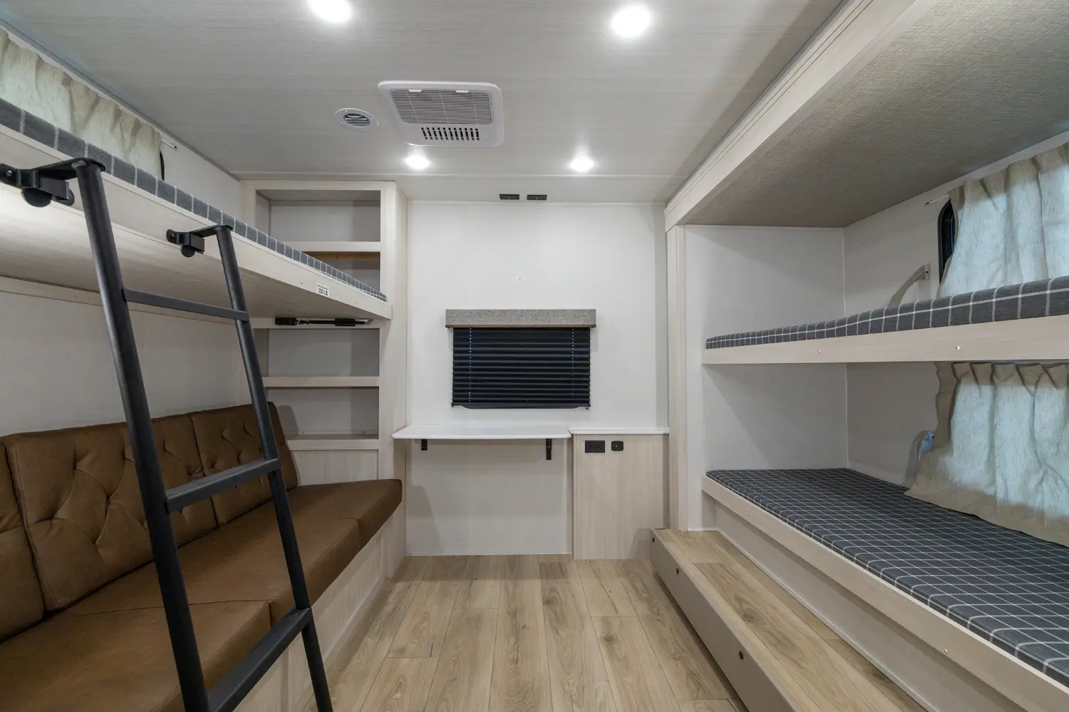 This 37' 11" travel trailer features a front private bedroom with a queen bed and ample storage. The rear private bunkhouse offers two full-size bunks and a wardrobe. The kitchen includes a 10 cu. ft. 12V refrigerator, oven, and stovetop. Living space includes a sofa and booth dinette. Exterior amenities include a 21' electric awning, outdoor camp kitchen, and a hot & cold spray port.