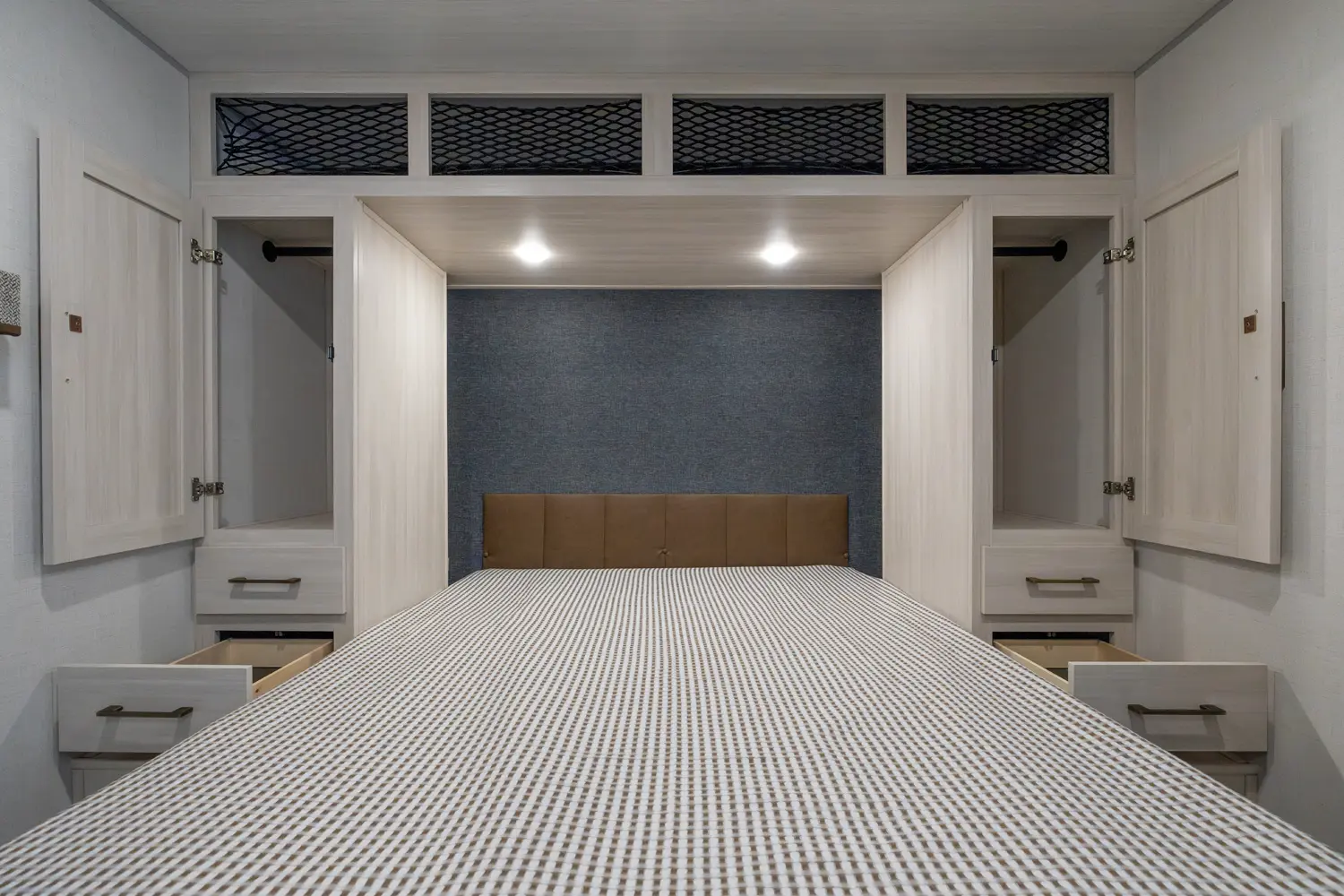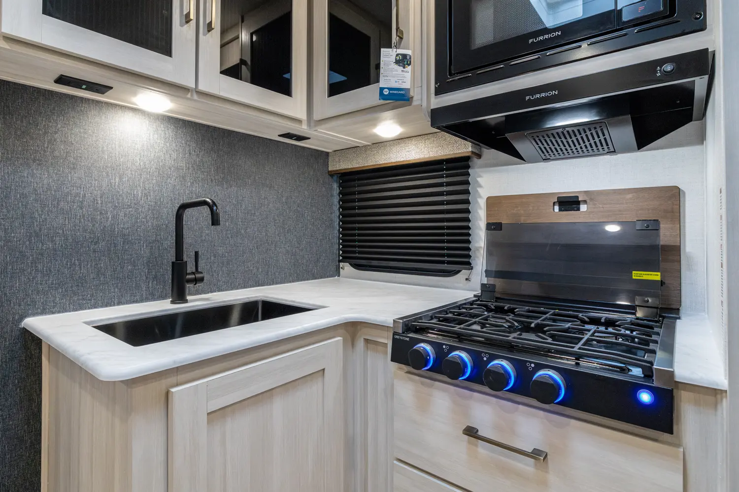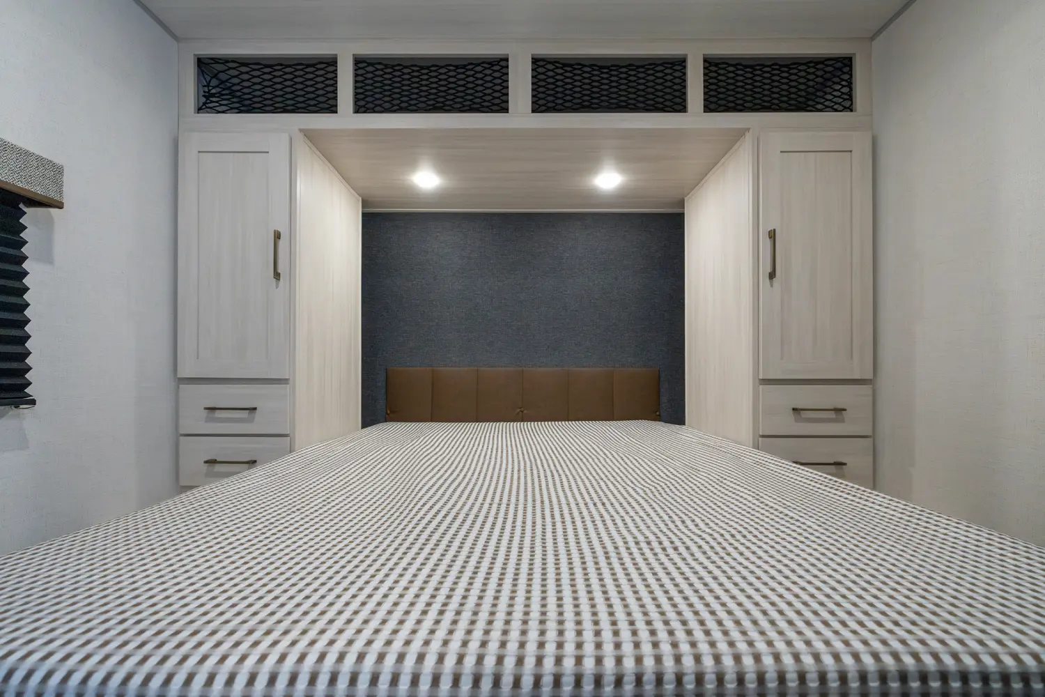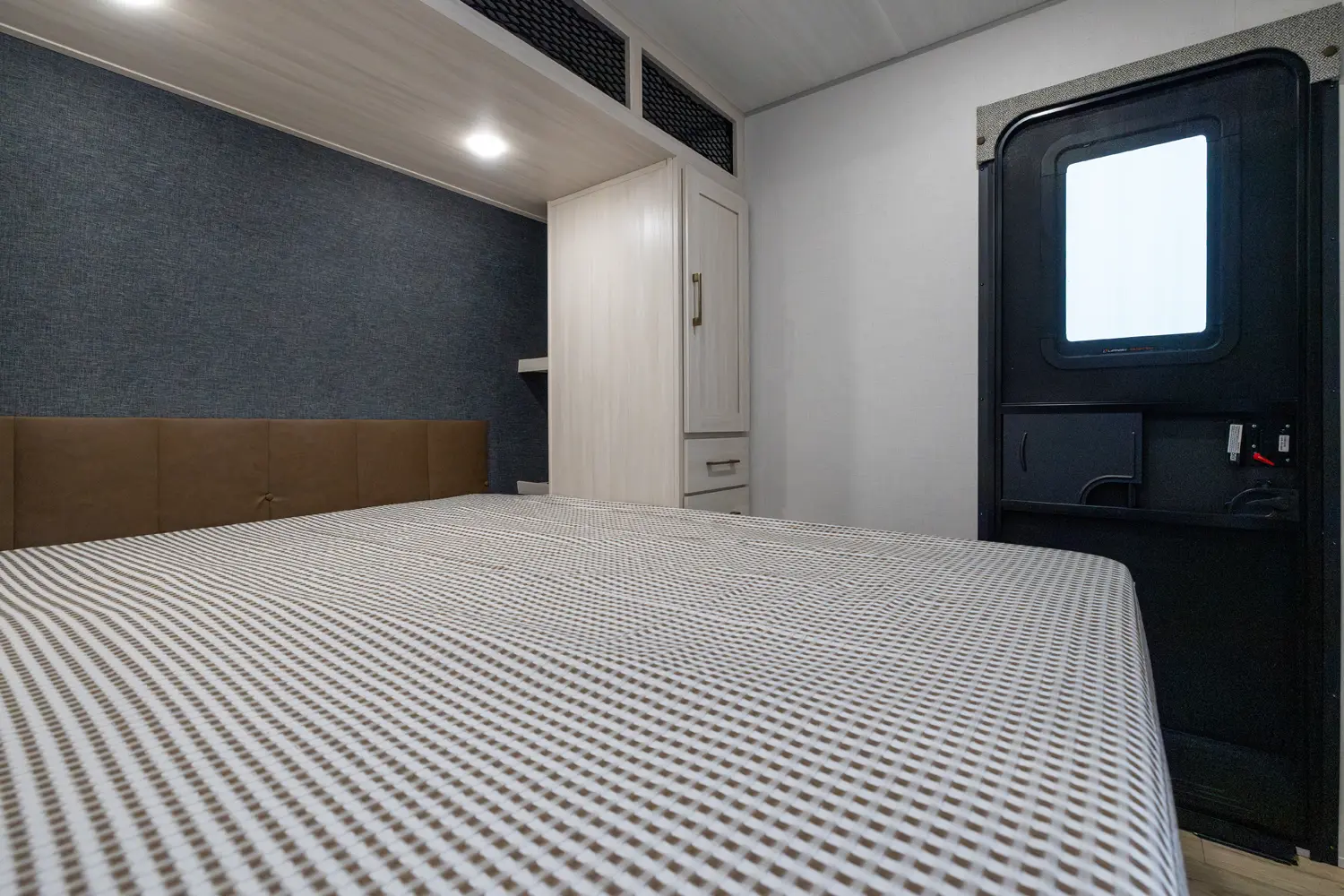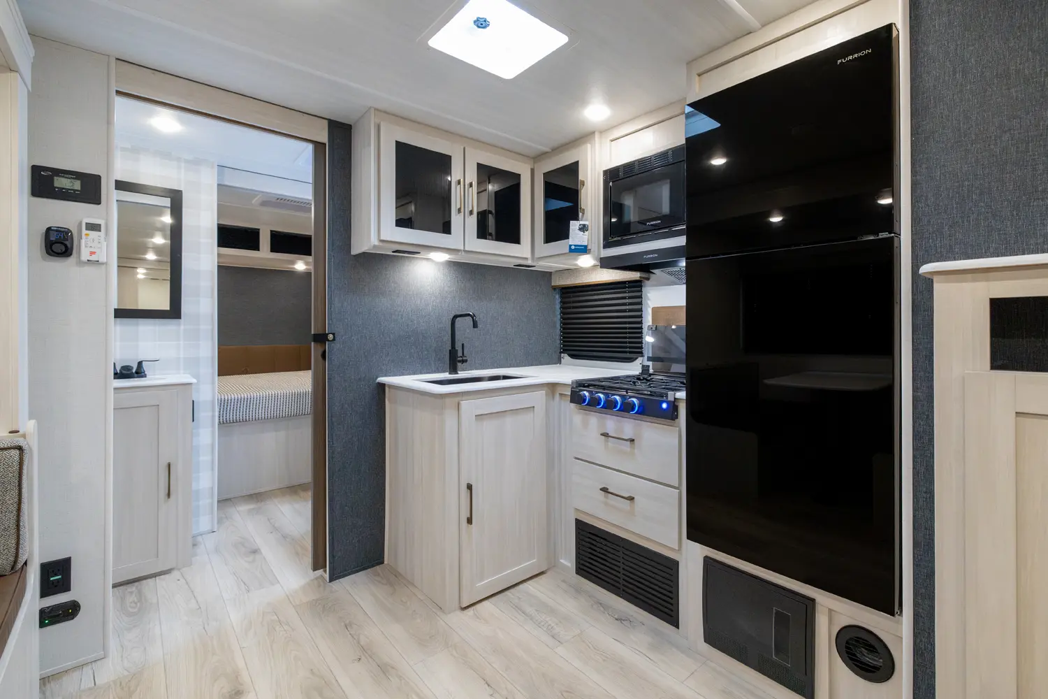 This 37' 11" travel trailer features a front private bedroom with a queen bed and ample storage. The rear private bunkhouse offers two full-size bunks and a wardrobe. The kitchen includes a 10 cu. ft. 12V refrigerator, oven, and stovetop. Living space includes a sofa and booth dinette. Exterior amenities include a 21' electric awning, outdoor camp kitchen, and a hot & cold spray port.