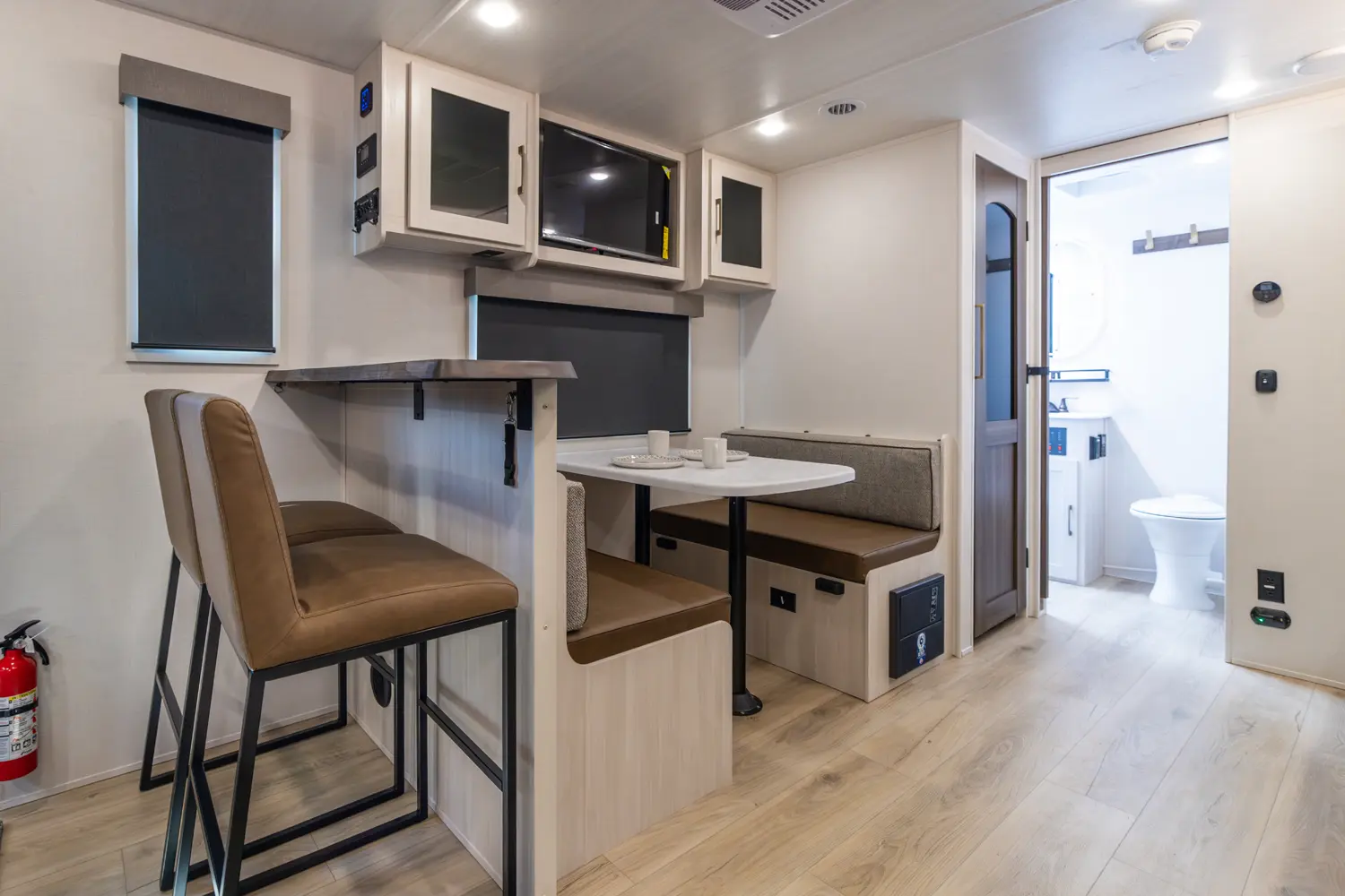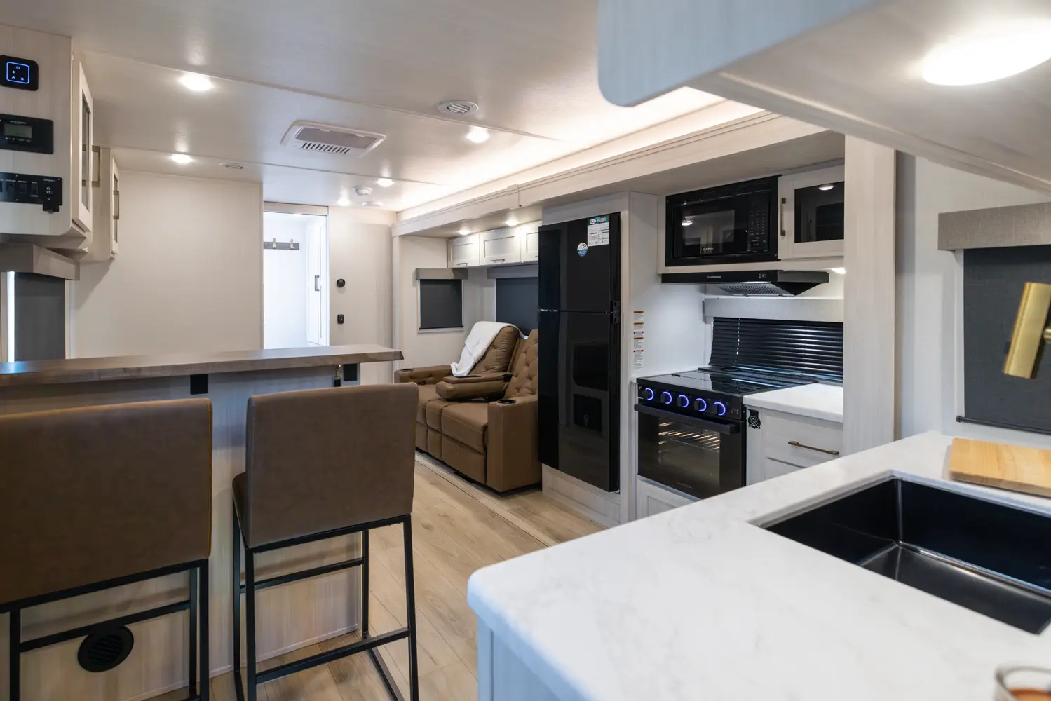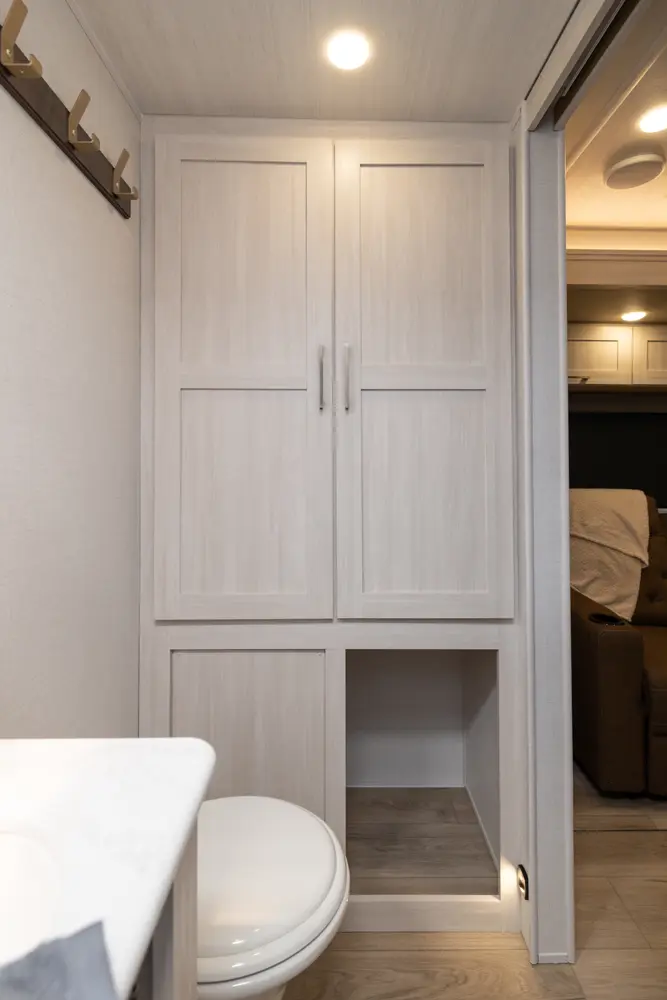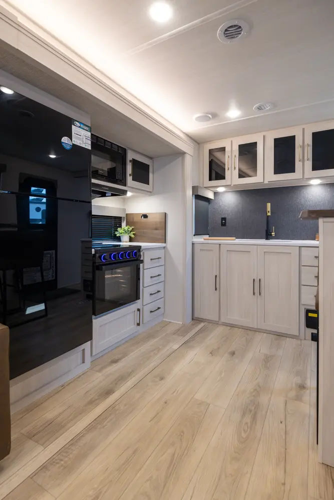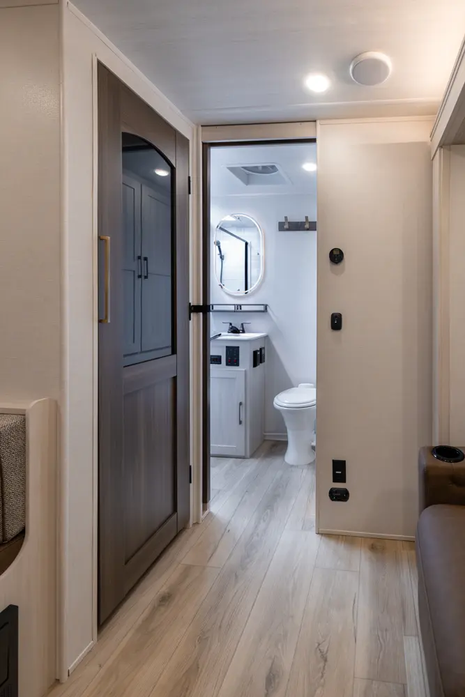 This 30' 9" travel trailer features a rear bathroom with a shower, toilet, and sink. The kitchen includes a 10 cu. ft. 12V refrigerator and stovetop. Living space includes an EZ-Out sofa bed, breakfast bar and dinette. The front private bedroom offers a queen bed with dual wardrobes and overhead storage. Exterior amenities include a 21' power awning with LED lights and pass-through storage.