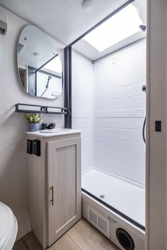 The Un•Mapped 22RB offers a front king bed and full rear bath. The kitchen features a bar top with flip-up window, convection microwave, and 12V refrigerator, plus a bar-to-table conversion for flexible dining. Inside, theater seating provides comfort, while outside, enjoy a TrailGate outdoor bar, 19' power awning, and hot & cold spray port—perfect for compact adventures.