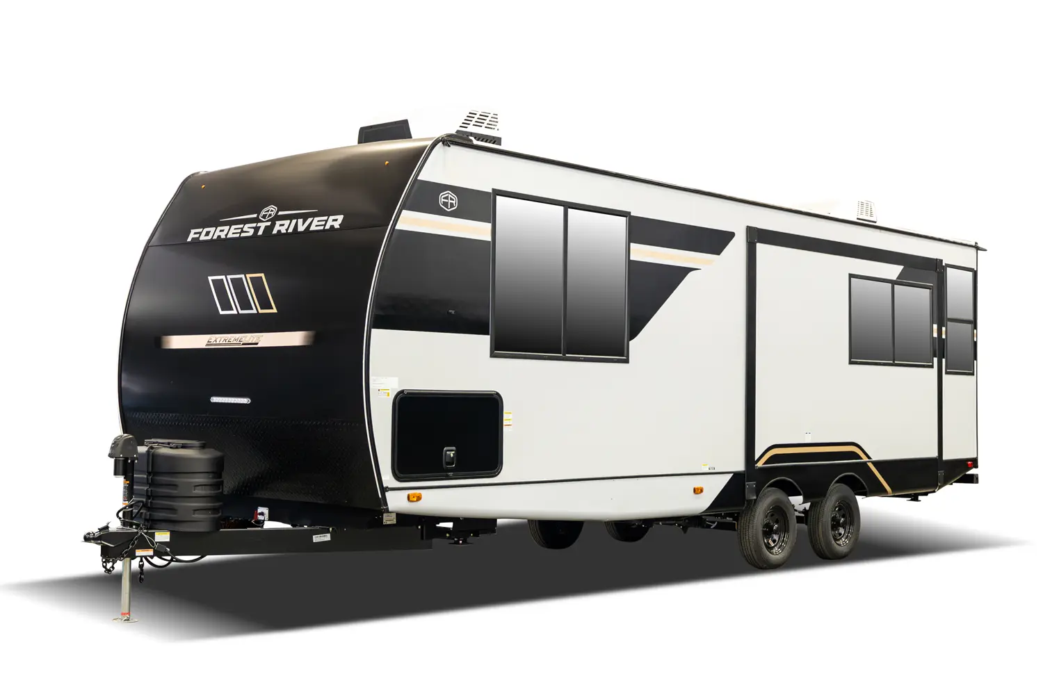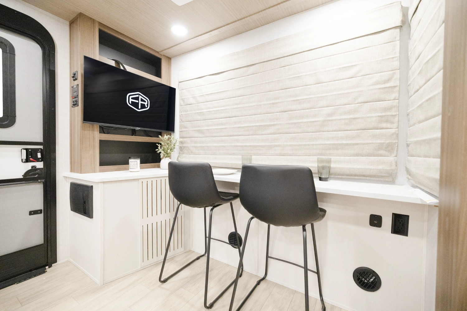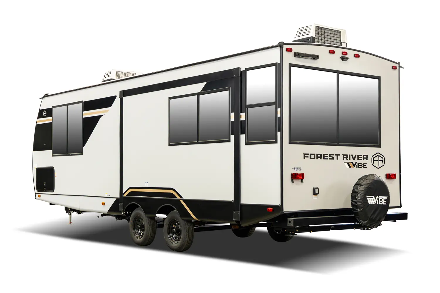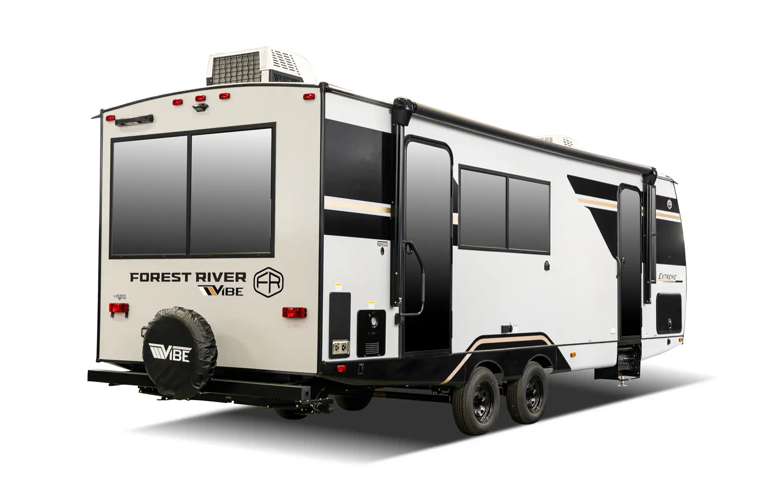 The 2400RB is great for couples who enjoy scenic views from the comfort of their living space. With almost a full panoramic view in part to our European-Style square windows, there is no shortage of natural light with a spacious open feel. The 2400RB comes packed with already added features such as 2 A/Cs, a king bed, porcelain toilet and much more!