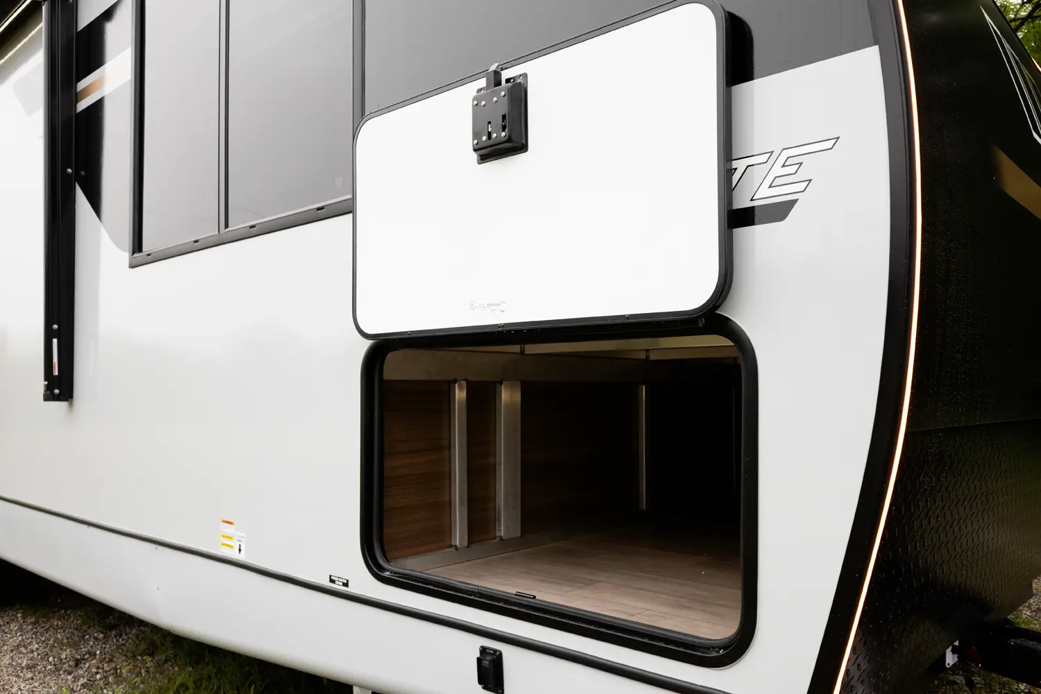 • Universal Docking Station Enclosed in Cargo Storage - Hookups Included: Cable & Satellite Switch, Fresh-Tank Gravity Fill, City Water, Black Tank Flush, Winterization Pump, Outdoor Shower, GFI Outlet, And Space Prepped for Solar Panel Controller