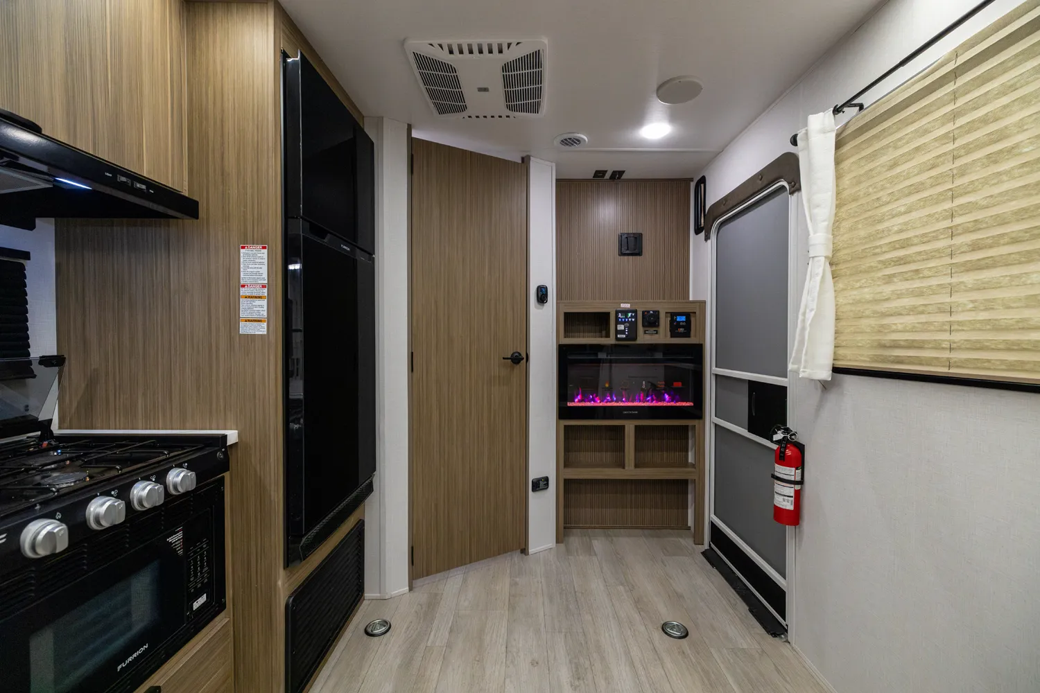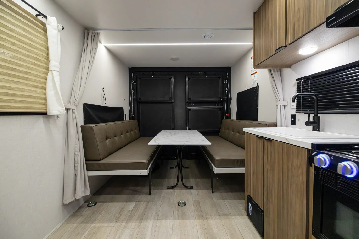The 260RTK front bedroom provides a queen bed with extra storage, while the adjacent bathroom gives you a large skylight shower and mirrored linen closet. The kitchen provides modern appliances, panoramic window, and a faux stone accent wall with entertainment center. Taking the crew on the road? The flip-down sofas and removable dining table in the garage convert to a king bed. Plus, the ramp door doubles as a party patio. At just over 5000 lb, this toy hauler is ready to roll and easy to tow.
