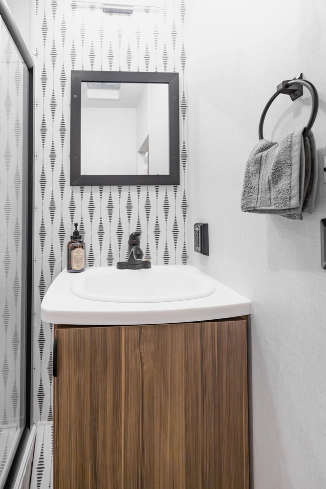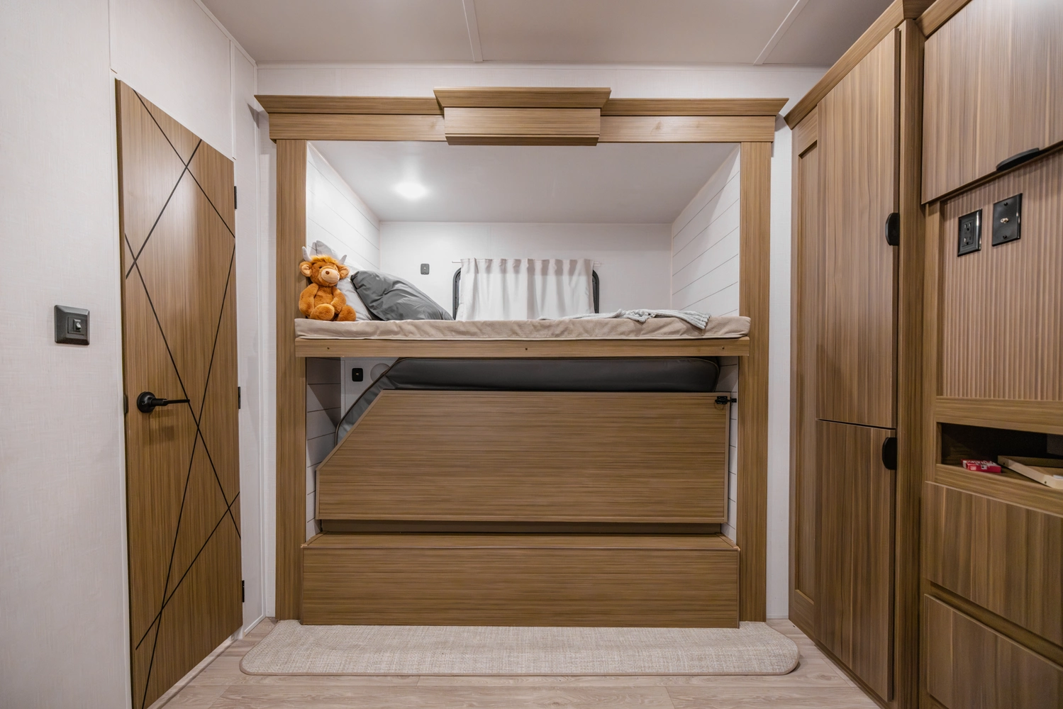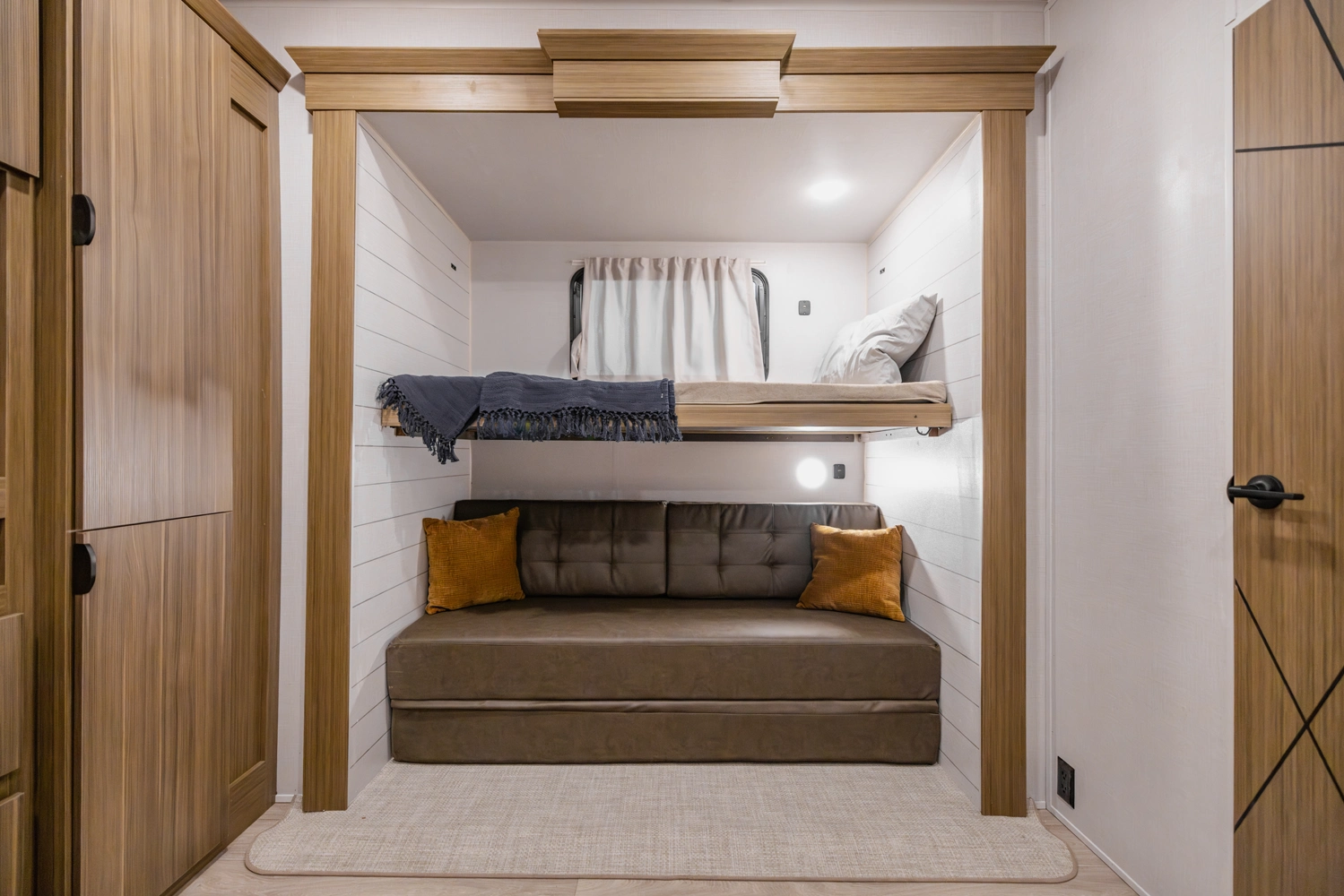The 42QBQ is the ultimate bunkhouse, with four slides and an outdoor kitchen. The large front queen bedroom includes plenty of closet and cabinet space, while the adjacent bathroom gives you a walk-in radius shower. The living area features panoramic windows, fireplace (heater), and a tri-fold sofa. The bunk room provides 3 bunks plus the Versa-Queen giving the option of having another bunk, sofa, or queen bed. Do not forget the half bath with convenient door to the outside.