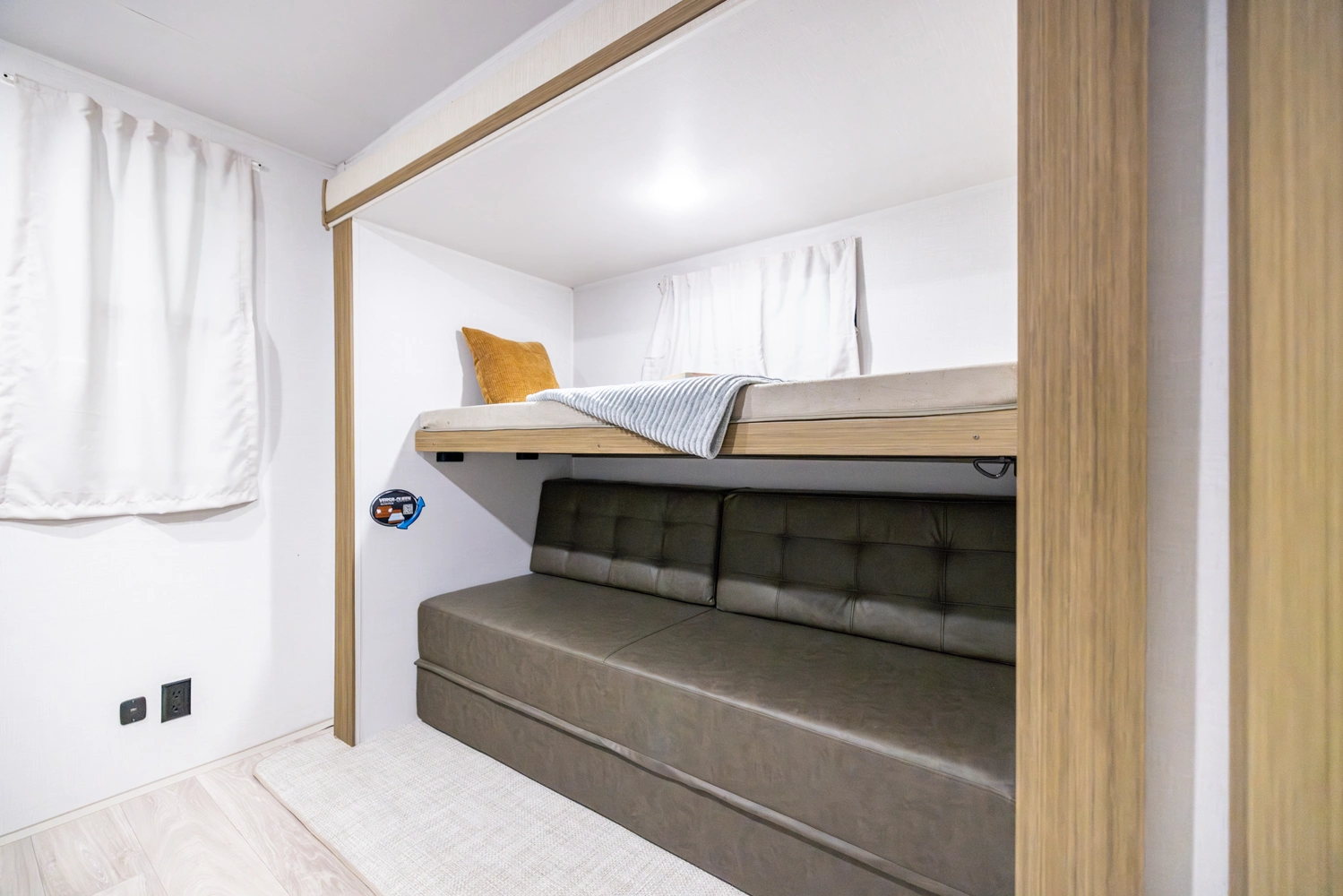 The 32BHDS is the ultimate bunkhouse, with two total slide outs and an outside kitchen. This well-equipped travel trailer features oversized panoramic windows, the ever-popular U-dinette, which you can customize with the adjacent Versa-Lounge. The kitchen includes a 11 CU. FT. refrigerator and stovetop with oven and LED accents, plus cabinets for all your cooking essentials!