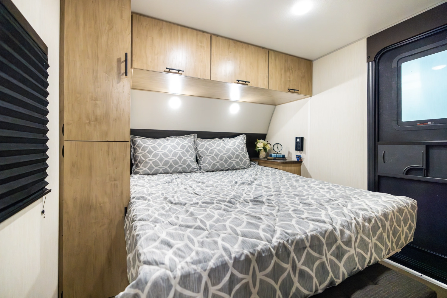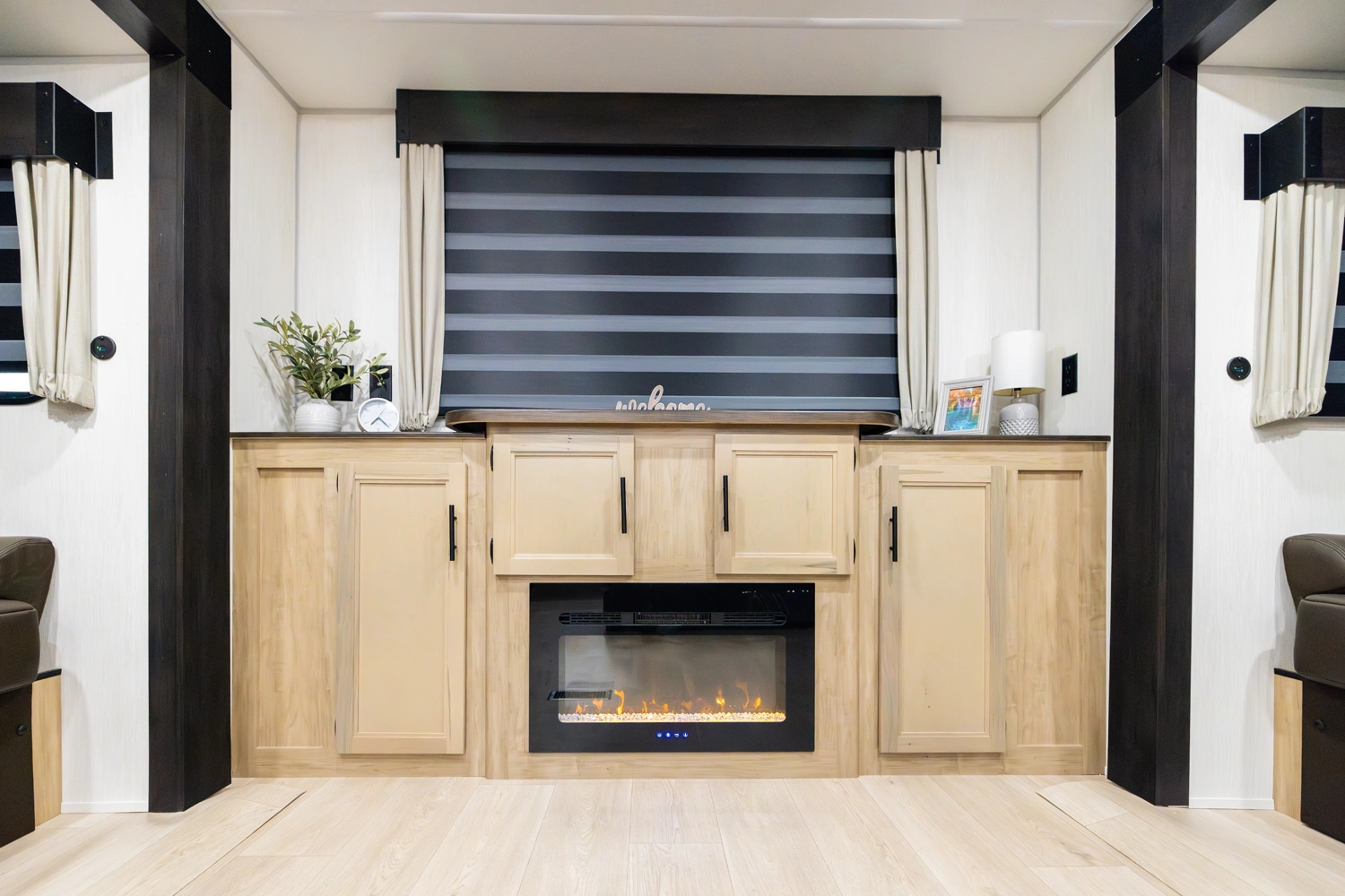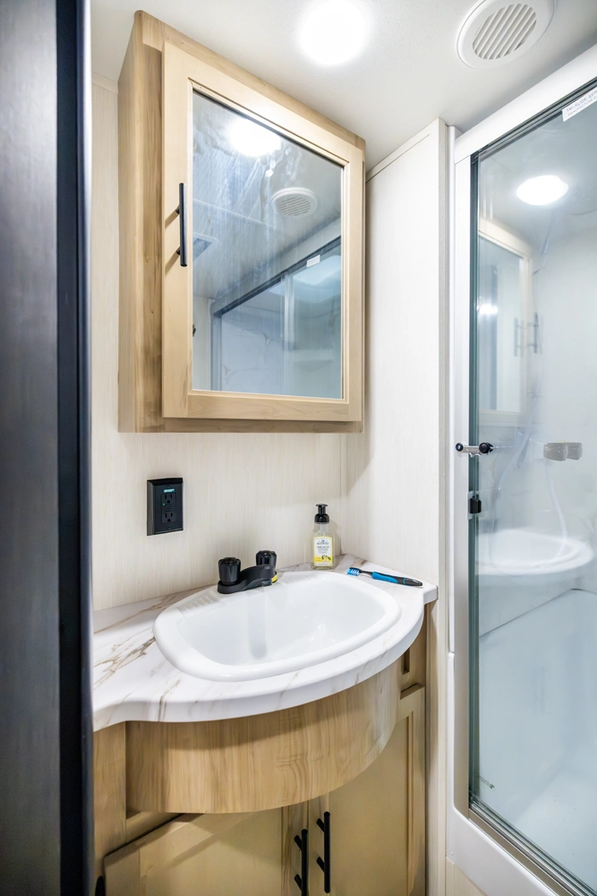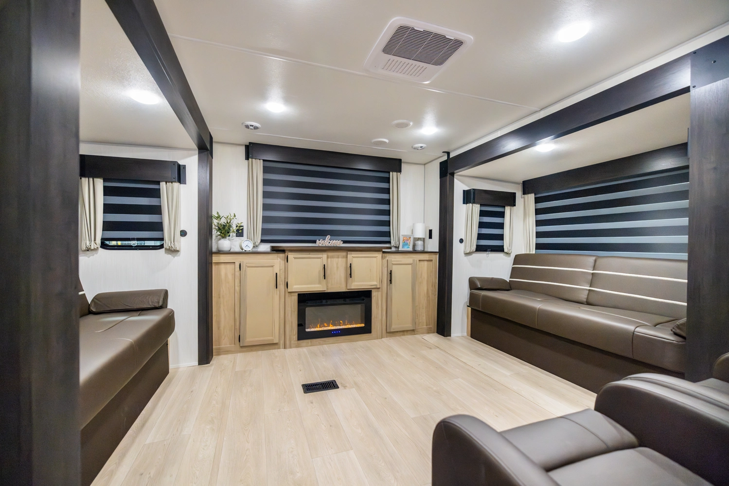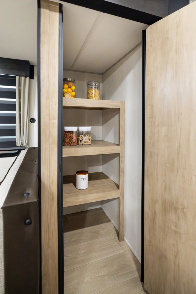 The triple slide is the perfect unit for affordable luxury and livability. The rear entertainment living room is surrounded by panoramic windows as well as two sofa slide and two recliners. The chef’s kitchen, kitchen bar with stools, and dinette slide with slide out drawers and full door pantry offer meet the needs of any chef. The private master suite completes the interior. Outside enjoy the camp kitchen, outside entertainment speakers, and TV bracket under our power awning.