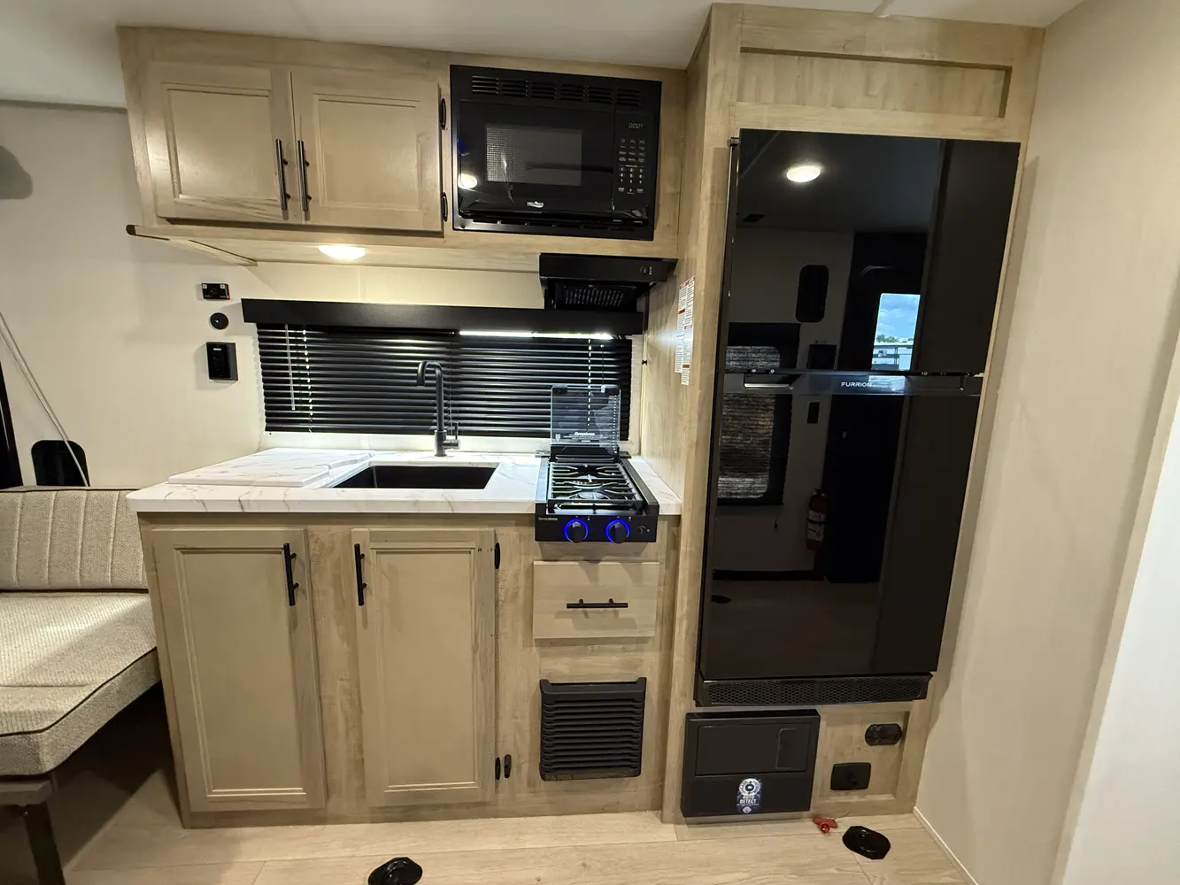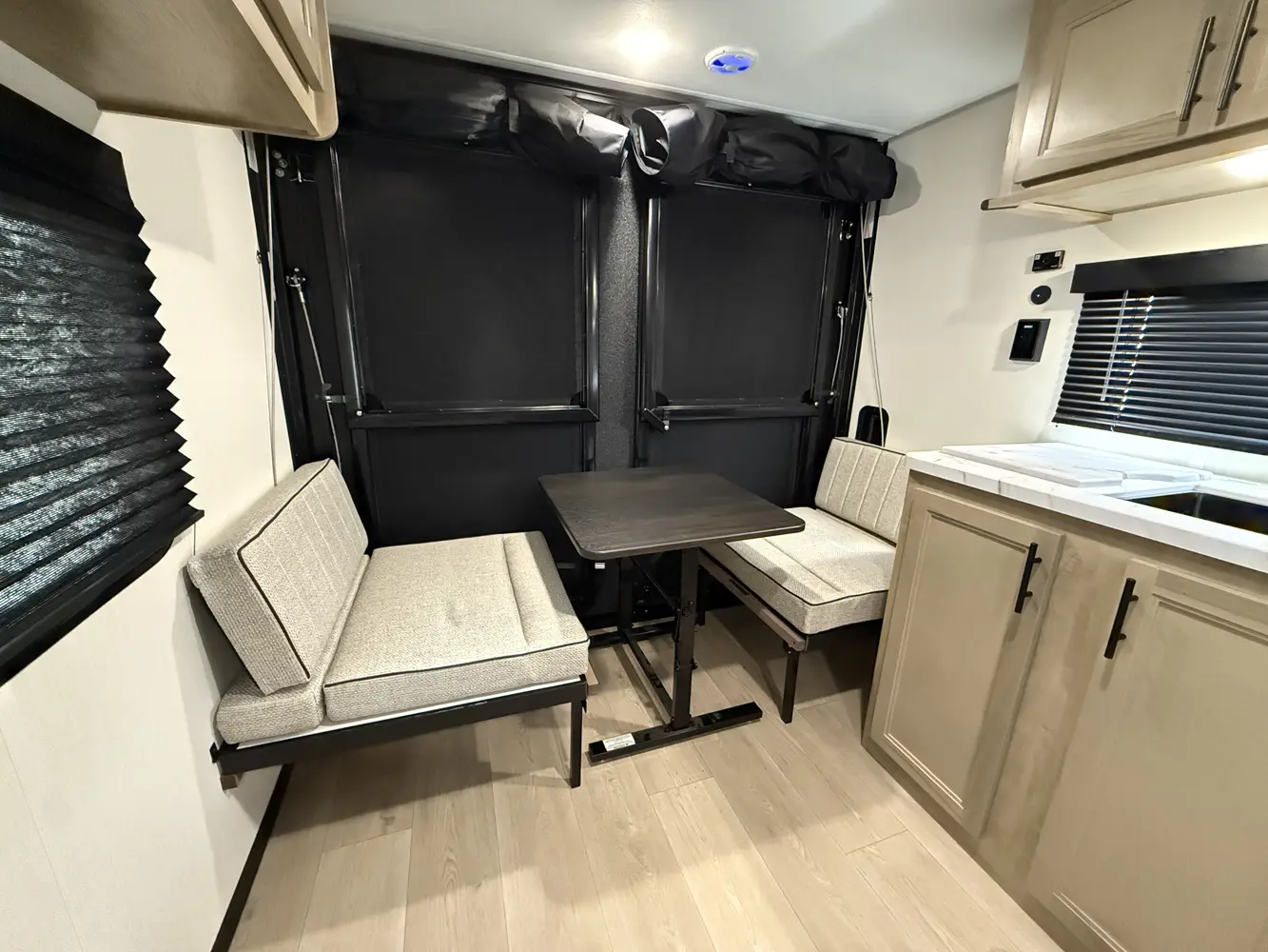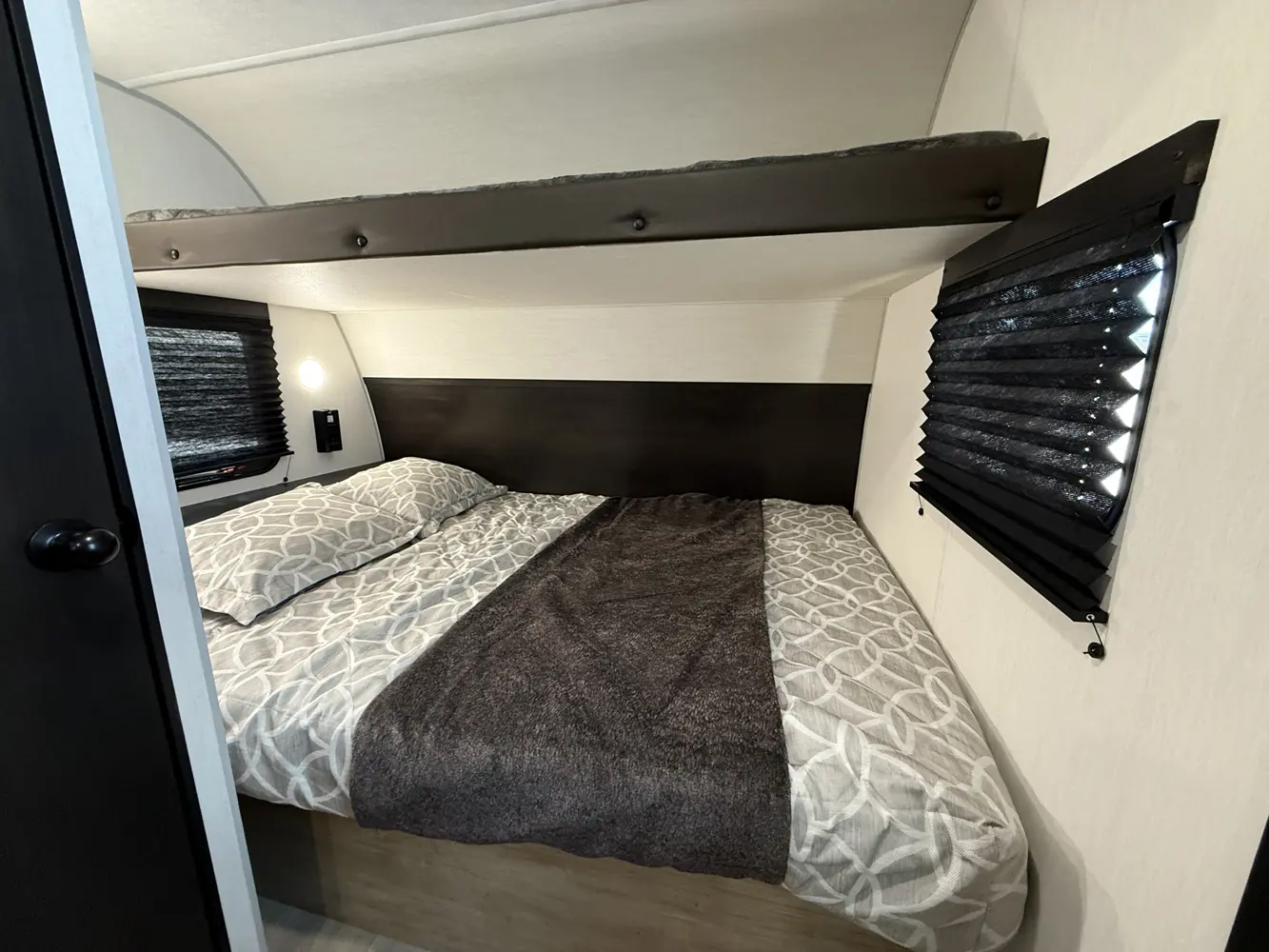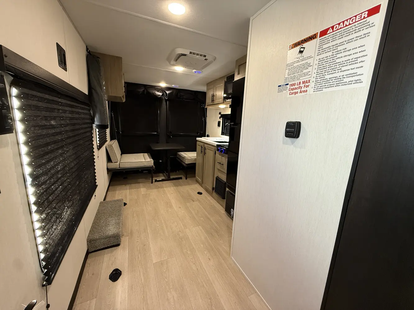 The 18RJBW is what a small toy hauler should be with the right combination of size, weight, and storage capacity for your toys. A modern chef’s kitchen, dinette area, queen size bed with overhead bunk and functional bath highlight the interior of this unit. On the exterior the exclusive Pup patio system will give you a great elevated seating area. As with all Pups, our outside awning area is second to none. Entertain guests with our outside entertainment area with speakers, and TV bracket.